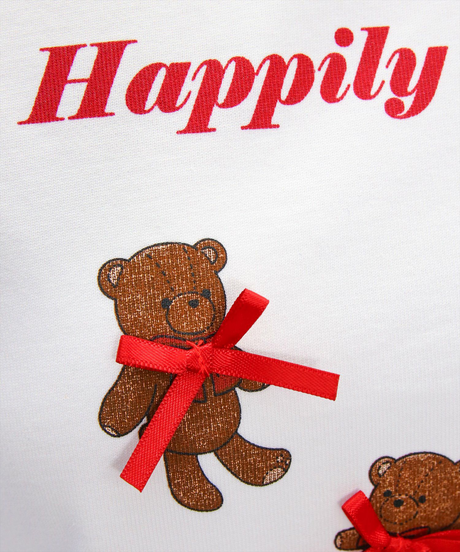 女の子らしい!クマプリントリボン付きTシャツ【デザイン】可愛らしいクマやロゴがプリントされた甘めなTシャツです。さらに立体感のあるリボンで、顔周りが華やかになります!インでもアウトでもご着用いただける程よい丈感です♪【コーディネート】ミニスカート合わせで甘め可愛いコーデに仕上がります!デニムパンツ合わせでカジュアルなコーデにも◎