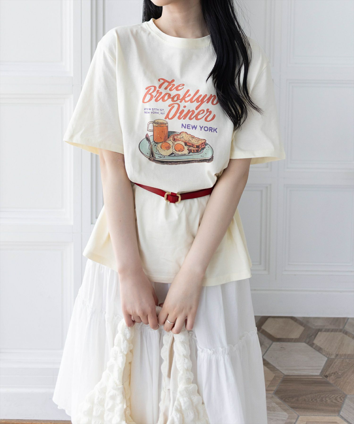 ポップでキュートな半袖Tシャツが登場!グラフィックプリントTシャツ【デザイン】目を惹くキャッチーなイラストがポイント♪程よいサイズ感ですっきり着こなせるアイテムです。カラーは合わせやすいホワイト、夏らしいイエロー、こなれ感がでるブラウンの3色展開です!【コーディネート】定番のデニムでカジュアルスタイルはもちろん、ミニスカートに合わせてフレンチガーリースタイルもおすすめです◎