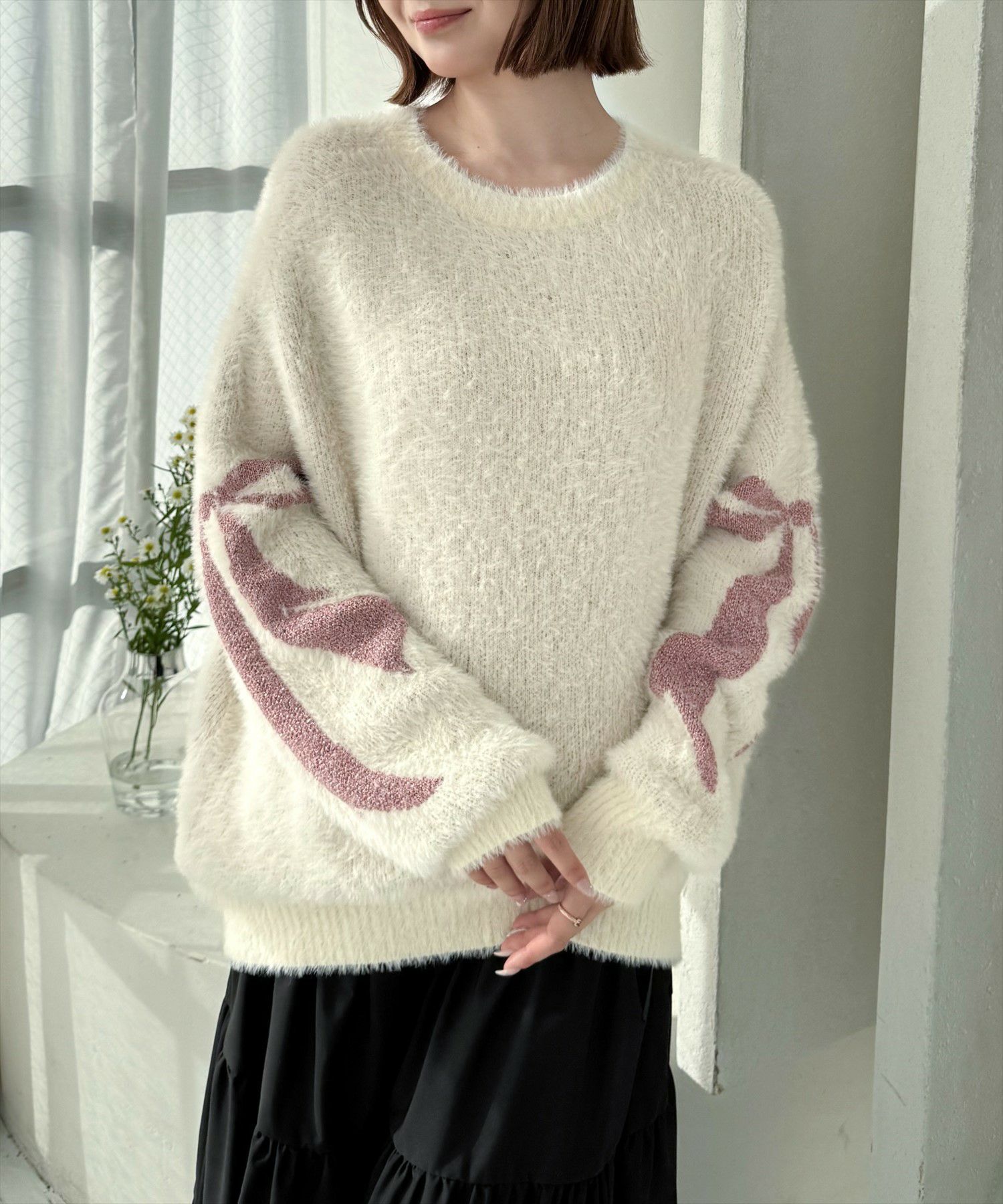 clear 袖リボン付きラメフェザーニットトップス [CL8867]