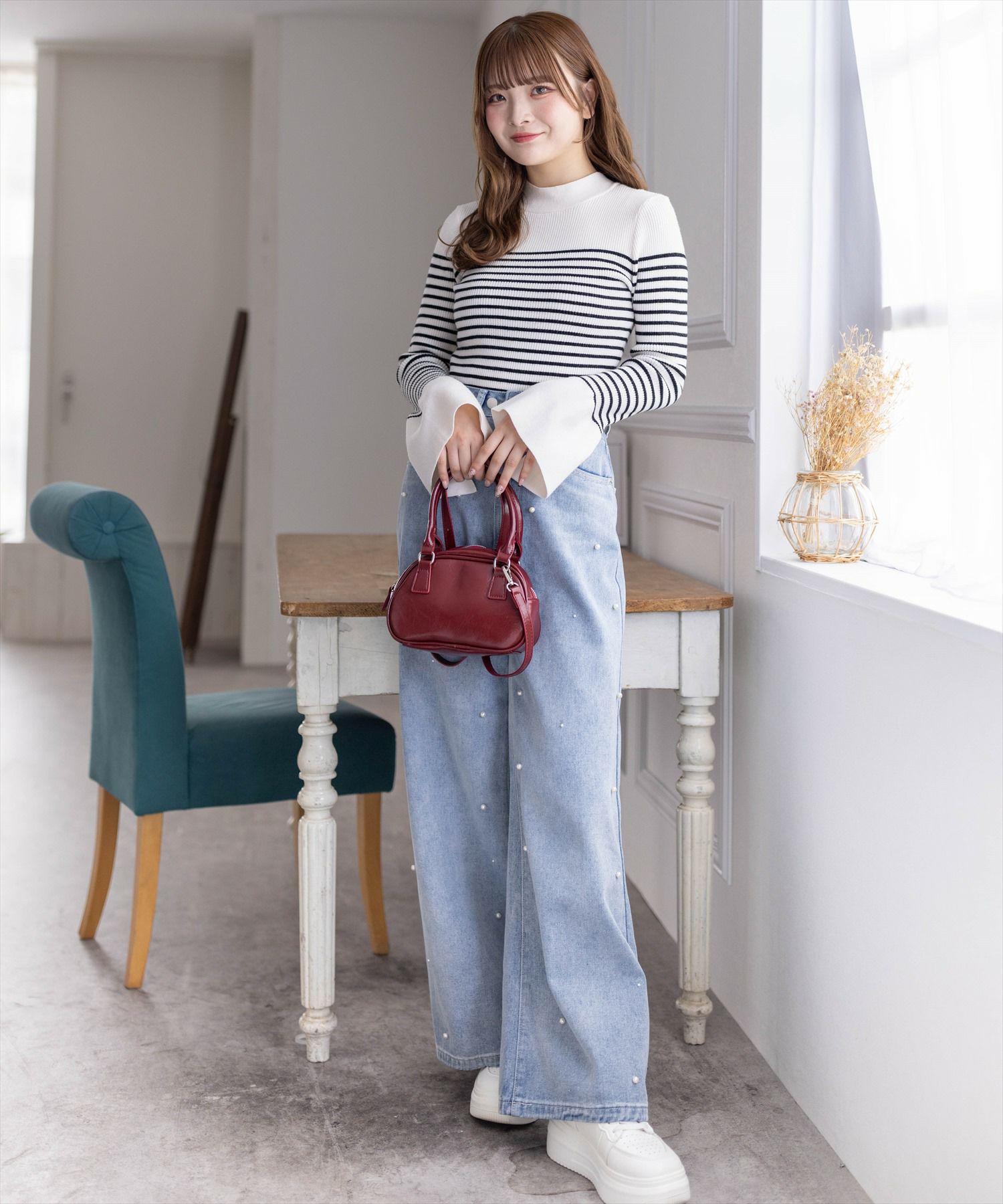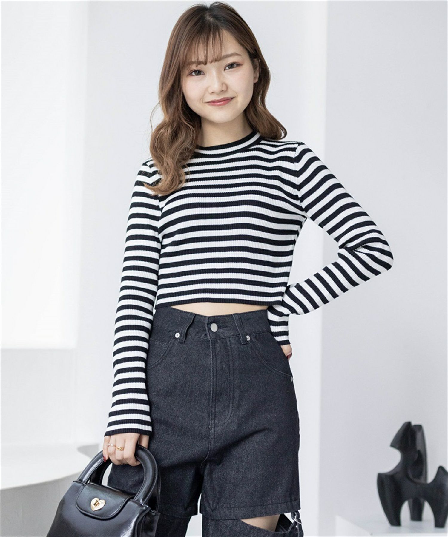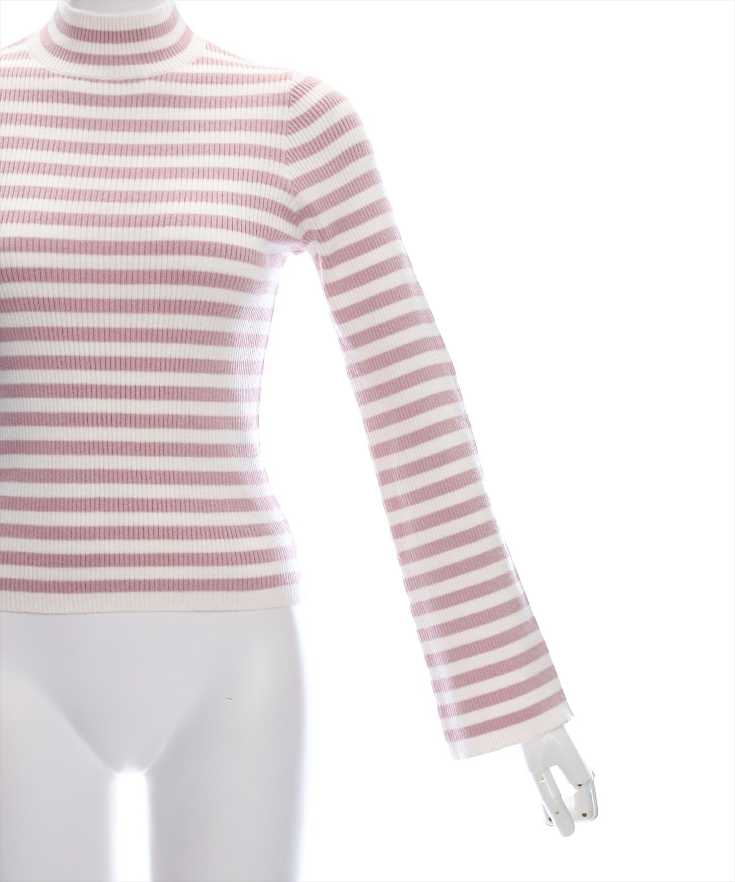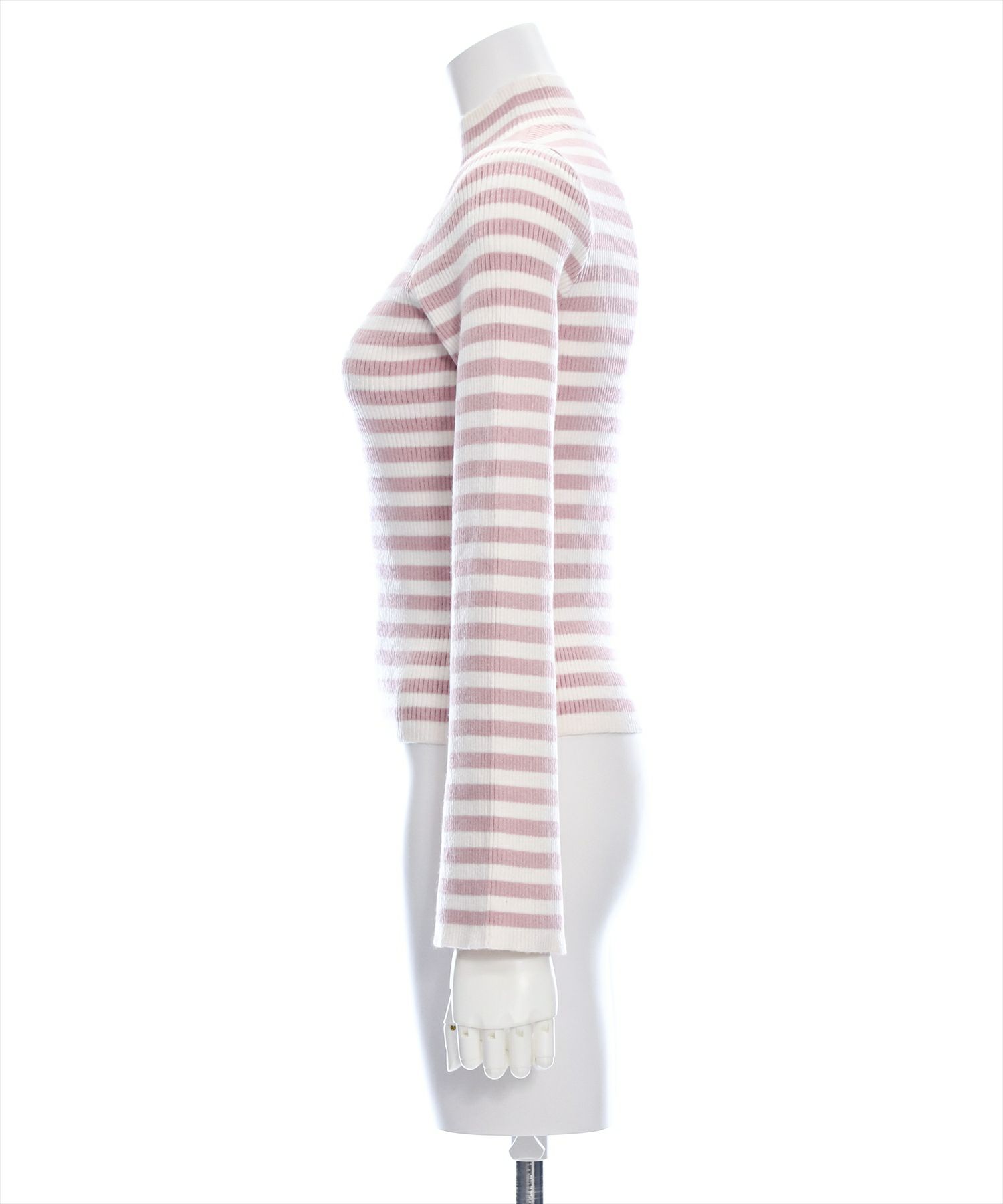 clear フレアスリーブハイネックボーダーニットトップス[CL8389]