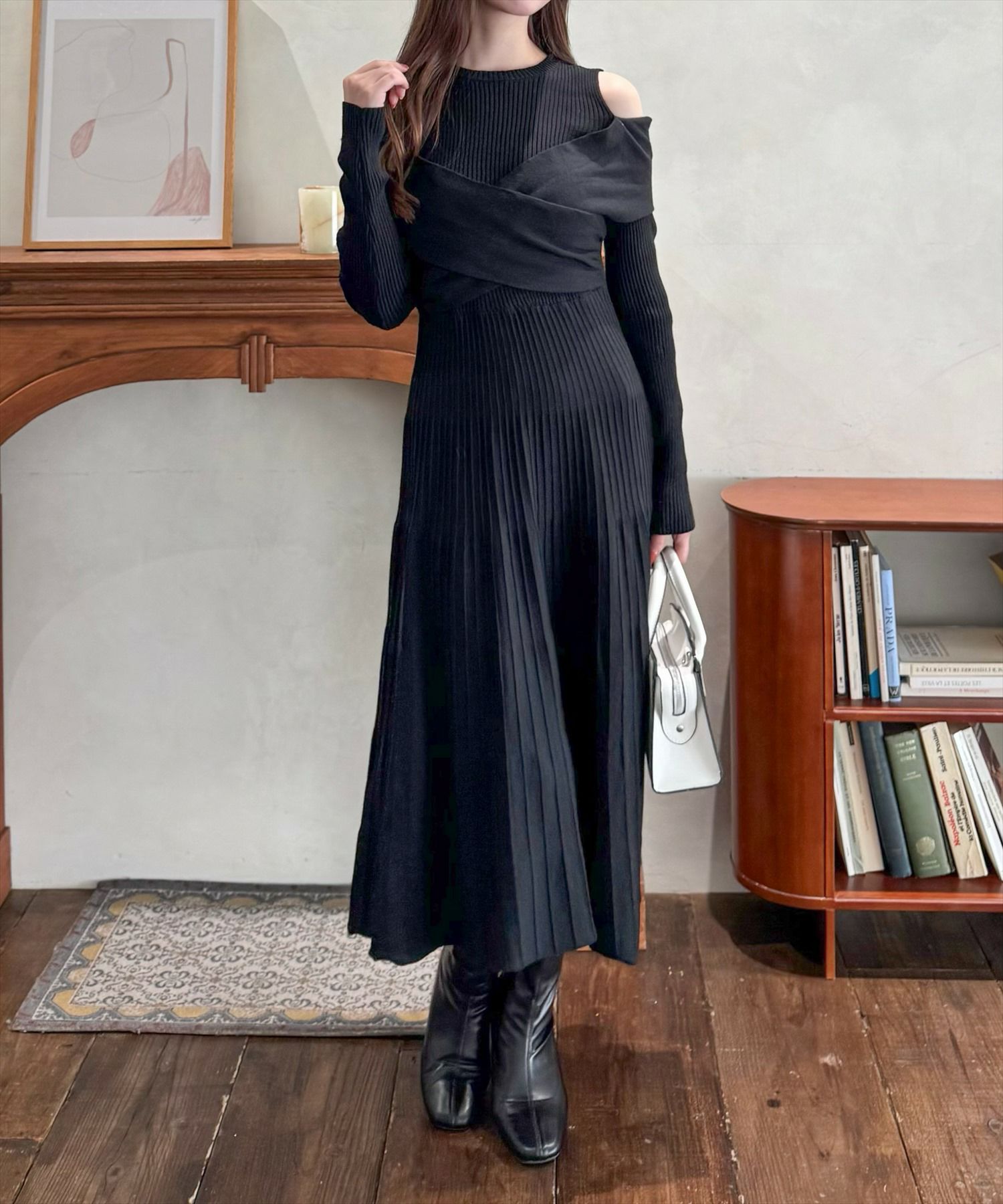 clear オープンショルダーフレアロングニットワンピース[CL8820]