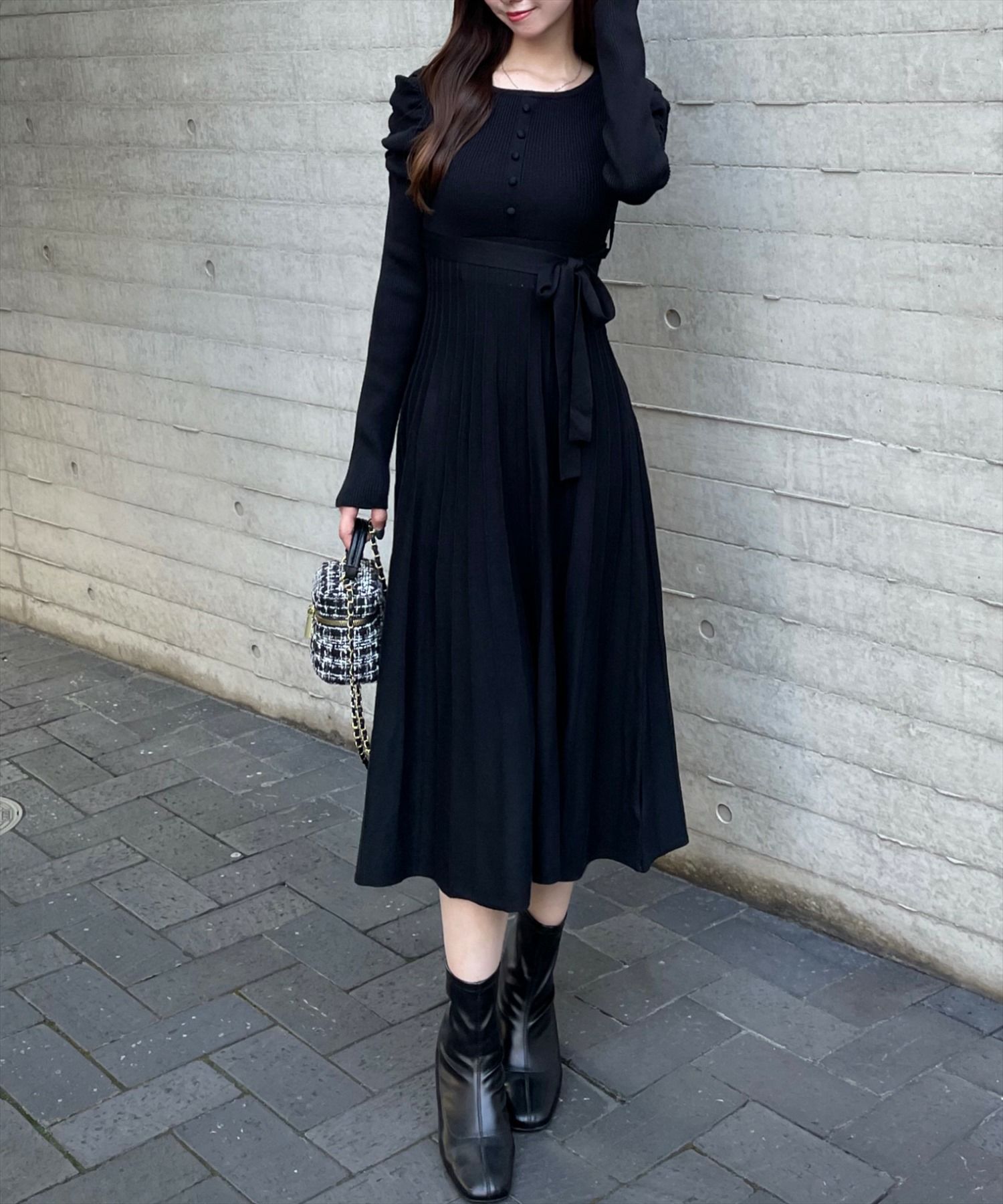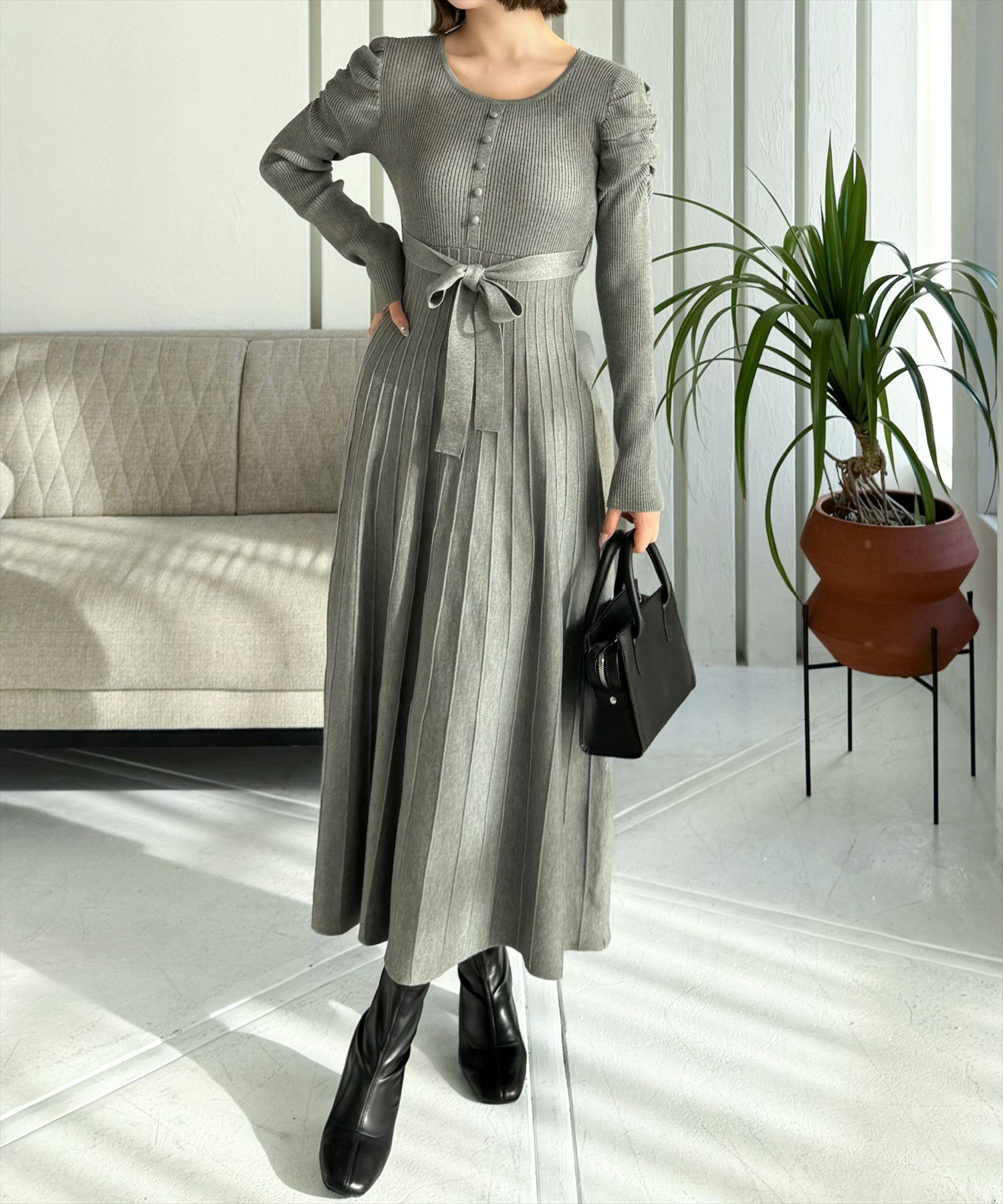 clear ウエストリボンニットプリーツワンピース[CL8672]