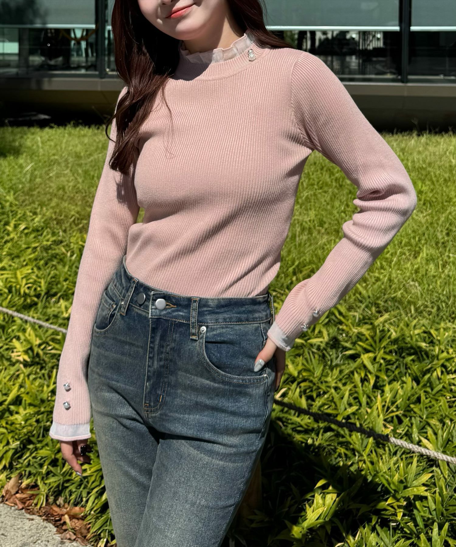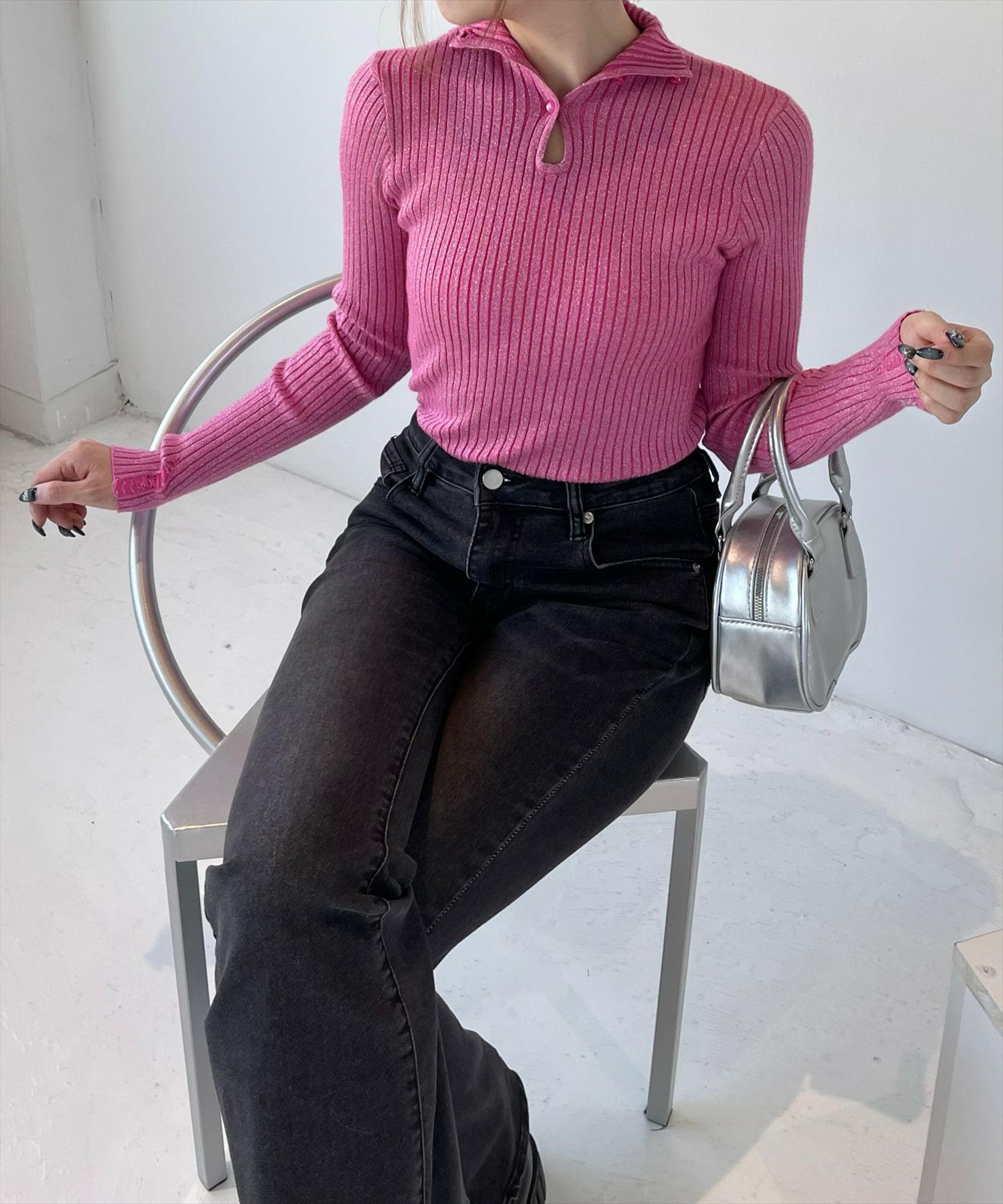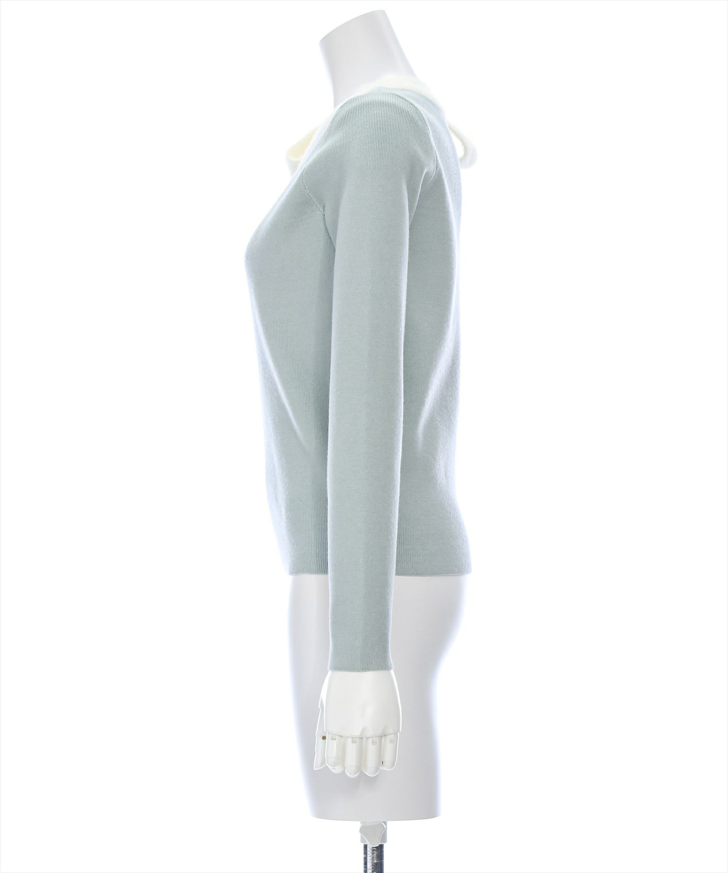 clear 袖パールフェザー配色襟付きニットトップス[CL8428]