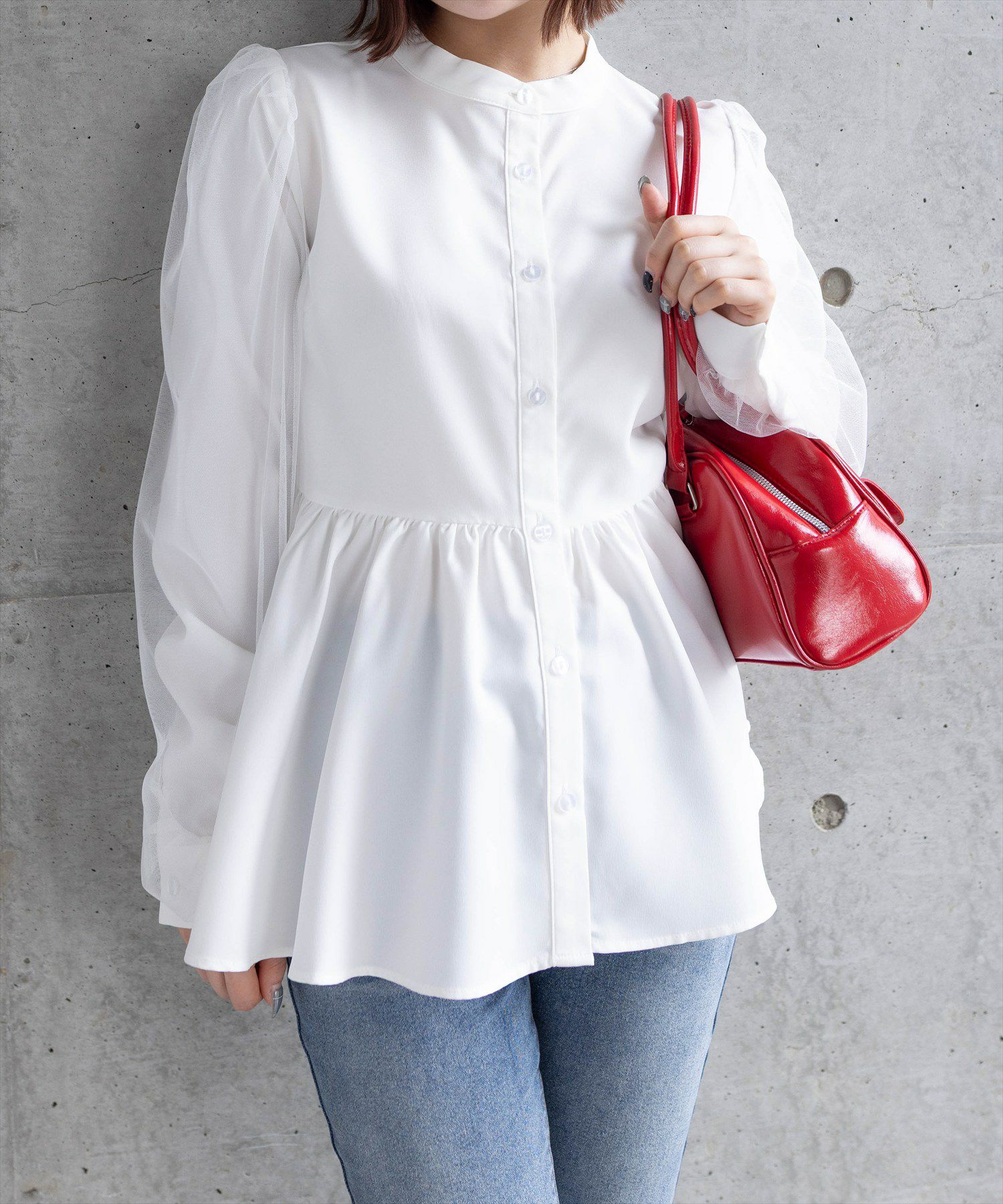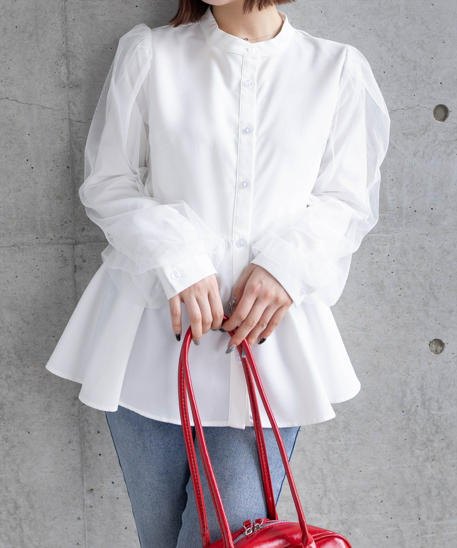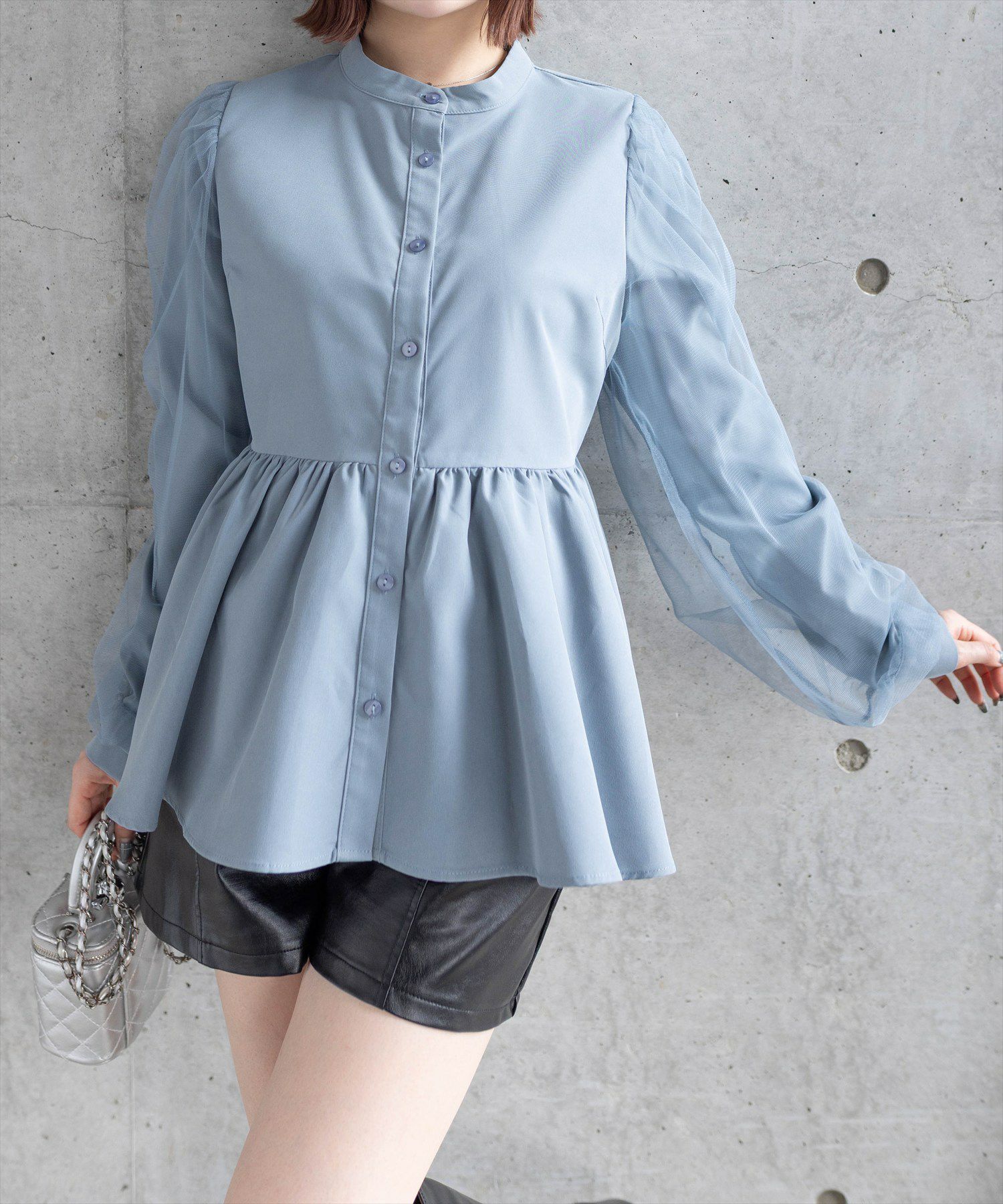 clear 長袖チュールドッキングペプラムブラウス[CL8756]