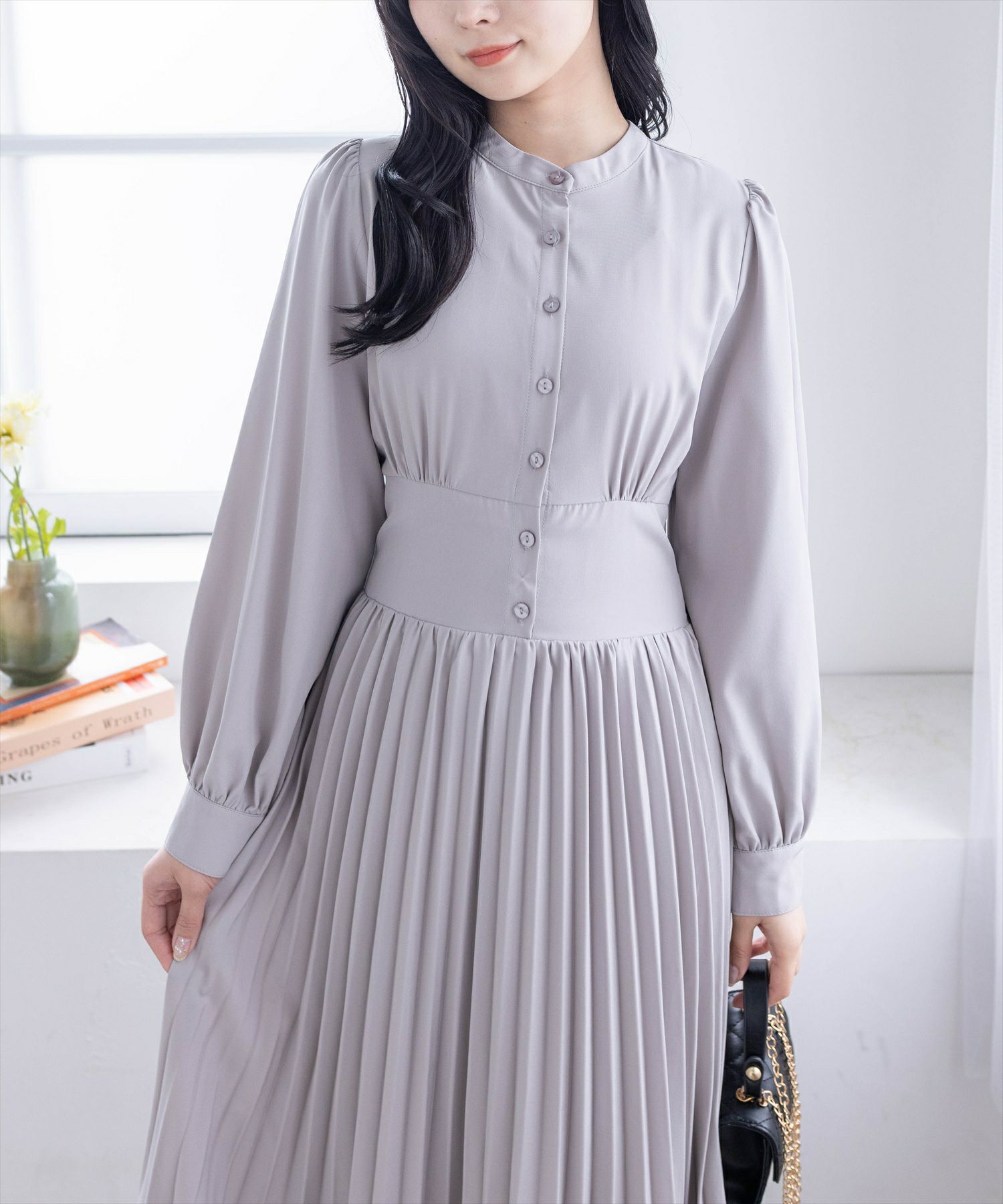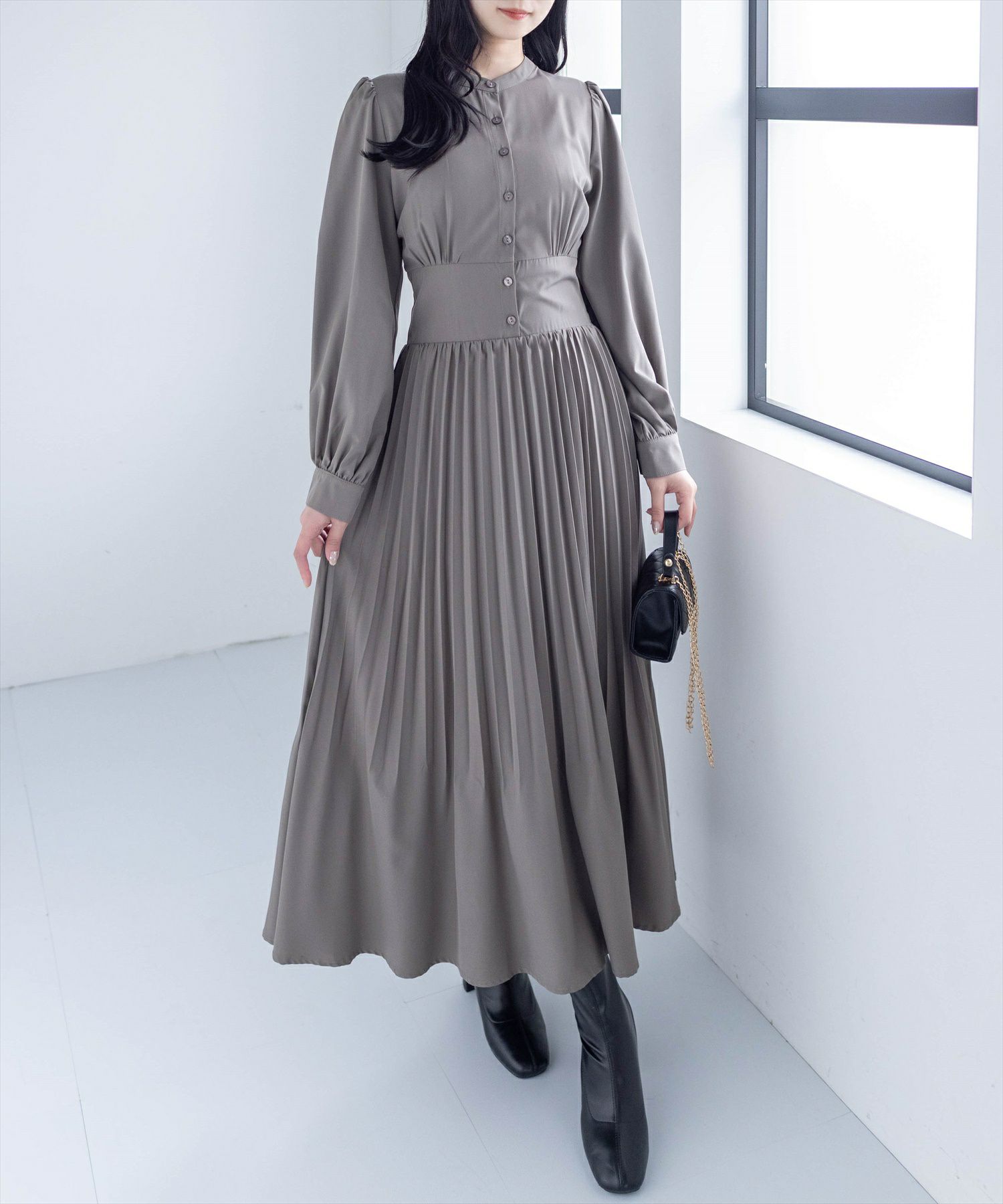 clear ウエスト切替消しプリーツ長袖ロングワンピース[CL8809]