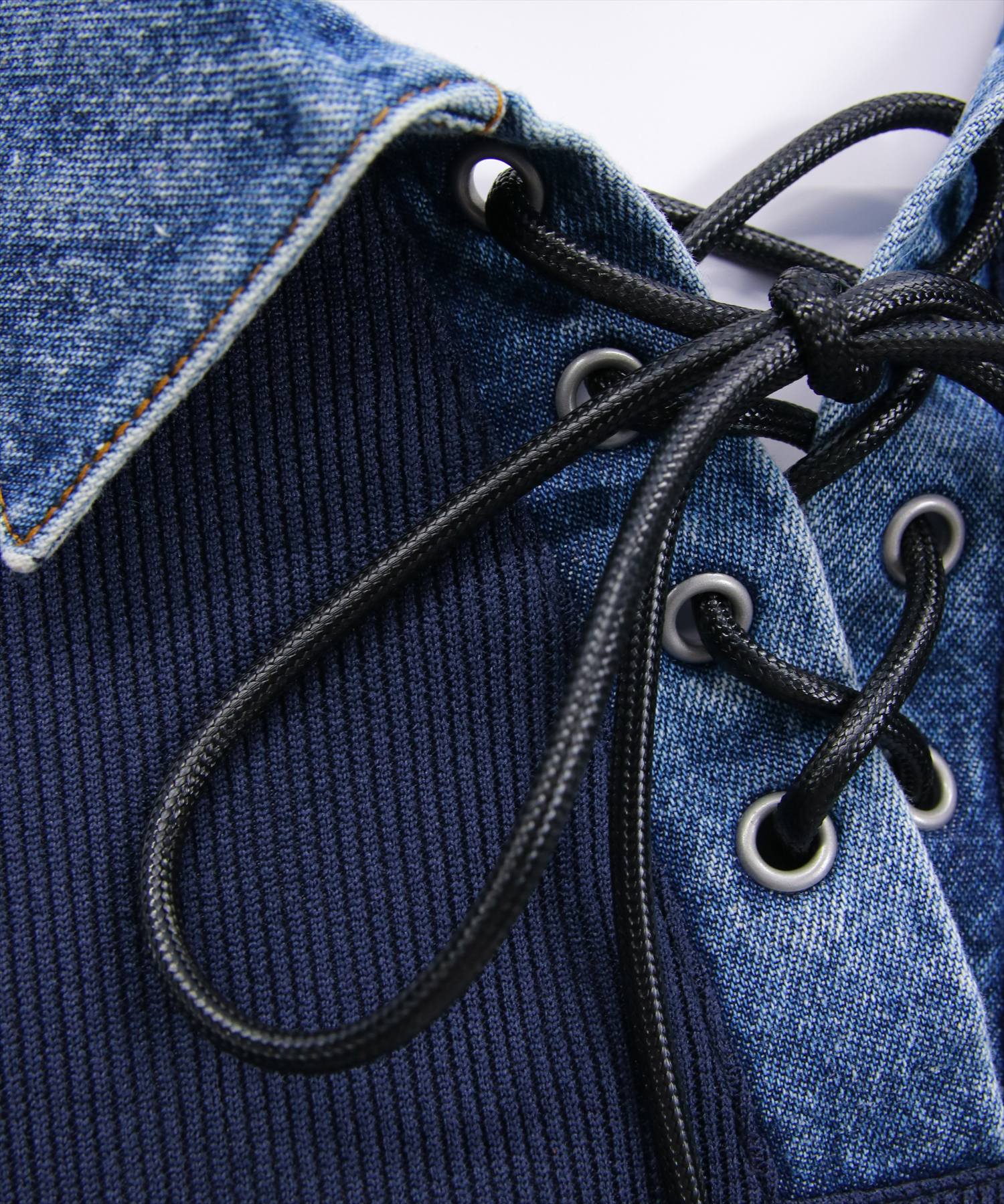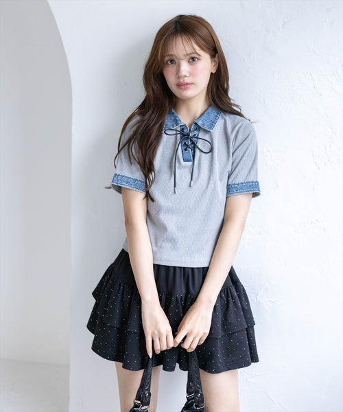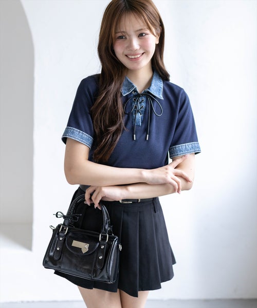 clear≪新作≫襟付デニム切替スピンドルニットトップス[CL9757]