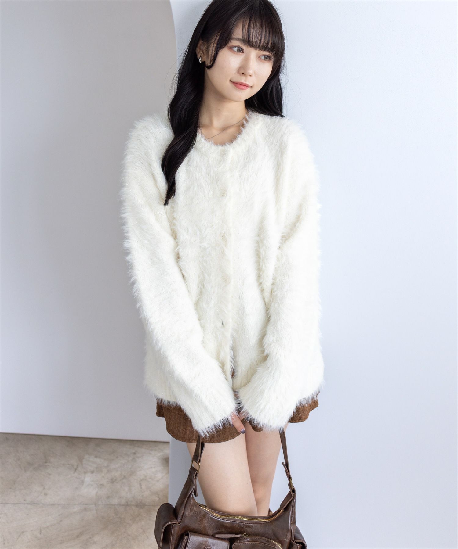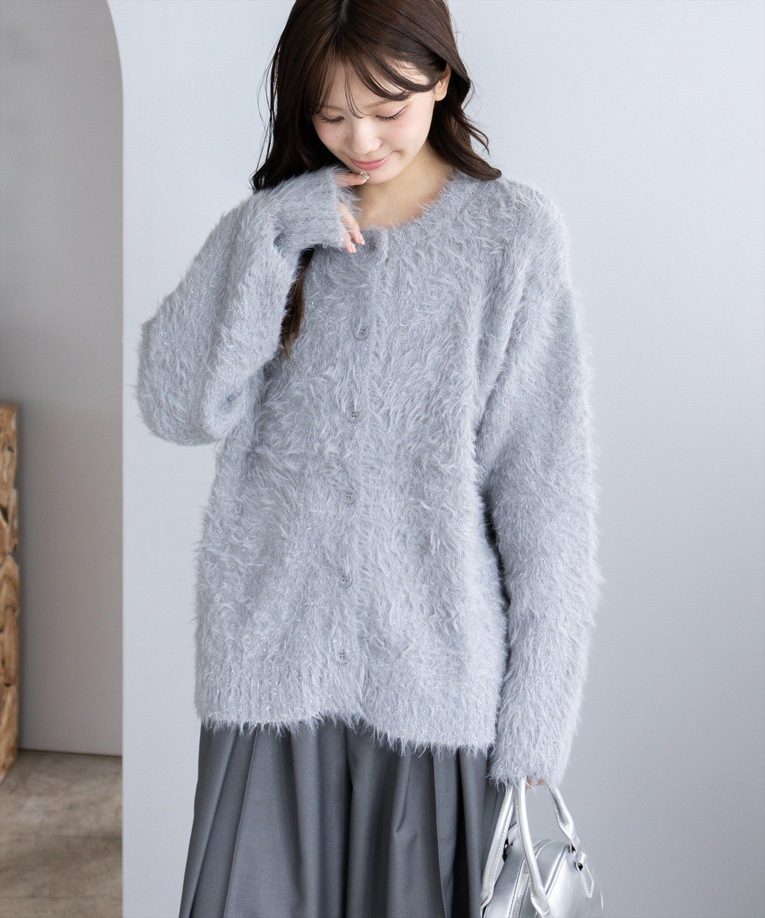 女性らしさを引き立てる!グリッターフェザーニットロングカーディガン【デザイン】ふわっとした質感と繊細なラメの輝きが絶妙にマッチしたロングカーディガン。光の加減でさりげなく輝き、女性らしいムードを引き立てます。ゆったりとしたシルエットで、羽織るだけで存在感のあるスタイリングが完成する一枚です。【コーディネート】フレアスカートやミニスカートと合わせればガーリーな印象に◎シンプルなボトムと合わせて、主役トップスとしてコーデを引き立てるのもおすすめです!
