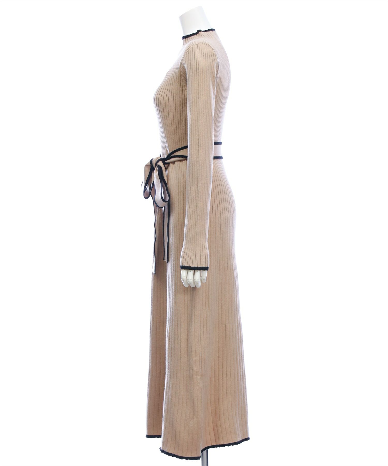 すっきりとしたリブ編みで仕立てたロング丈のニットワンピースです。ウエストには配色リボンをあしらい、自然にスタイルアップを叶えるデザインに仕上げました。裾にかけて広がるフレアシルエットが、歩くたびに上品な揺れ感を演出します。