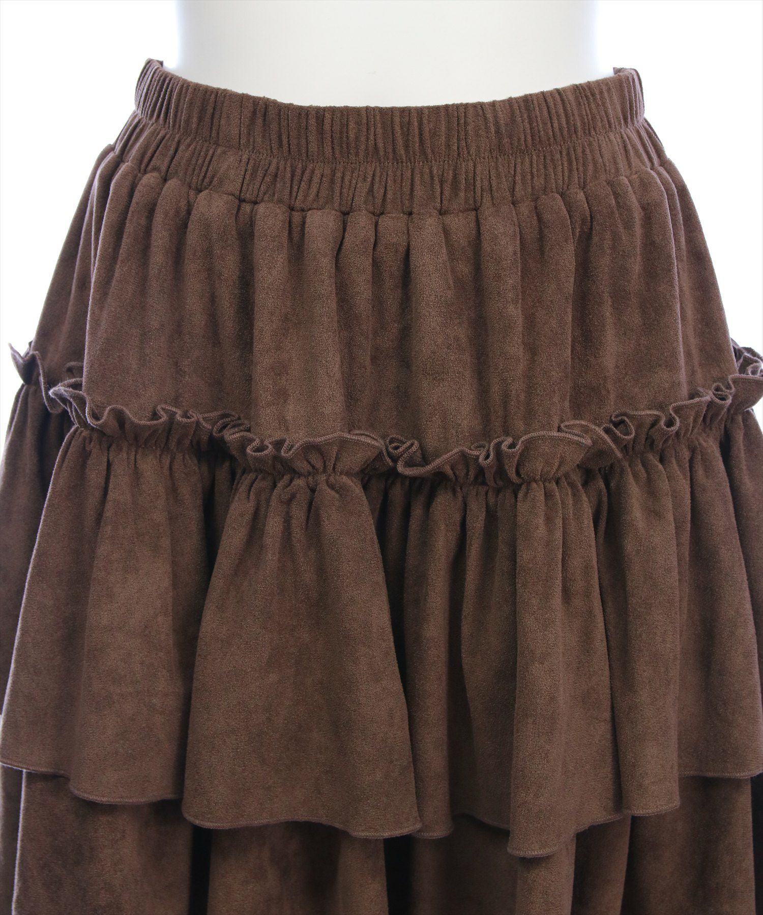 立体感のあるティアードフリルが存在感たっぷり!スエード調のやわらかい素材で、秋冬らしいムードも演出してくれます。ウエストはゴム仕様だから、着脱もらくちん&ストレスフリー◎