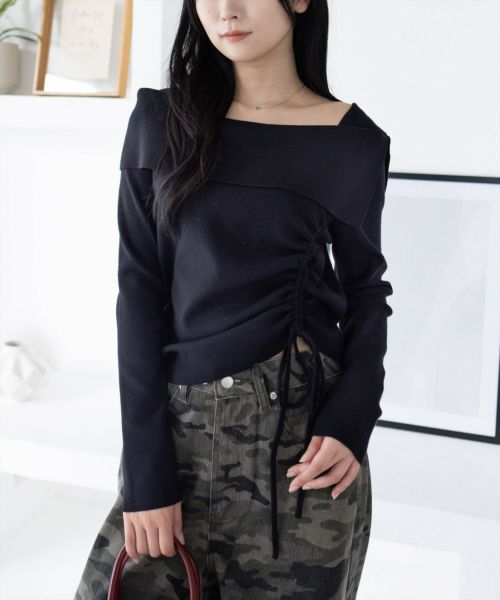 人気のサイドドロストデザインが、長袖ニットトップスになって登場。ウエスト部分のドロストでシルエットを調整でき、トレンド感のあるスタイルが楽しめます。首元が広めなのですっきり見せてくれ、女性らしさを引き立てる一枚です。
