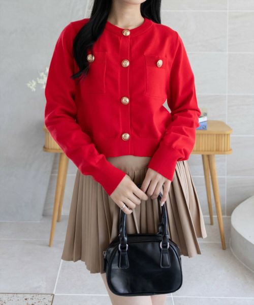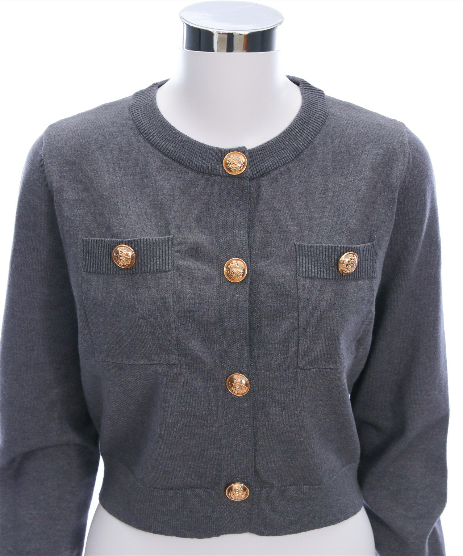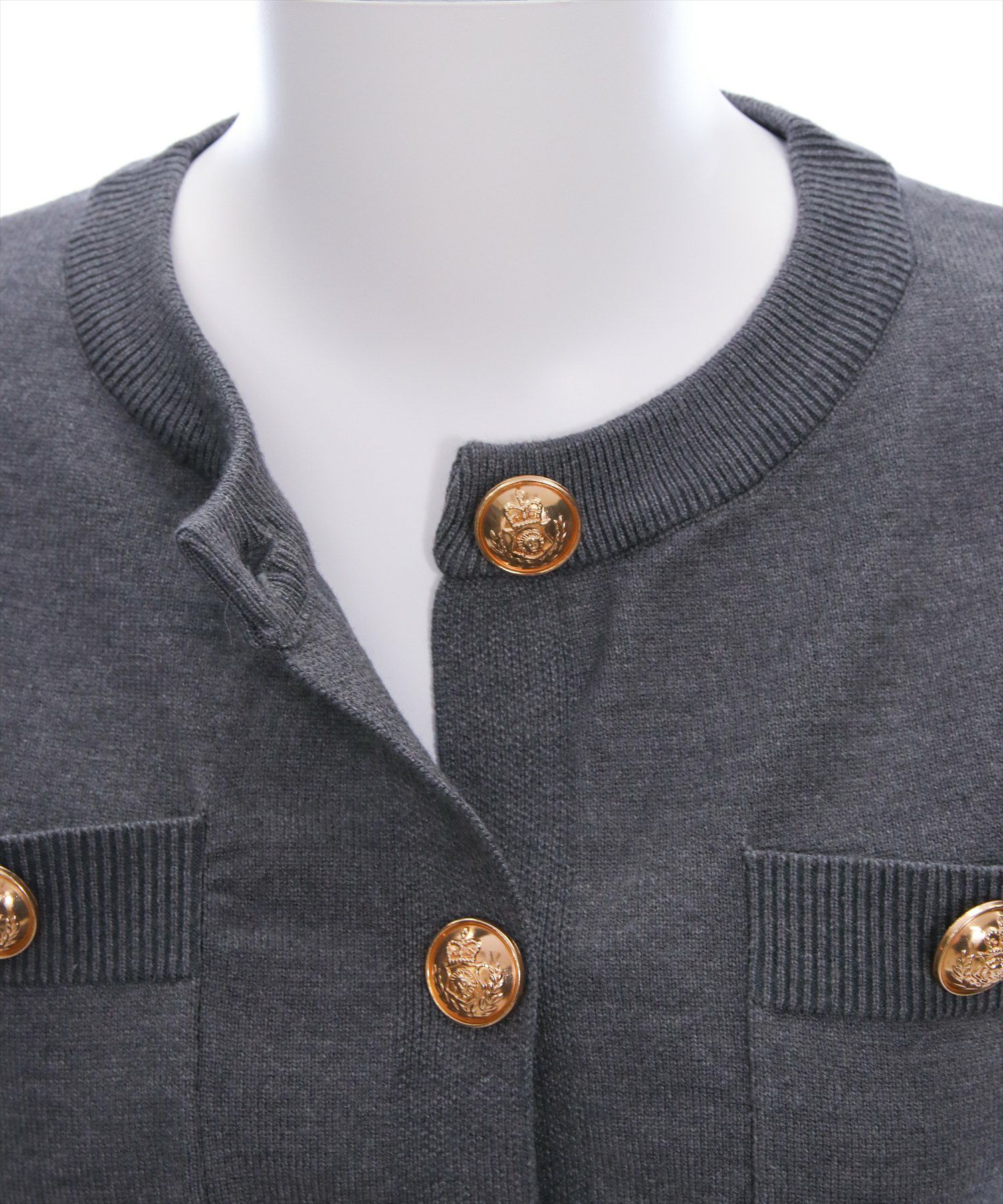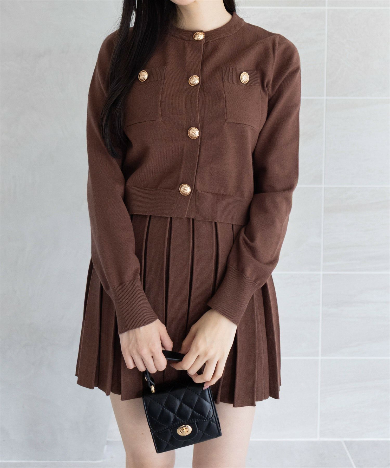 オンにもオフにも万能!ゴールドボタンニットカーディガン(セット可)【デザイン】上品なゴールドボタンが目を引く、クラシカルムード漂うカーディガン。コンパクトな丈感で、スタイルアップも叶えてくれる優秀アイテムです♪フロントのポケットがアクセントになって、きちんと感も◎【コーディネート】セットアイテムのスカート(商品番号:203B1-133799/ニットプリーツミニスカート(セット可))と合わせていただくのがおすすめ◎羽織としてもトップスとしても使える、着回し力抜群の一枚です!