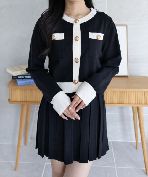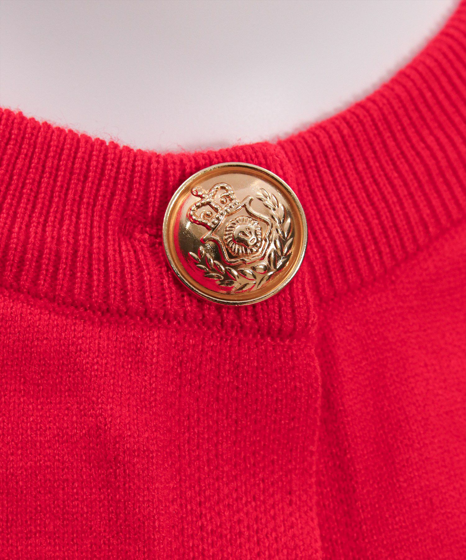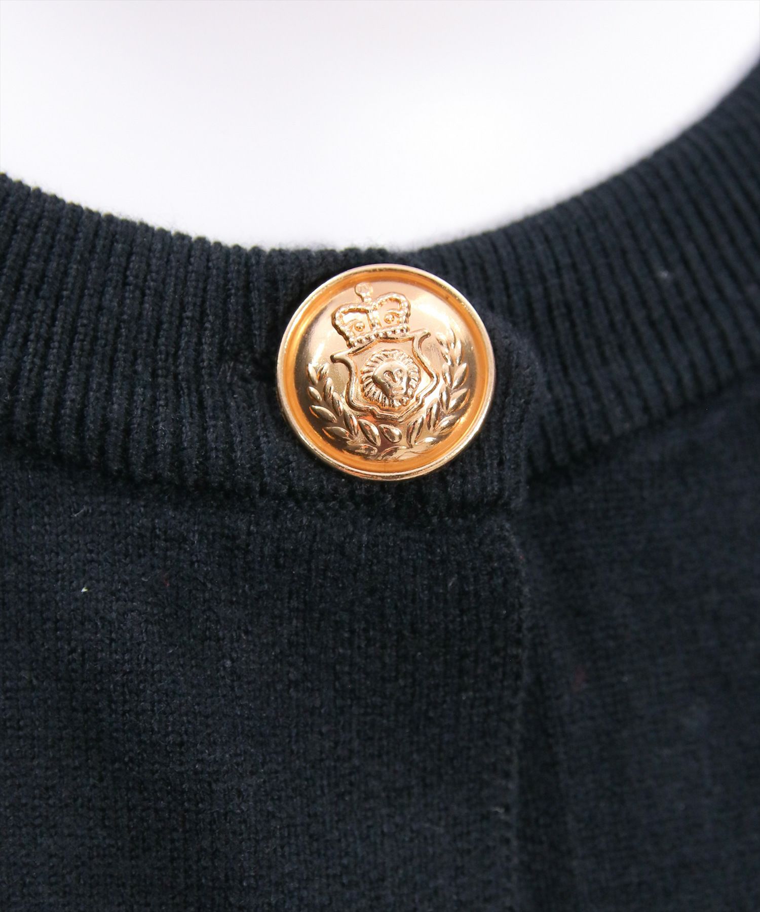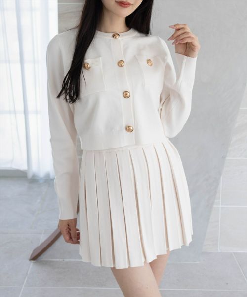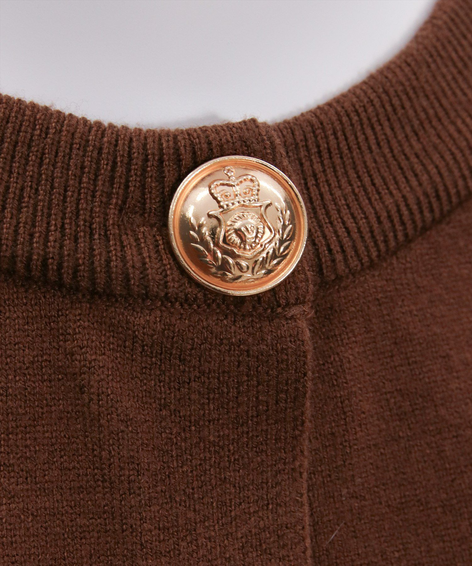 オンにもオフにも万能!ゴールドボタンニットカーディガン(セット可)【デザイン】上品なゴールドボタンが目を引く、クラシカルムード漂うカーディガン。コンパクトな丈感で、スタイルアップも叶えてくれる優秀アイテムです♪フロントのポケットがアクセントになって、きちんと感も◎【コーディネート】セットアイテムのスカート(商品番号:203B1-133799/ニットプリーツミニスカート(セット可))と合わせていただくのがおすすめ◎羽織としてもトップスとしても使える、着回し力抜群の一枚です!