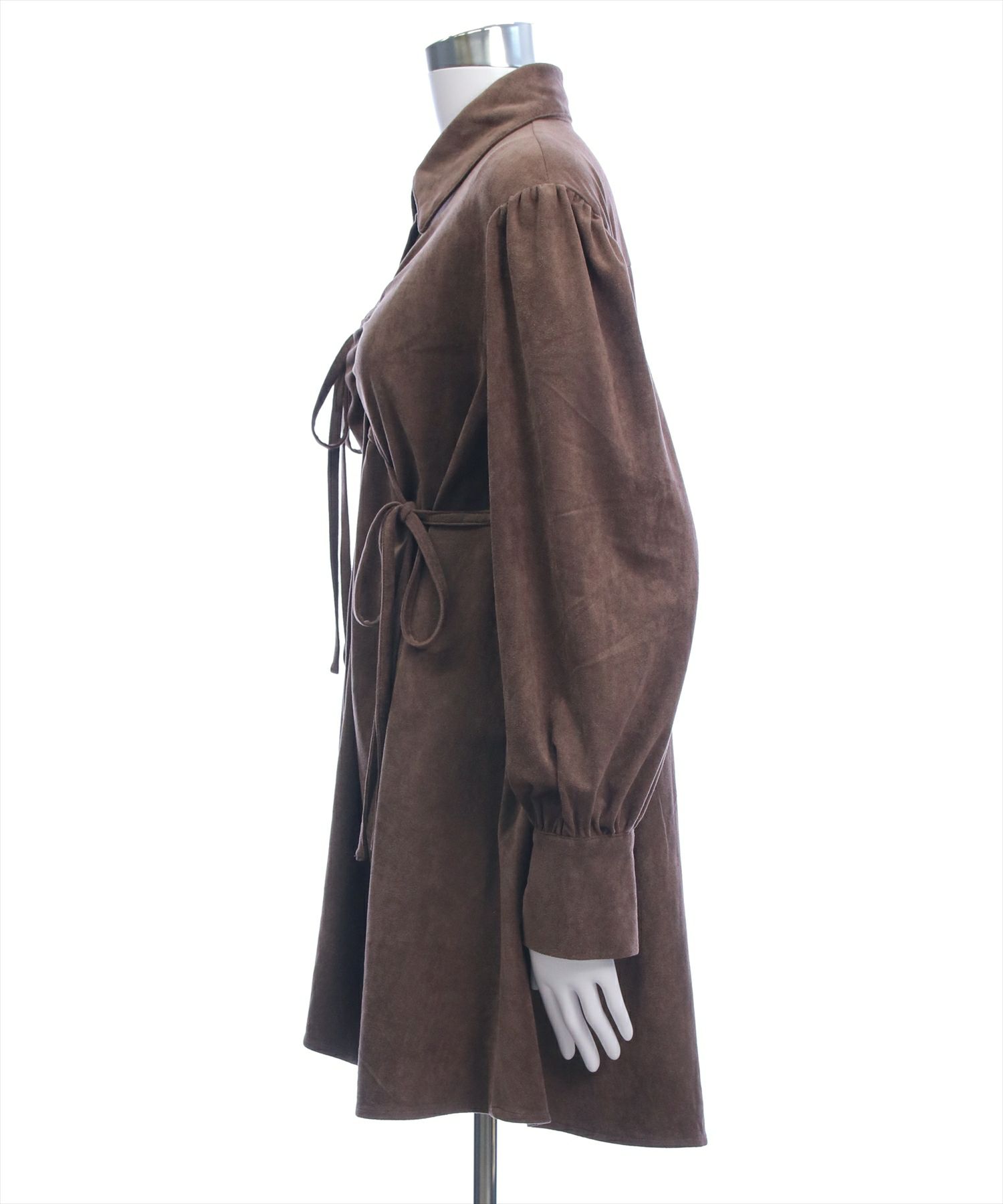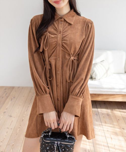 シーズンムード漂うフェイクスエード素材を使用した!リボンシャツワンピース。
