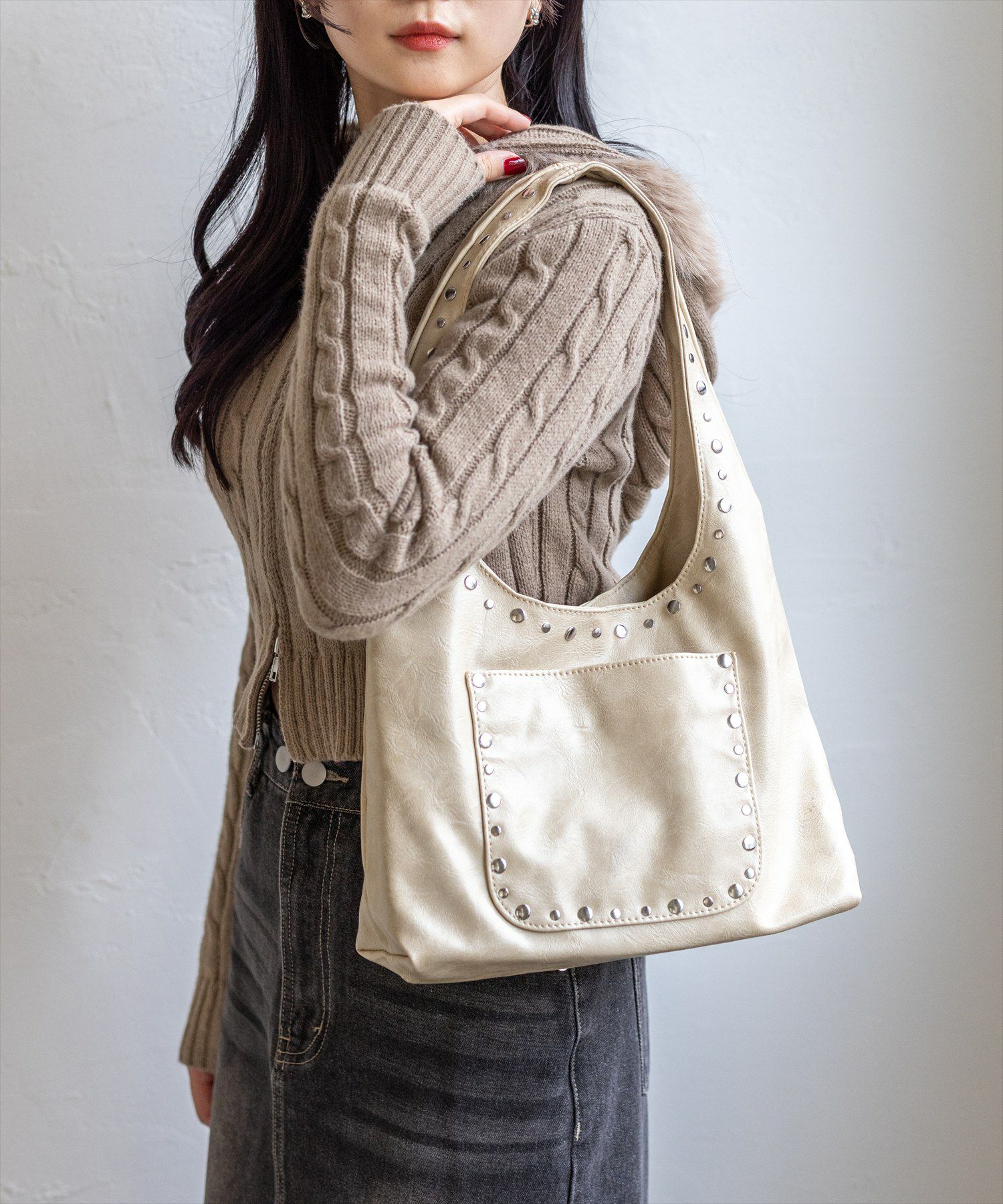 シンプル×エッジでこなれ感アップ!スタッズワンハンドルバッグ。トレンド感たっぷりのスタッズデザインが目を惹くワンハンドルバッグ。シンプルなフォルムにクールなアクセントを効かせ、カジュアルからモードまで幅広いコーデにマッチ♪肩掛けもしやすいサイズ感で、デイリー使いにぴったりです。