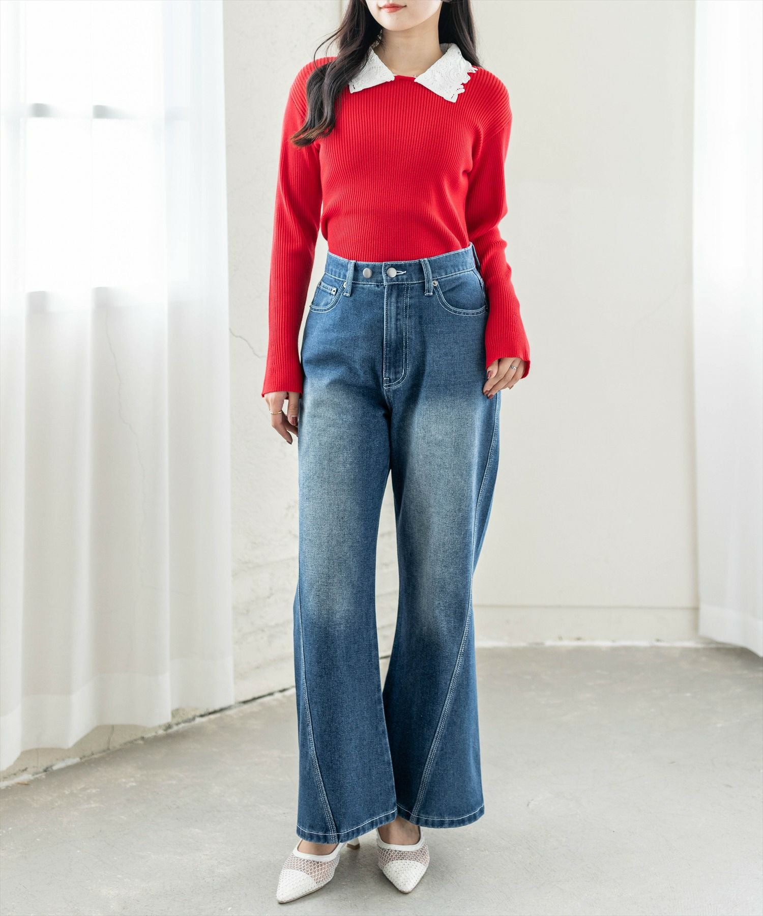 clear≪新作≫襟付デニム切替スピンドルニットトップス[CL9757]