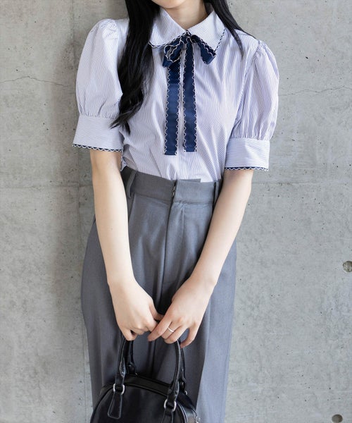 clear ピコレースリボン半袖ストライプブラウス[CL9251]