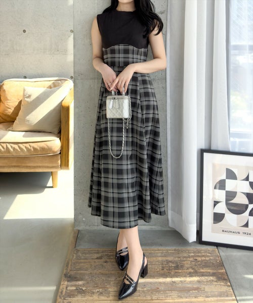 CLEAR BASIC チェック柄布帛ドッキングノースリーブワンピース[CL8948]