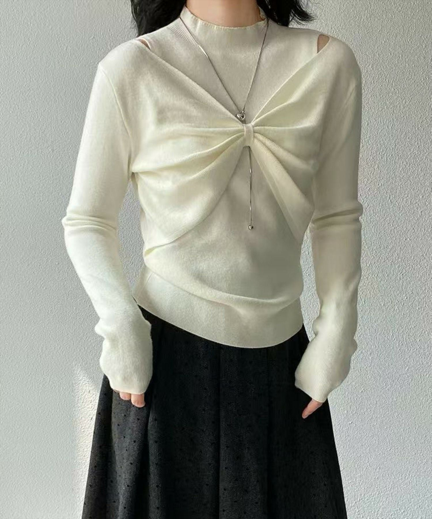 CLEAR BASIC オーガンジードッキングオープンショルダーニットトップス[CL9498]