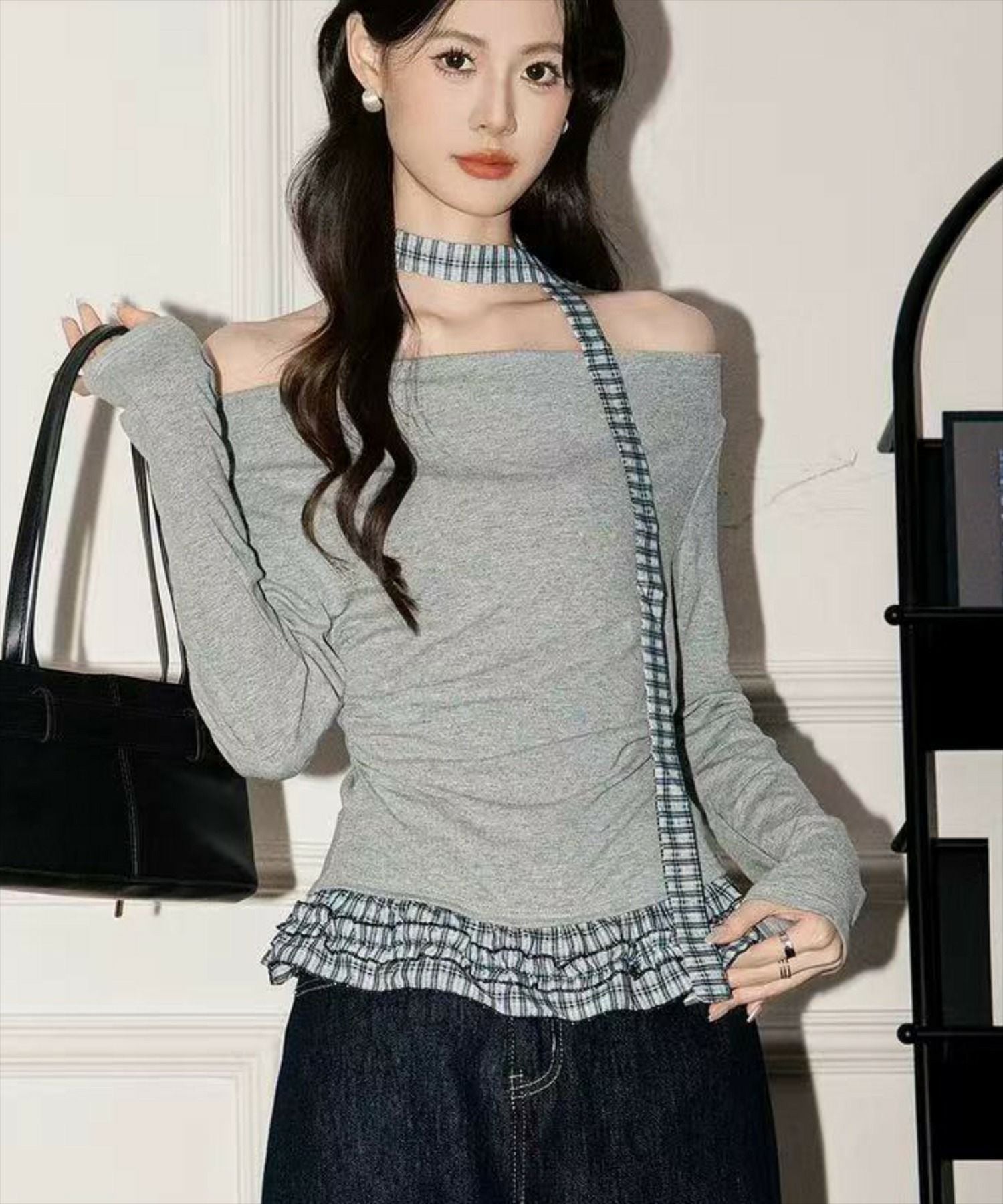 STAY MOTION≪WEB限定≫チェック柄ホルターネックオフショルダートップス[ST1045]