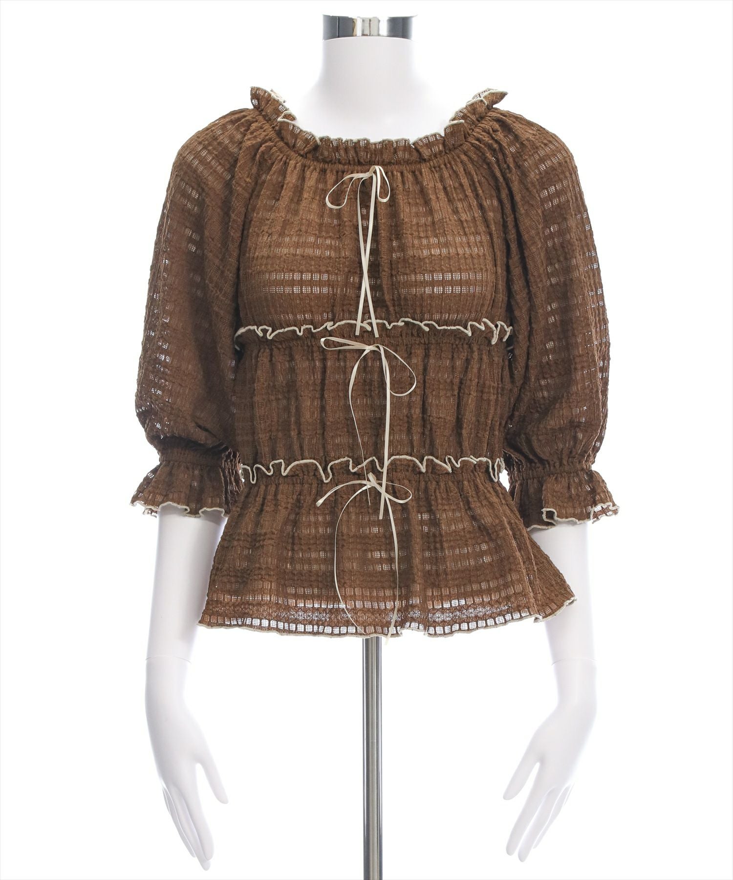 CLEAR BASIC バックレースアップ裾タック七分袖ブラウス[CL9417]