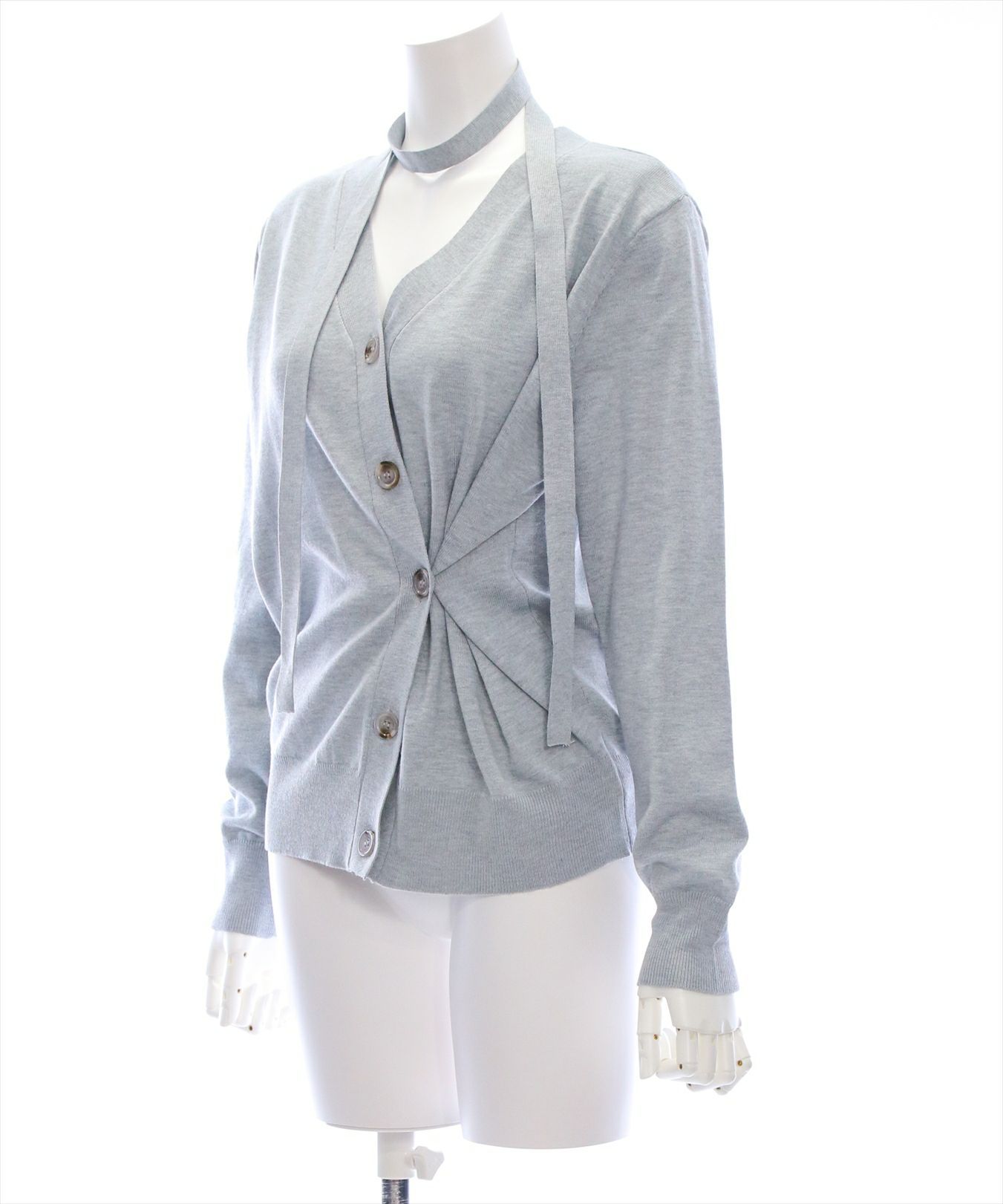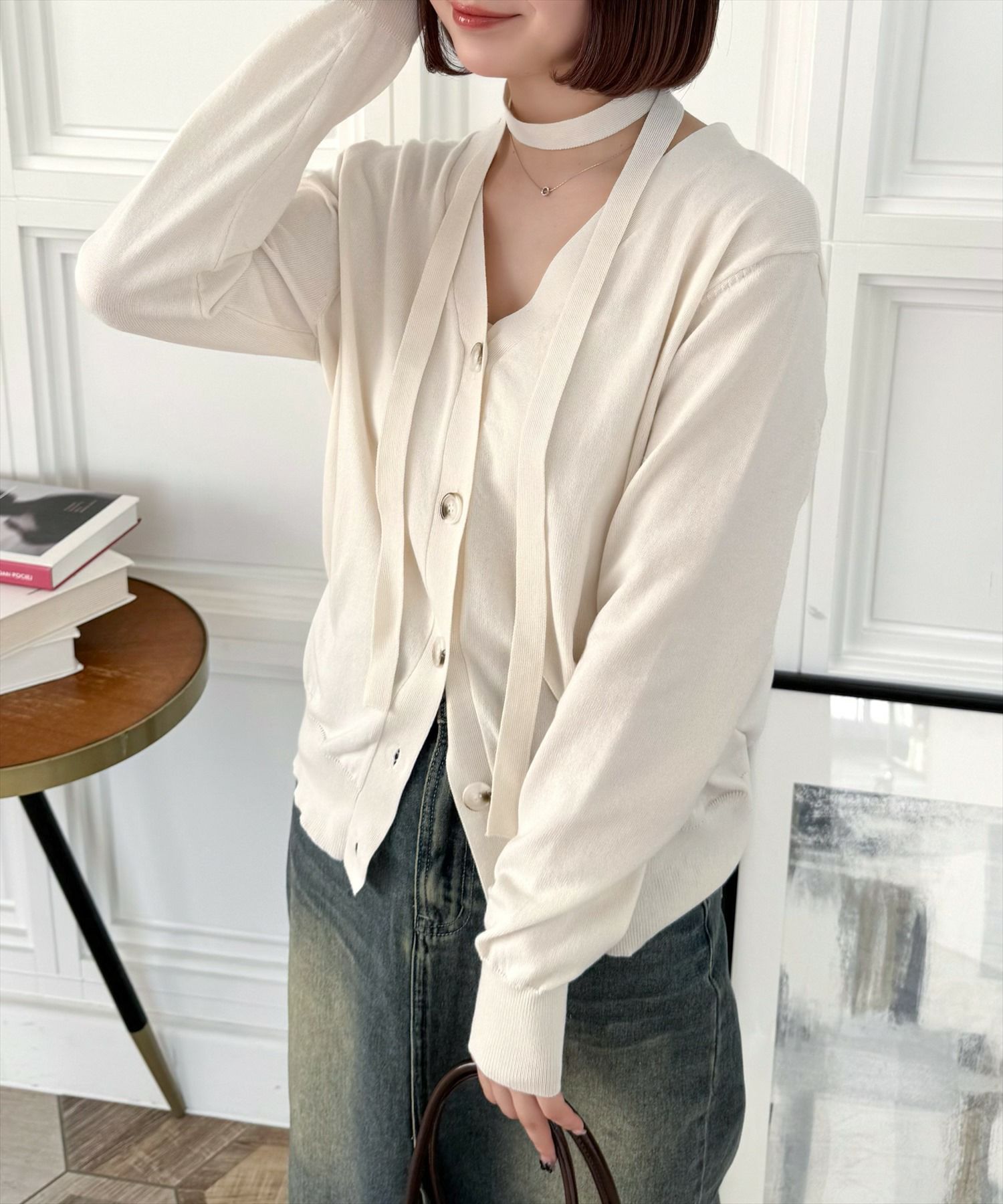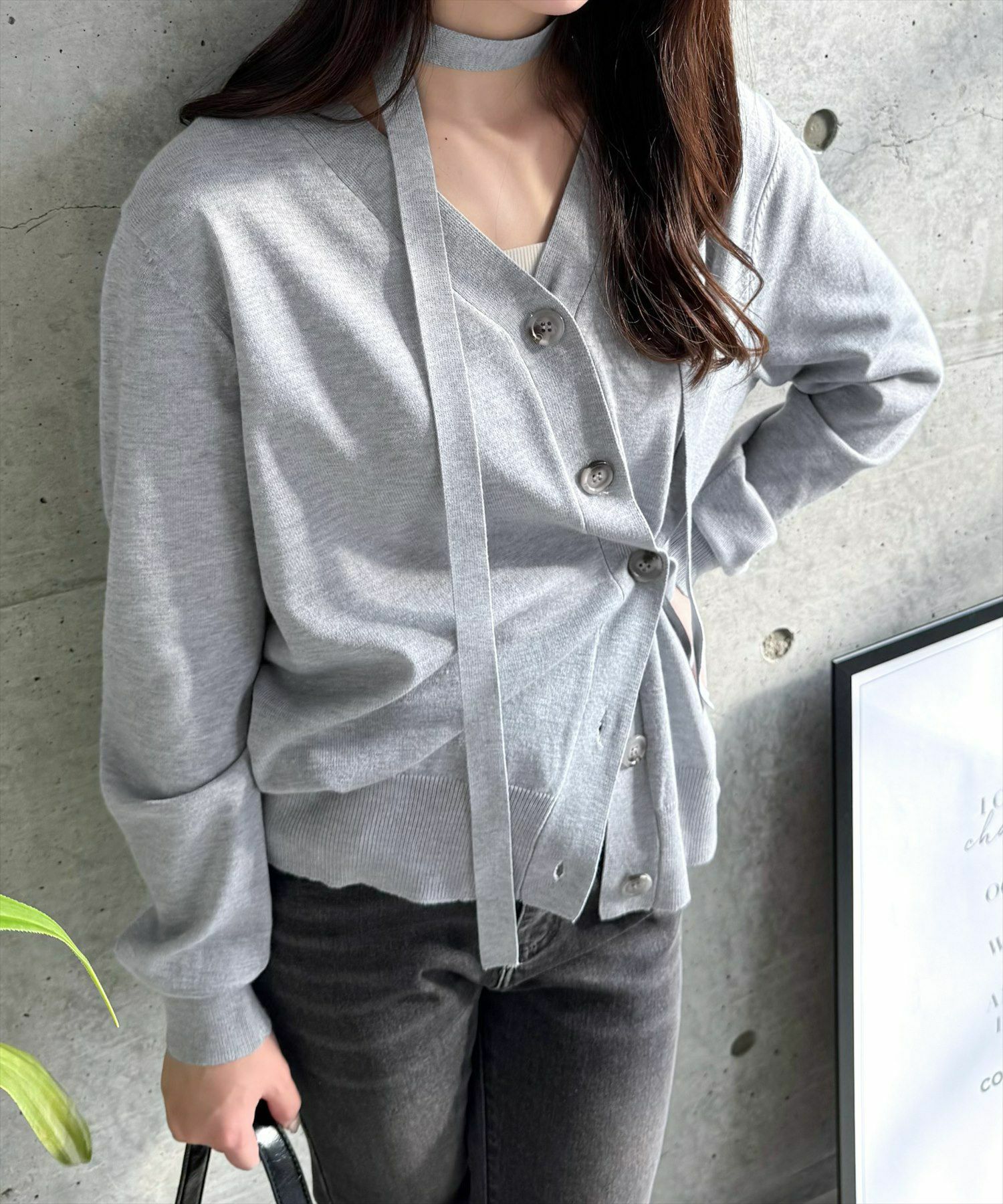 大人可愛い!チョーカー付きアシンメトリーニットカーディガン【デザイン】トレンド感のあるチョーカー付きのニットカーディガンです。アシンメトリーなボタンでデザイン性があります!さらにVネックなのでデコルテラインの華奢見えが叶います♪【コーディネート】どんなボトムスとも相性抜群です!デニムパンツ合わせでカジュアルにも、ミニスカート合わせで甘めにも