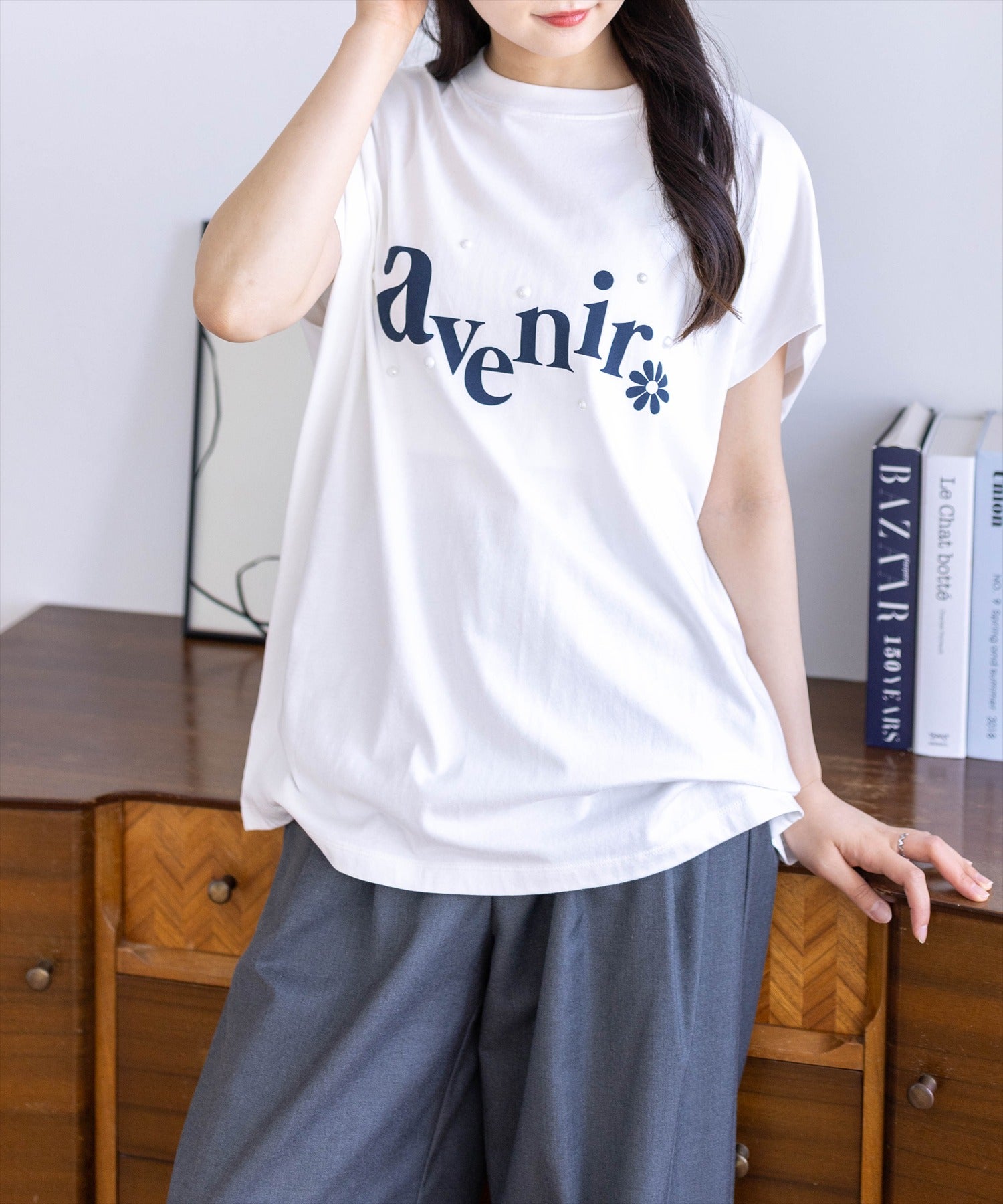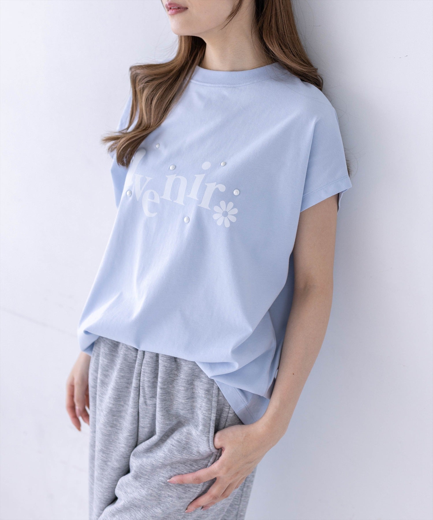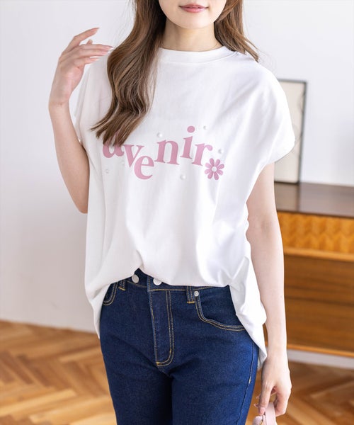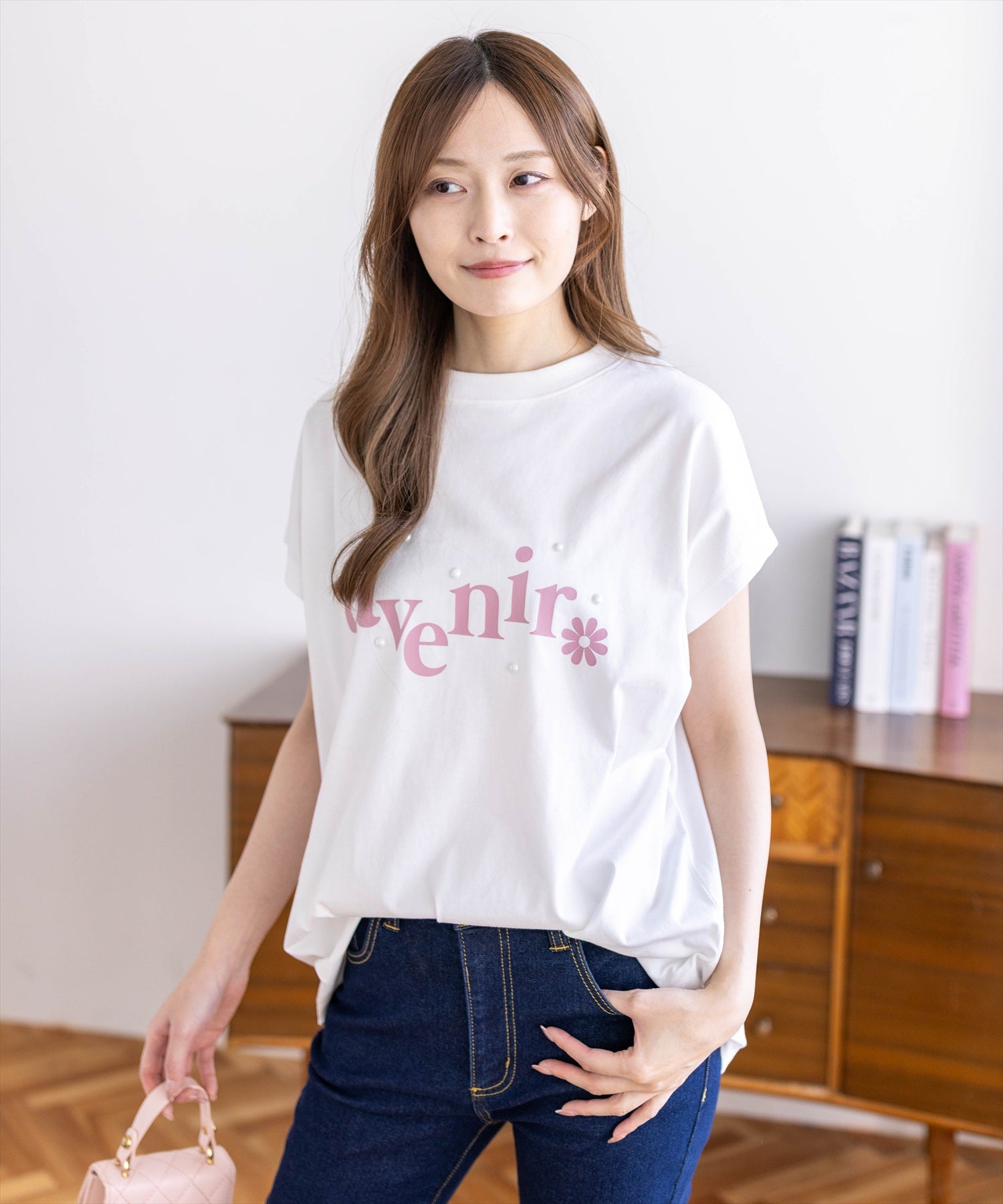 抜け感と上品さをこの一枚で!フレンチスリーブパール付きプリントロゴTシャツ
