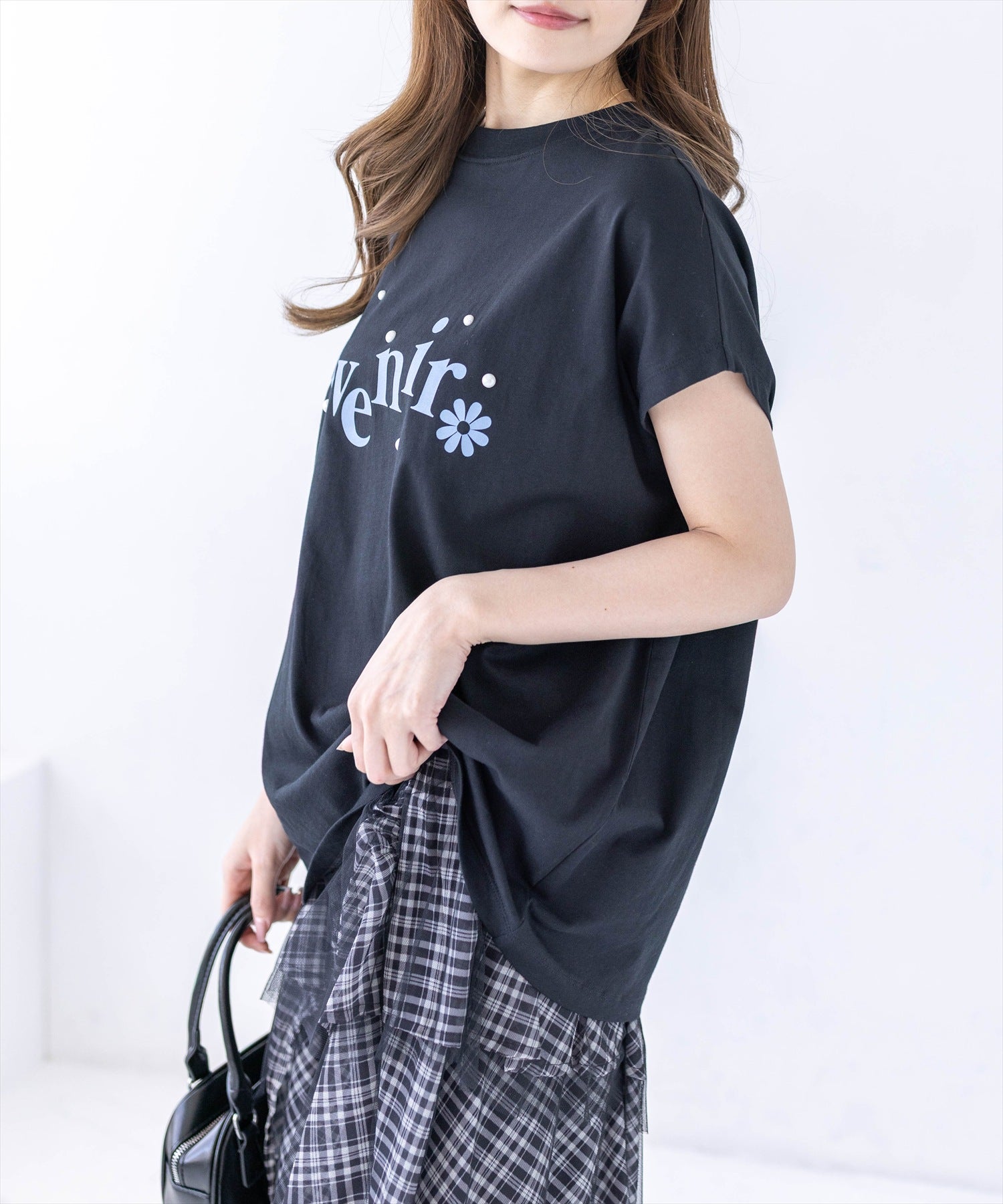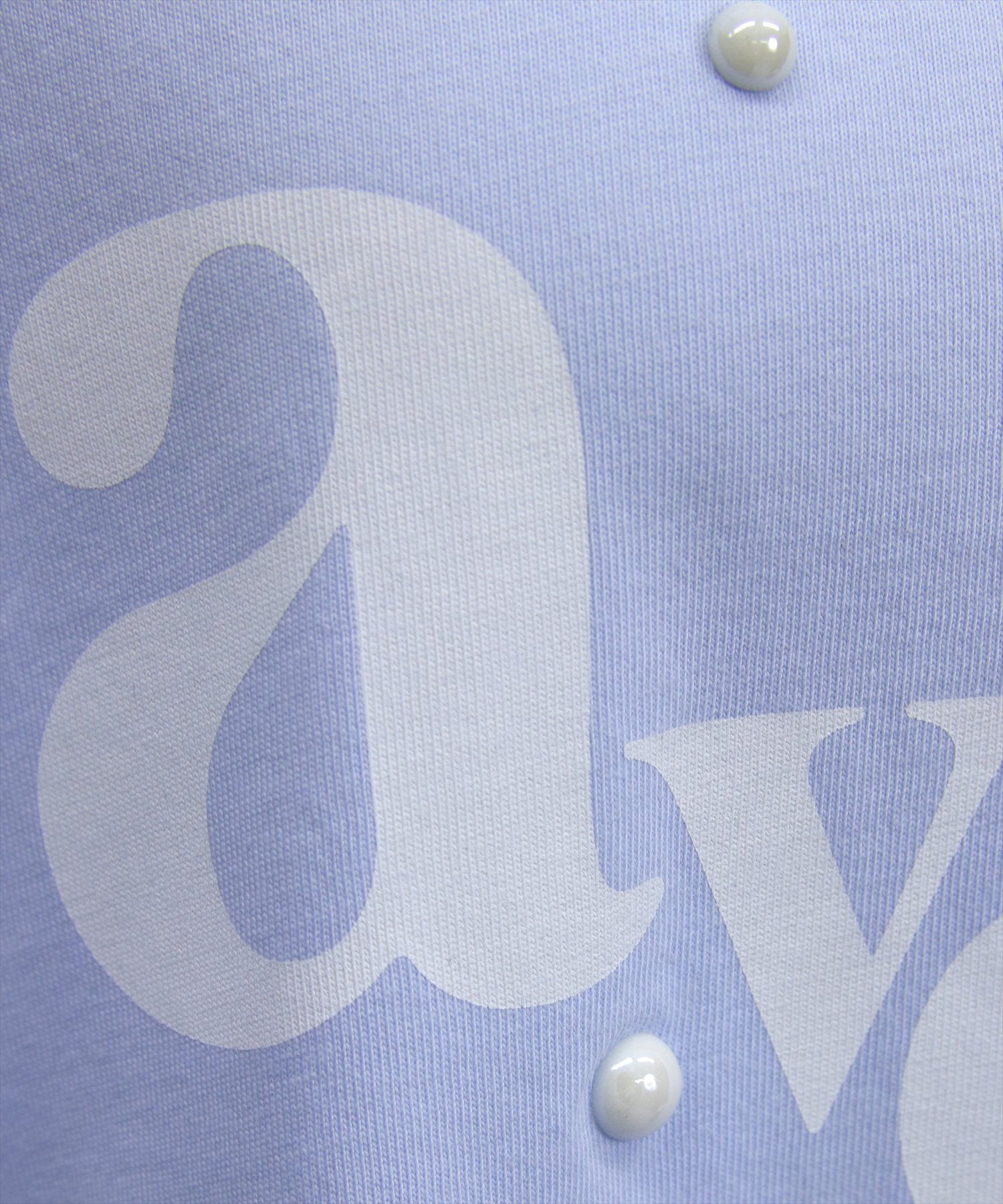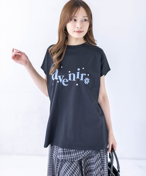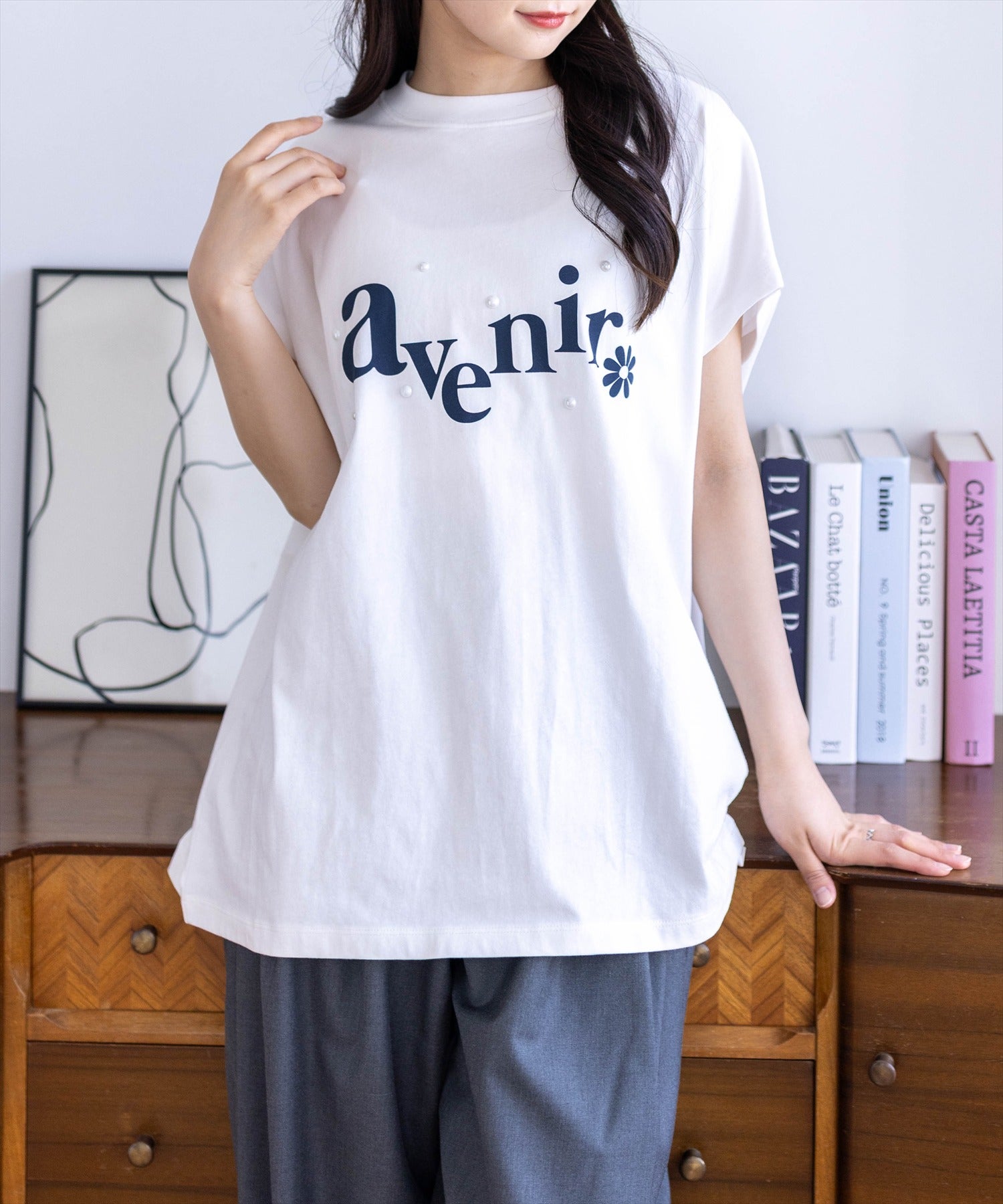 抜け感と上品さをこの一枚で!フレンチスリーブパール付きプリントロゴTシャツ