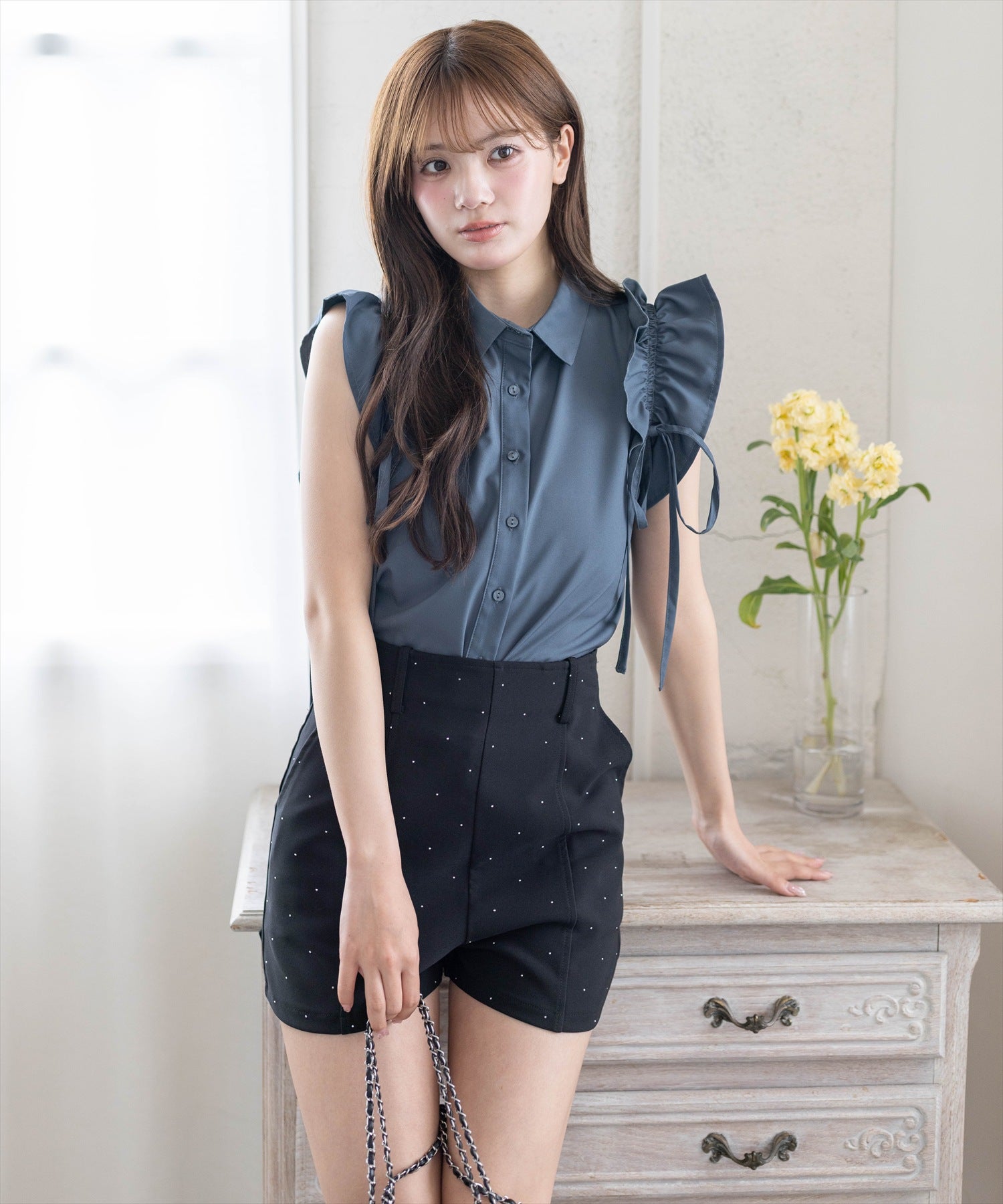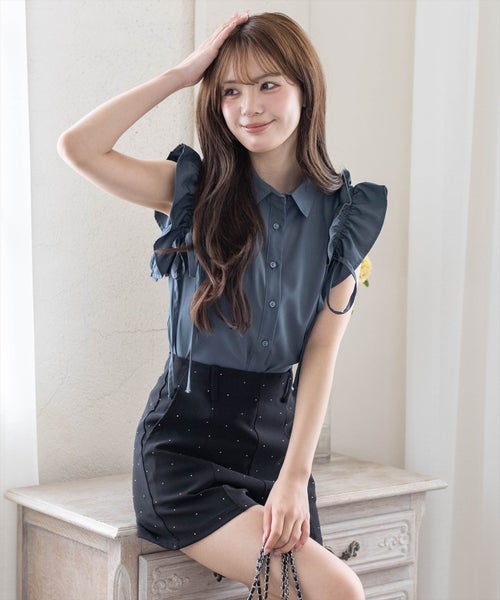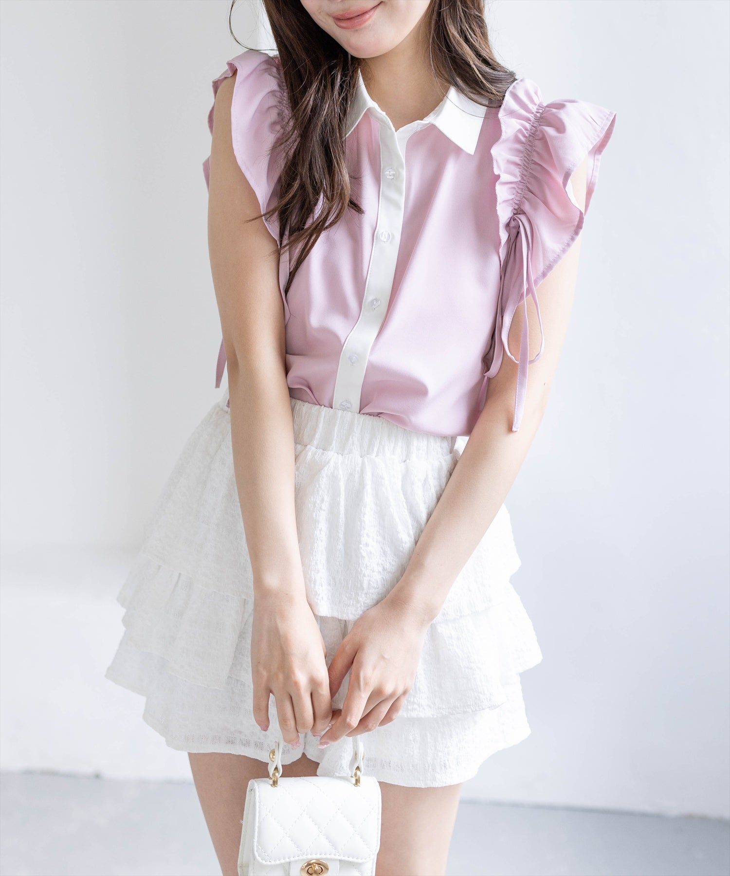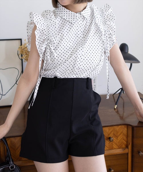 大人気間違いなし!リボン付きフリルノースリーブブラウス【デザイン】肩のフリルにリボンがついていて可愛らしい印象のブラウスです。ノースリーブですがフリルのボリューム感で細見え効果が抜群です!さらにインできる着丈なのでスッキリと着用いただけます♪【コーディネート】どんなボトムスとも相性も抜群です!テーパードパンツやフレアスカートにインしてきれいめなコーデにも、ミニスカート合わせで甘め可愛いコーデも◎