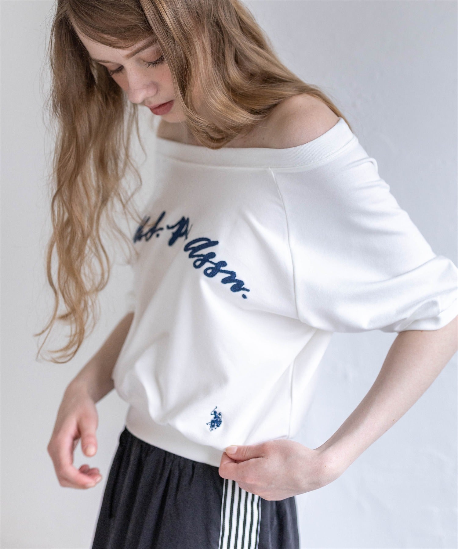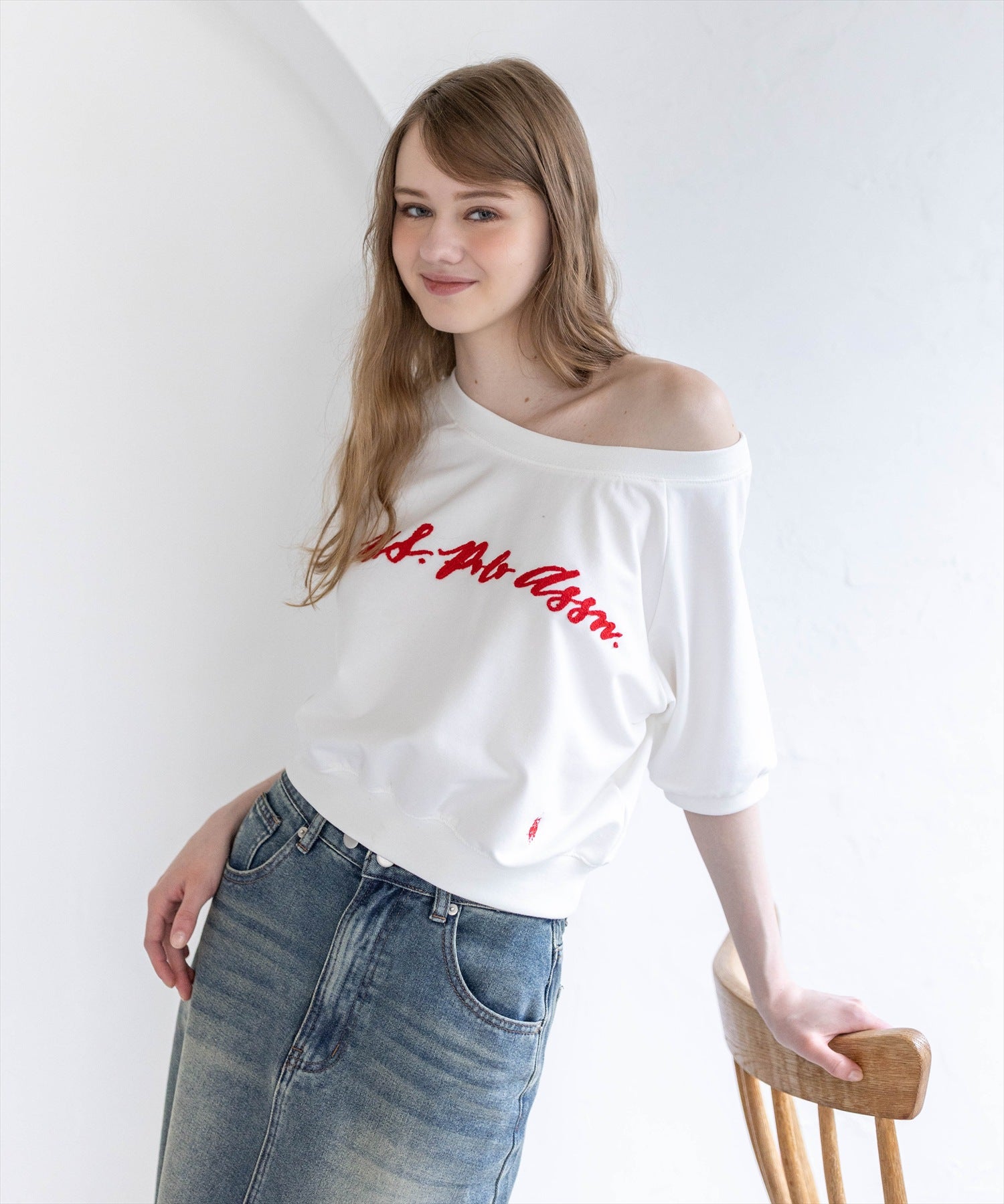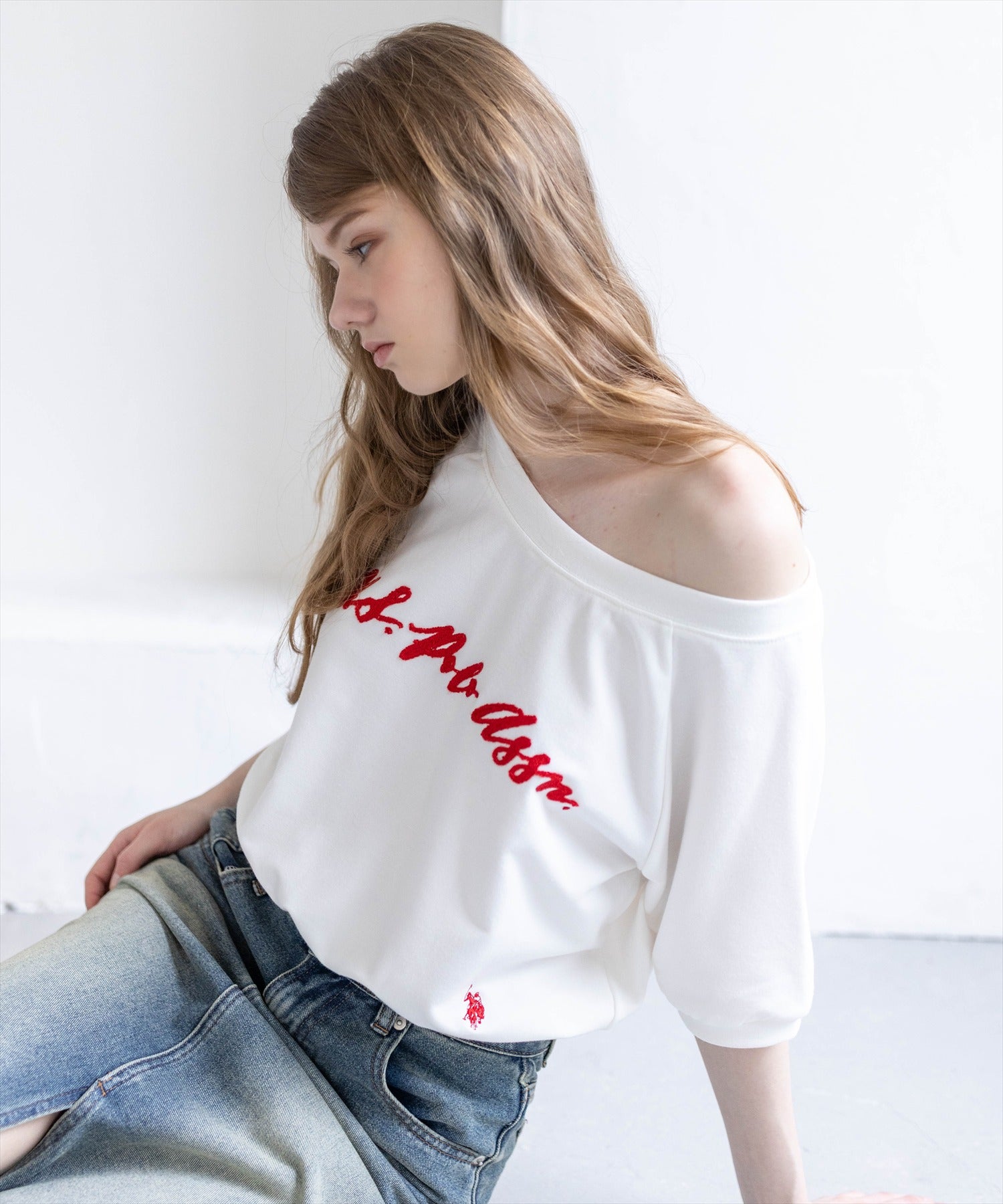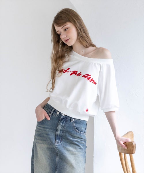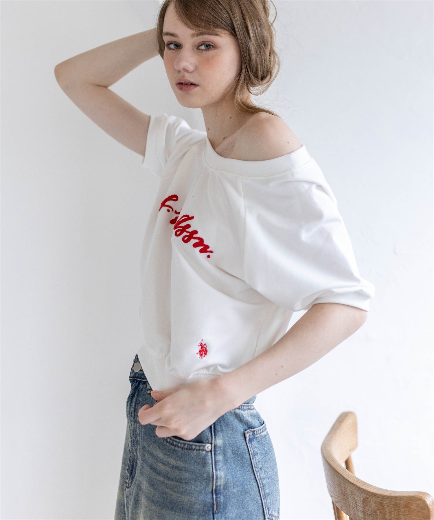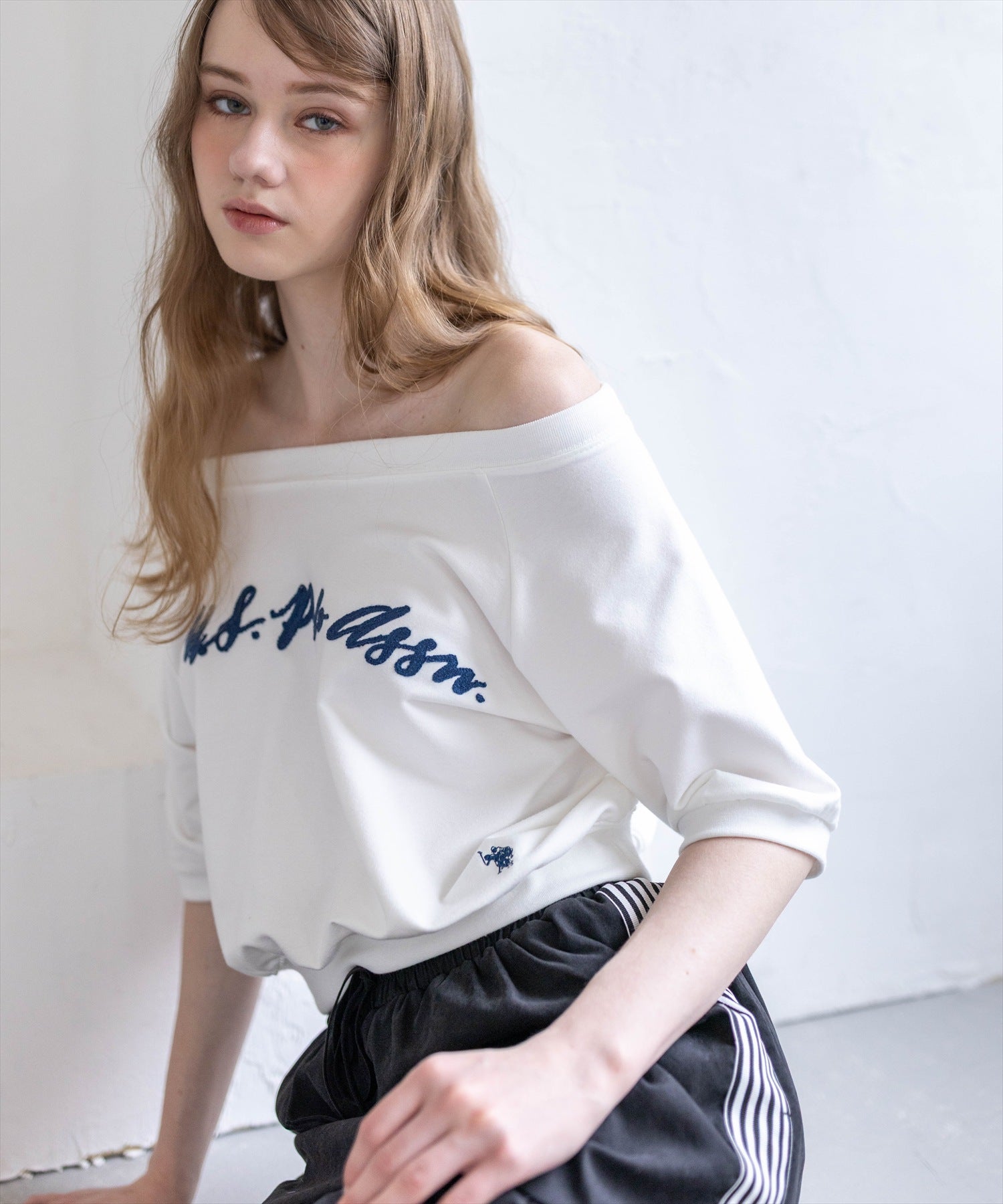 リラックス感のある素材に、女性らしい抜け感をプラスしたトップス。オフショルダーやワンショルダー、肩を出さずに着られる3way仕様です♪フロントのロゴデザインがアクセントになり、シンプルながらも存在感のある一枚です◎