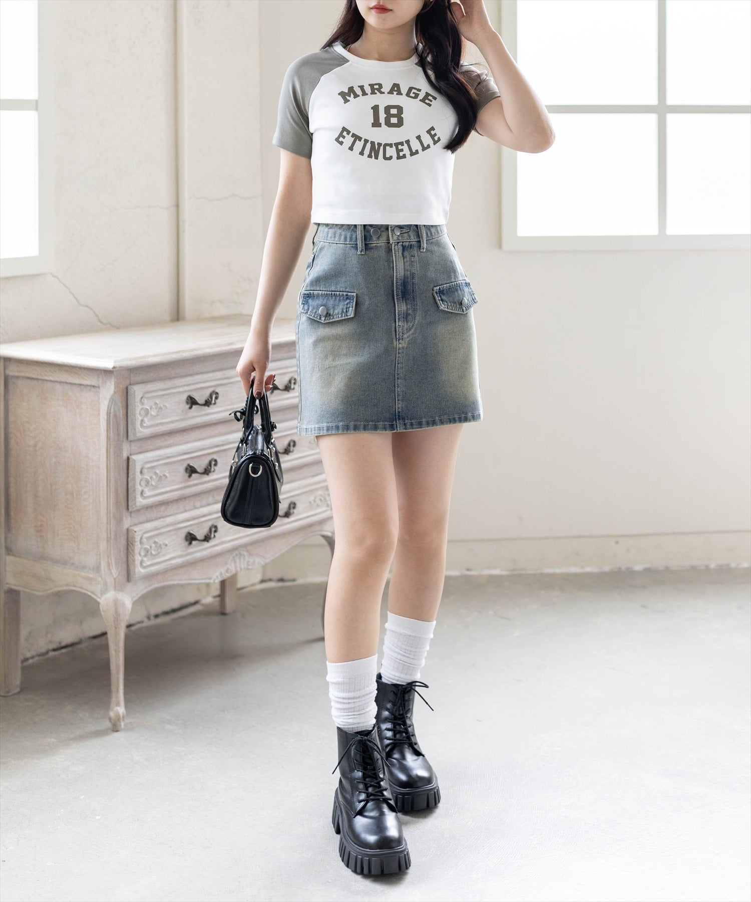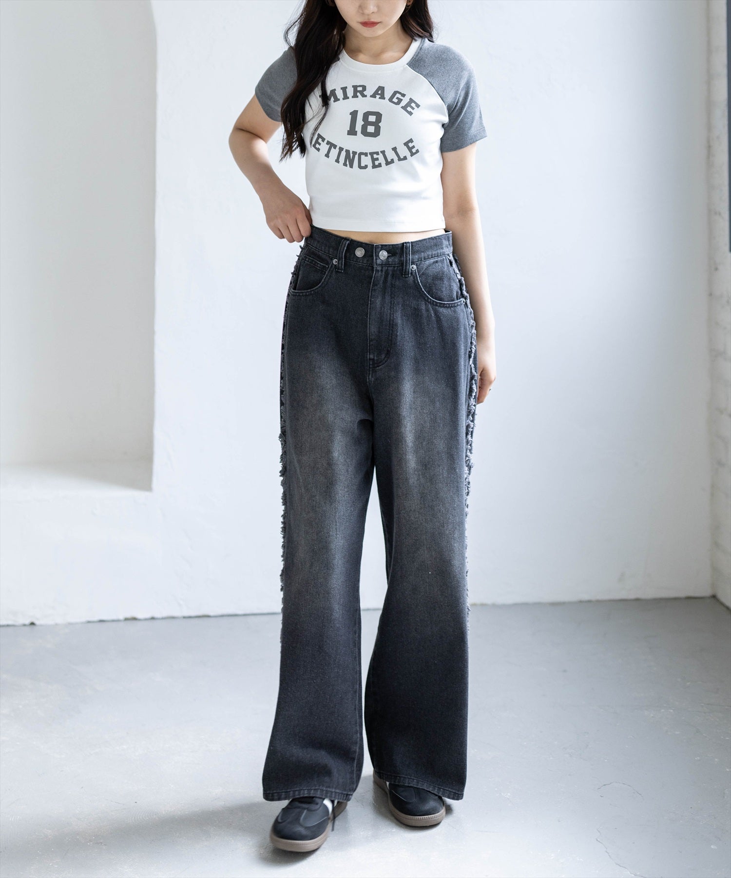 着るだけで今っぽい!ラグラン配色チビT【デザイン】配色ラグランがスポーティーな印象を与えるチビT。ほどよくフィットするシルエットで、女性らしいラインをきれいに演出してくれます◎ロゴデザインがほどよいアクセントになり、シンプルながらも着映えするアイテムです!【コーディネート】ローライズデニムにキャップを合わせると王道Y2Kコーデが完成します!ハイウエストミニスカートと合わせて甘辛MIXコーデに。カーゴパンツに合わせて韓国ストリートコーデにしても可愛いです♪