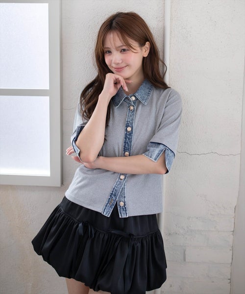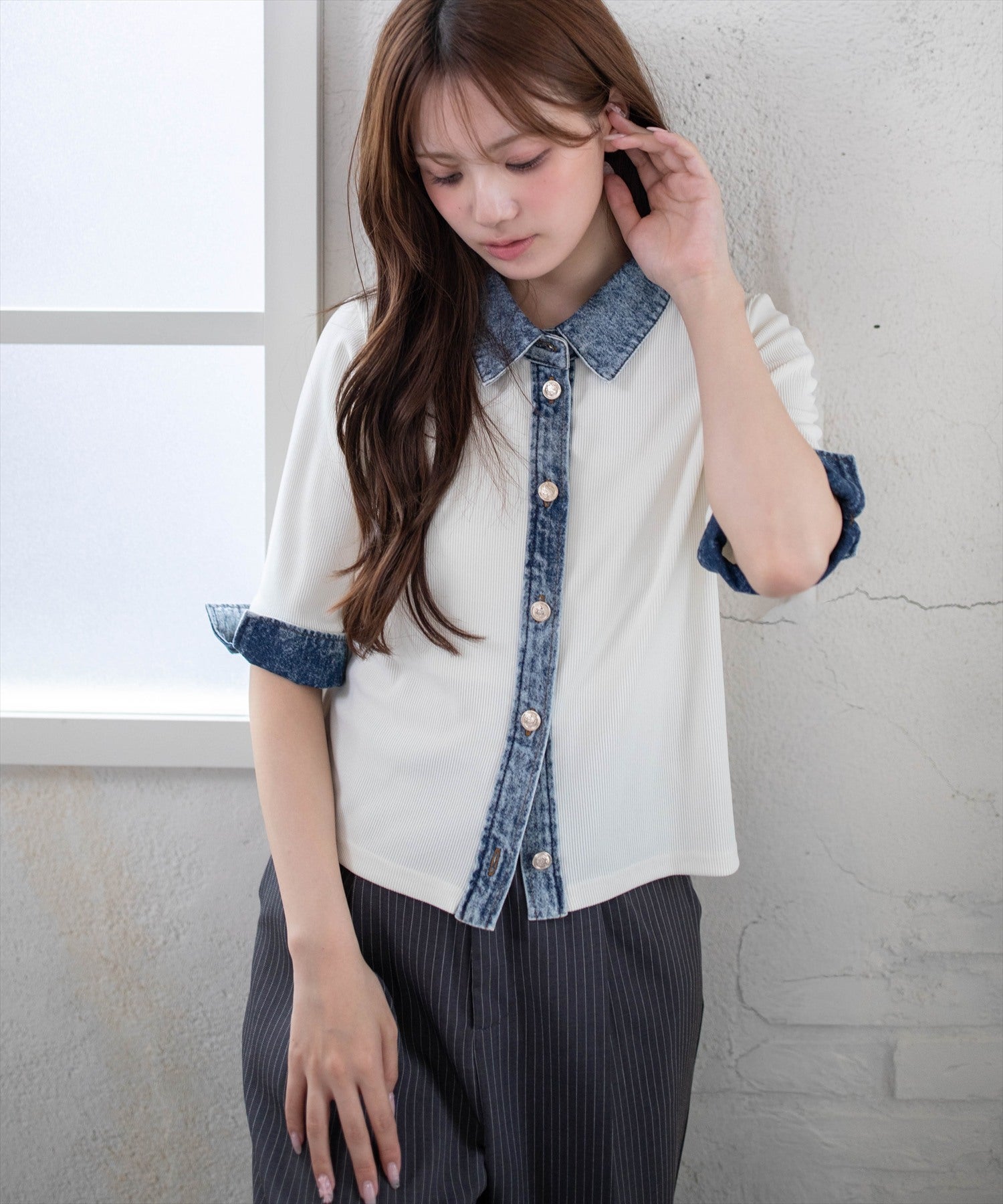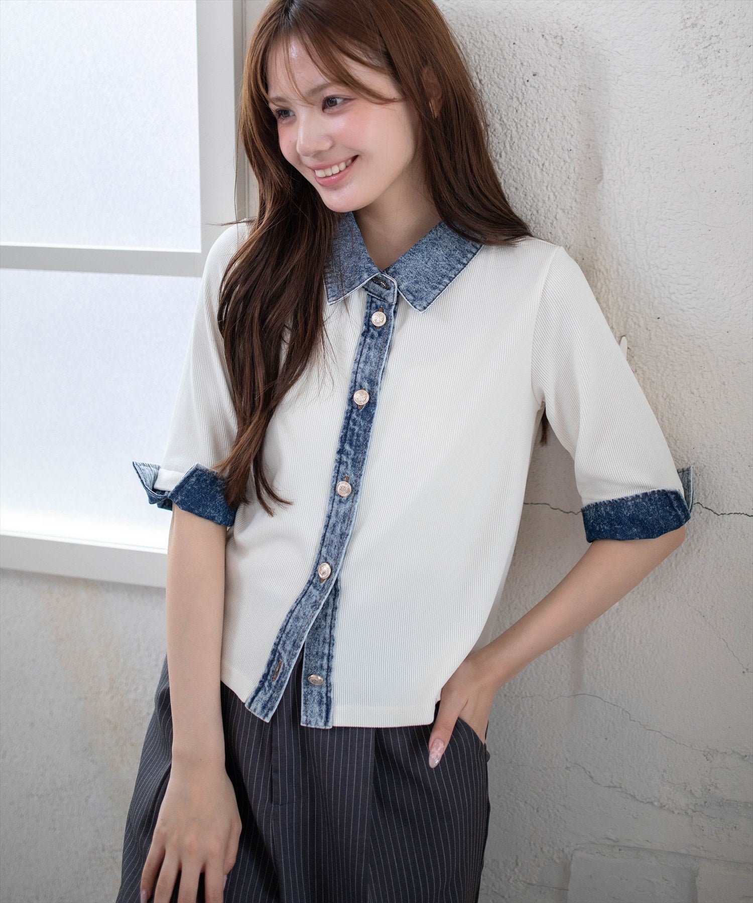 襟と前立て部分にデニム素材を使用した異素材切替デザインのカットソートップス。程よくコンパクトなシルエットで、すっきりとした印象に仕上がります。縦ラインを強調するデザインがスタイルアップ効果も◎カジュアルさの中に上品さをプラスした、今っぽい一枚です。