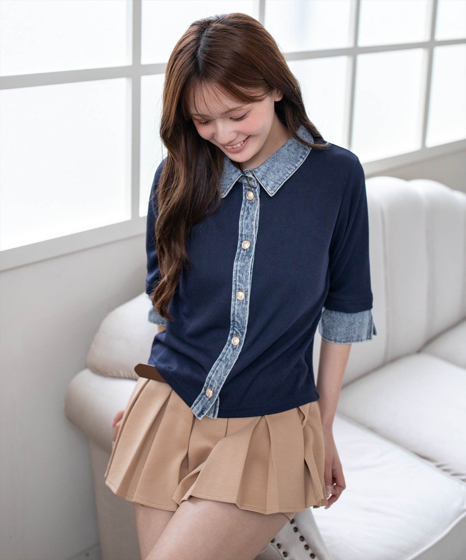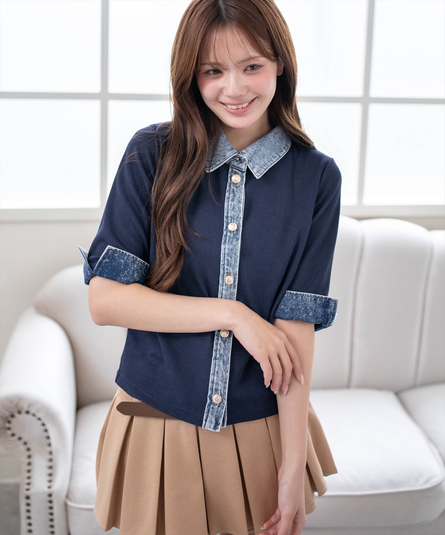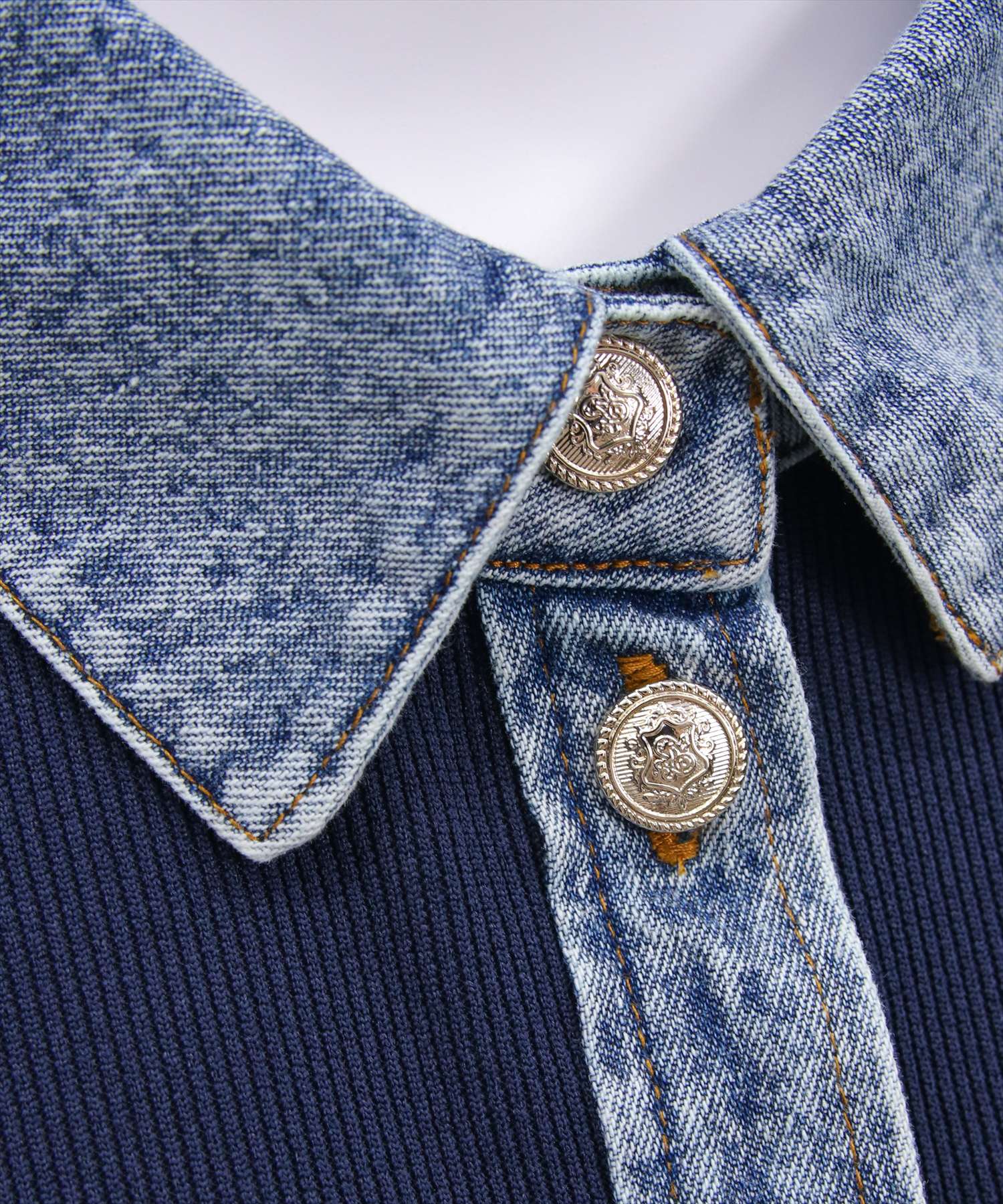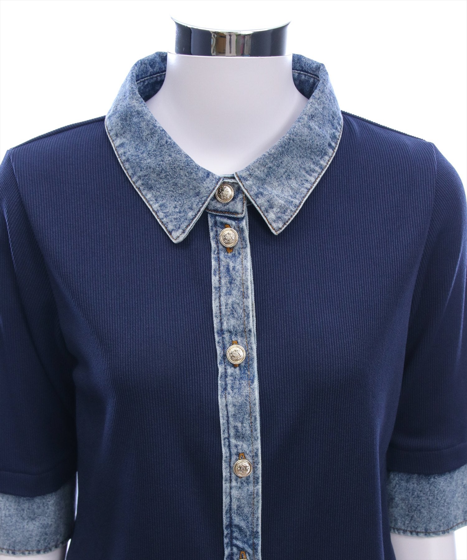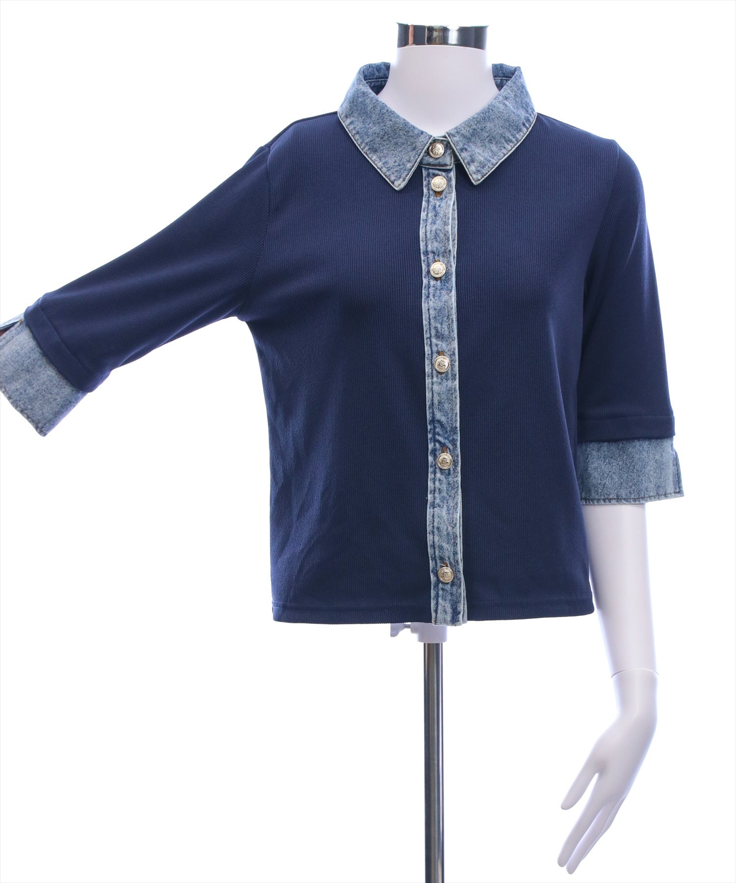 デイリー使い万能トップス♪襟付デニム切替カットソートップス