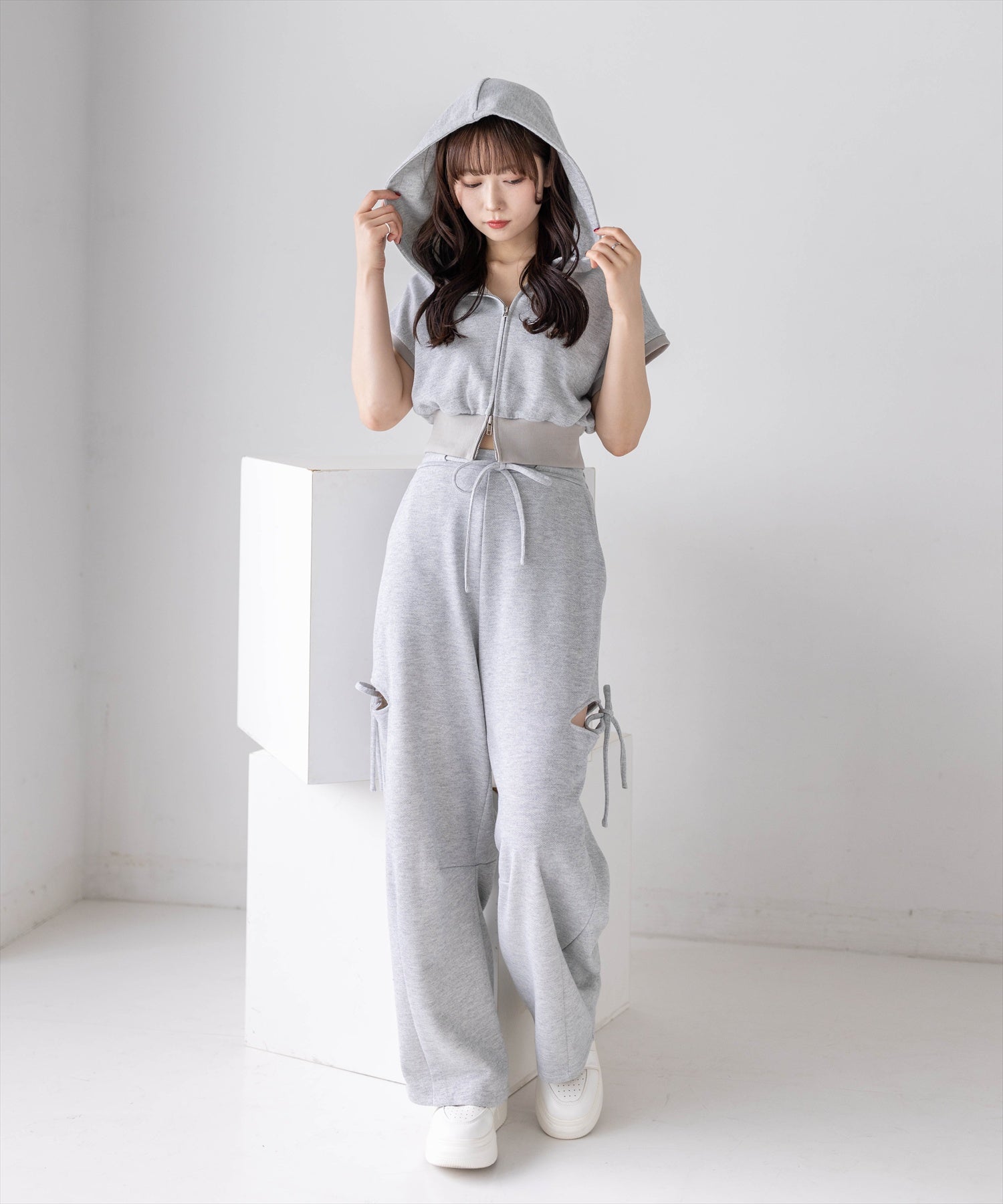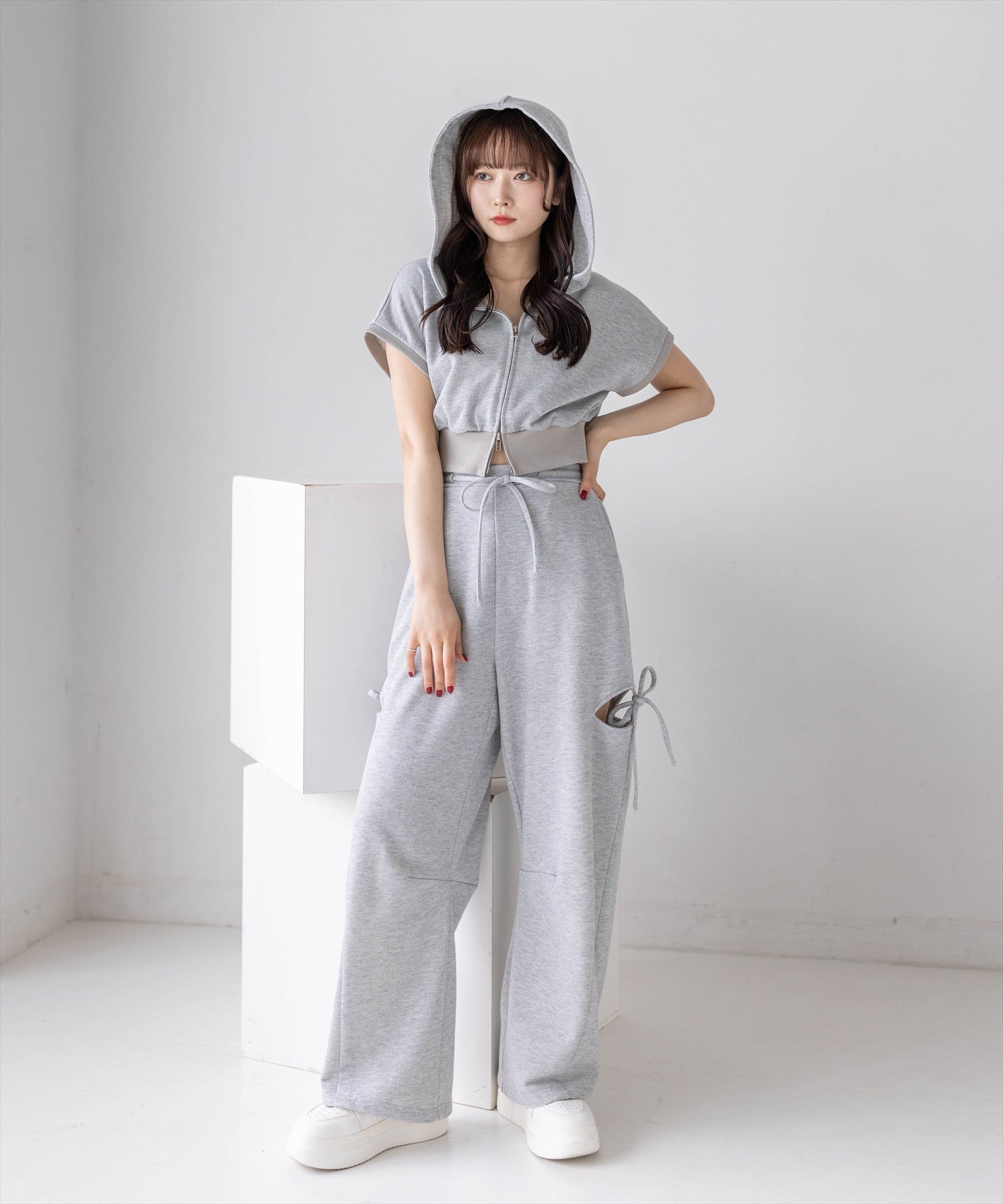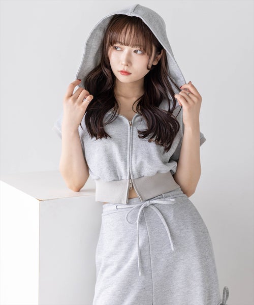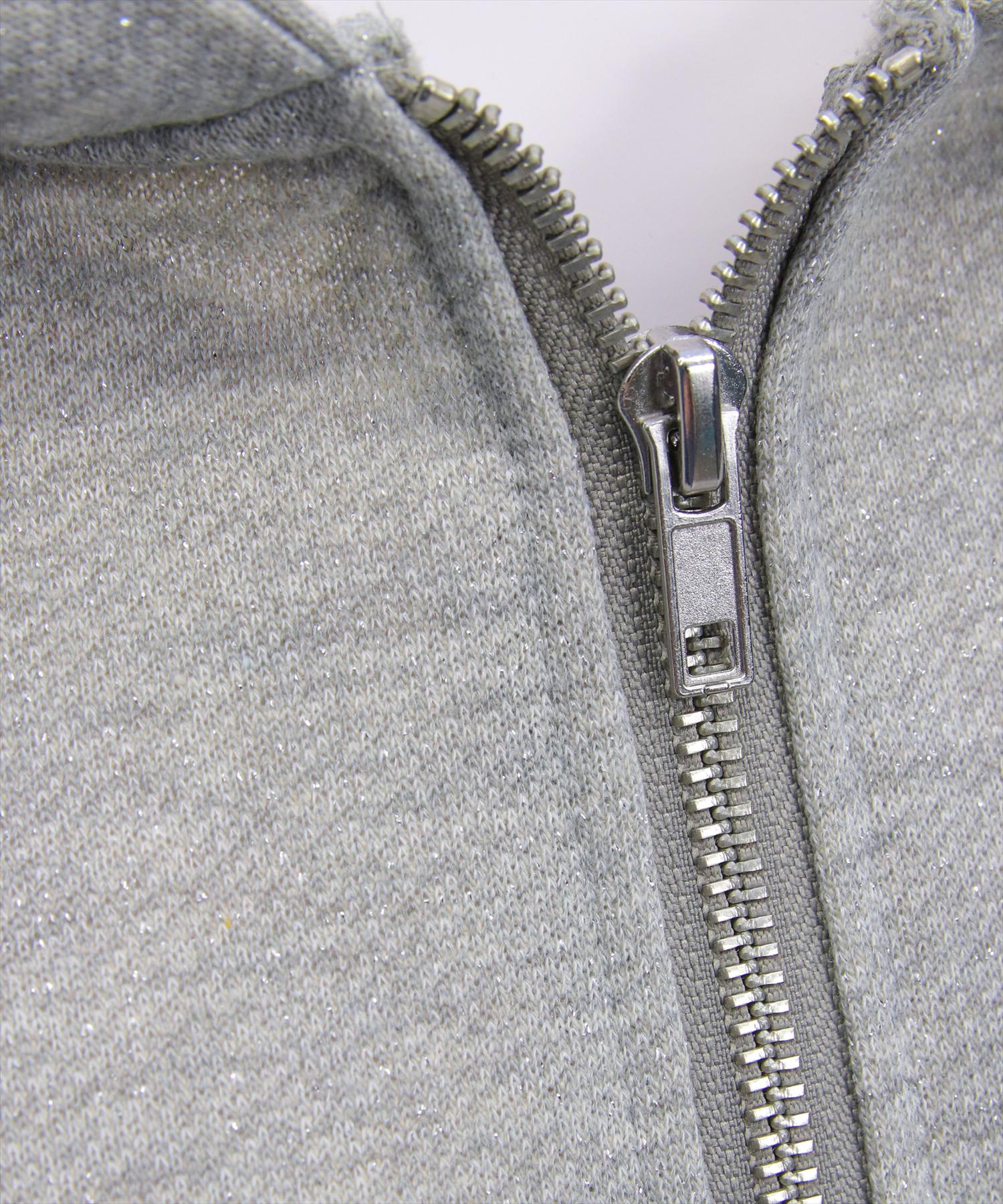 セットアイテムのパンツ(商品番号:204A1-142496/サイドスリットリボン付きラメスウェットパンツ(セット可))と合わせていただくのがおすすめ◎。ダブルジップなので下を少し開けて抜け感を出すと可愛いです♪