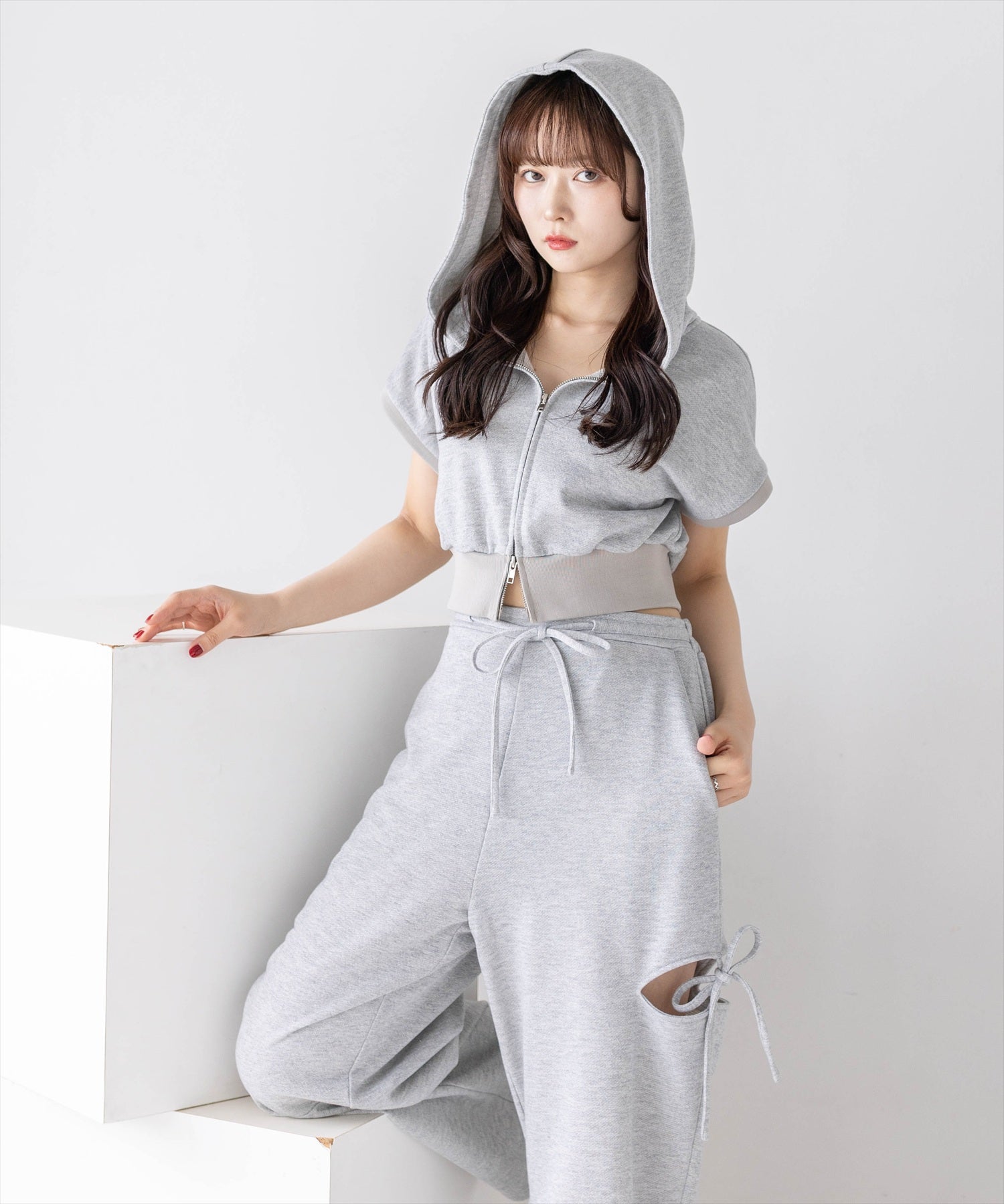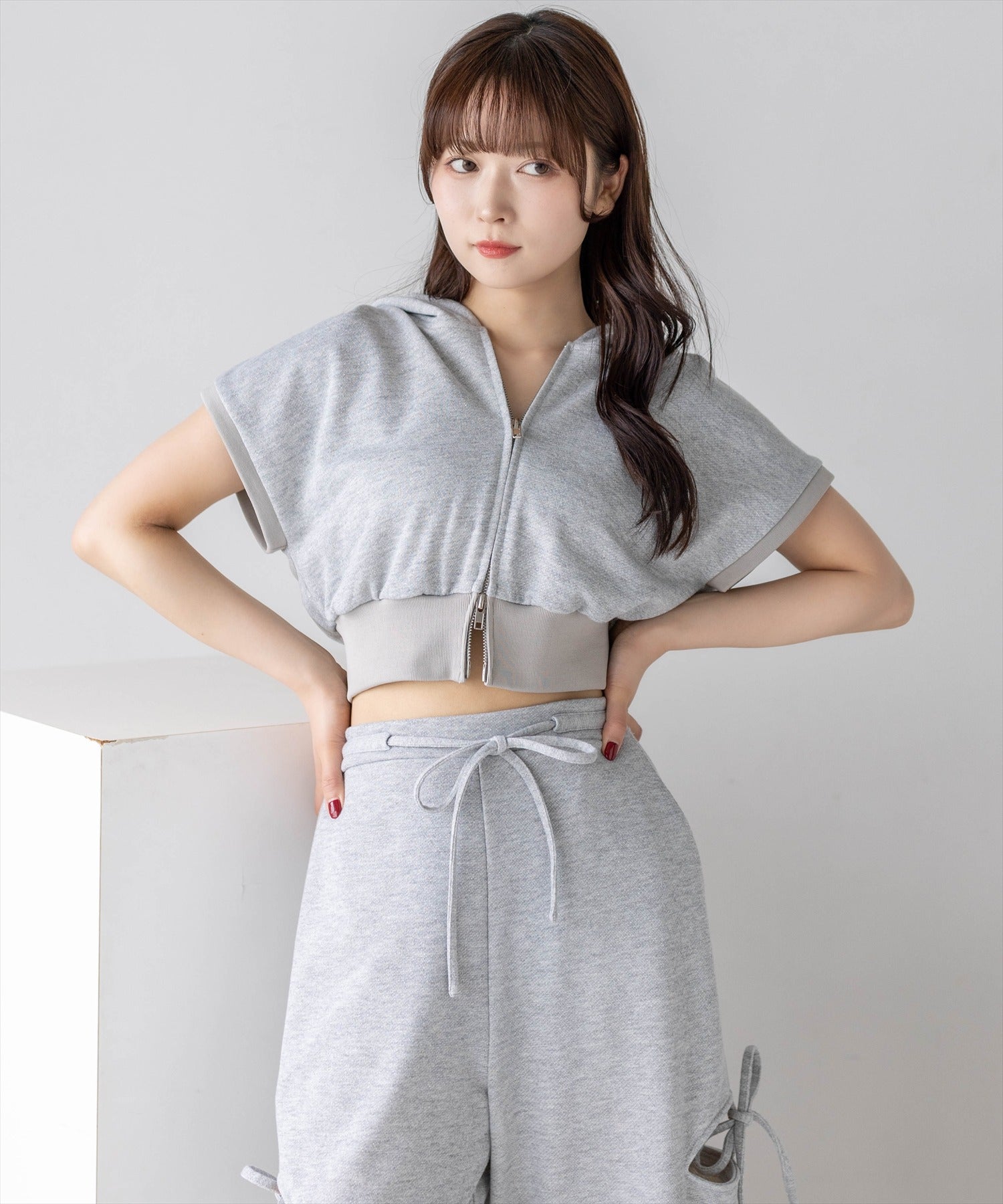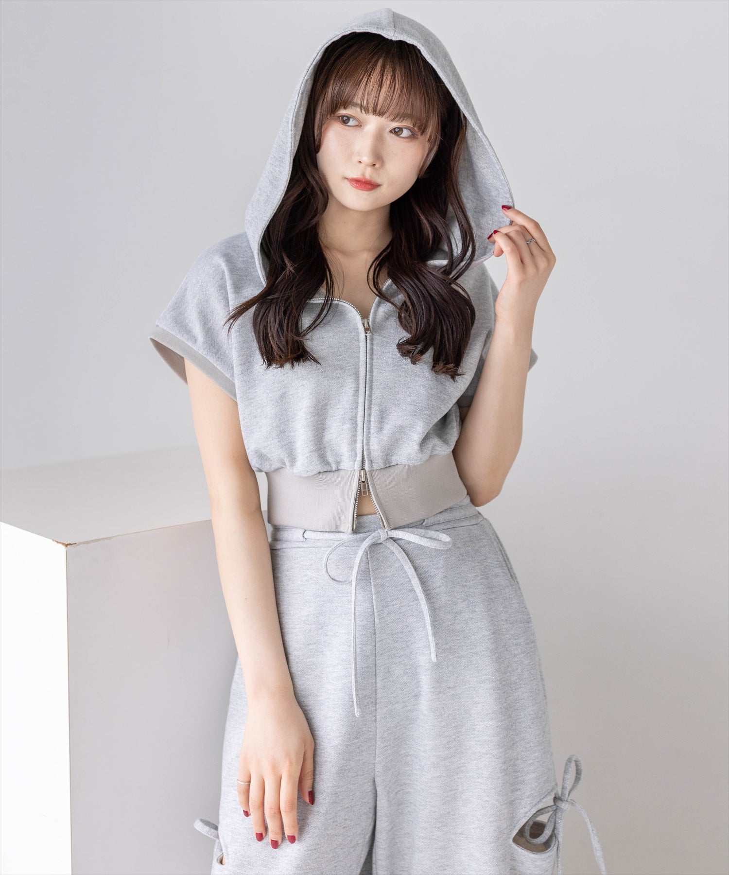 セットアイテムのパンツ(商品番号:204A1-142496/サイドスリットリボン付きラメスウェットパンツ(セット可))と合わせていただくのがおすすめ◎。ダブルジップなので下を少し開けて抜け感を出すと可愛いです♪