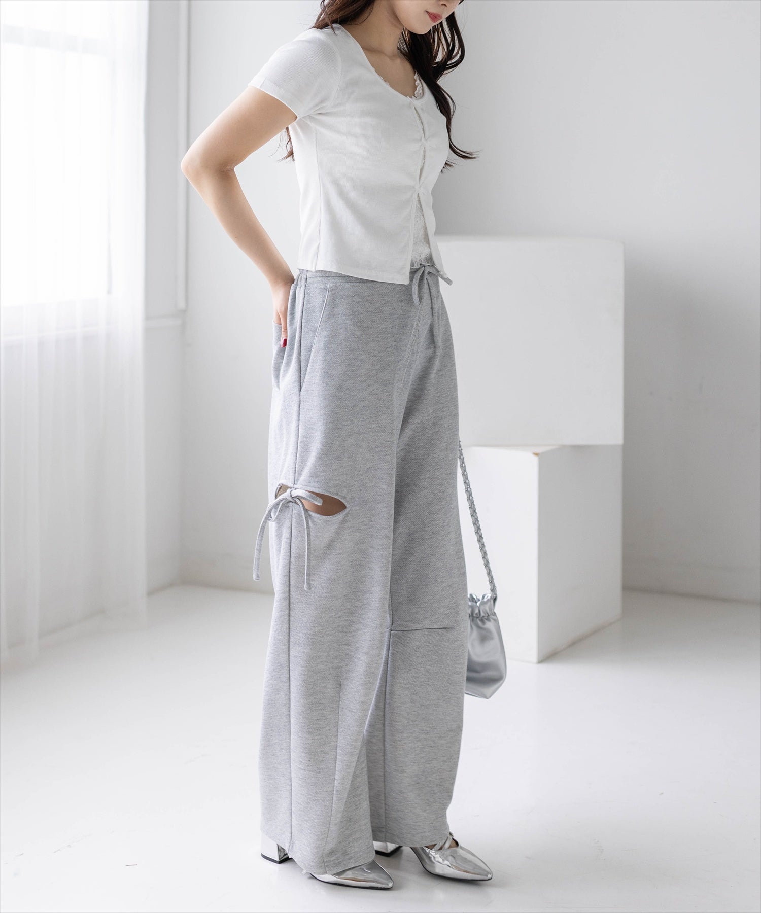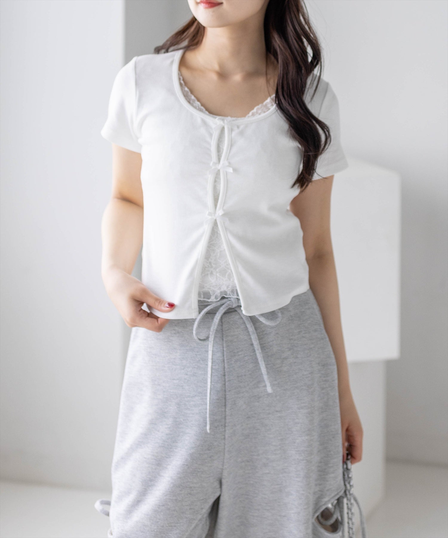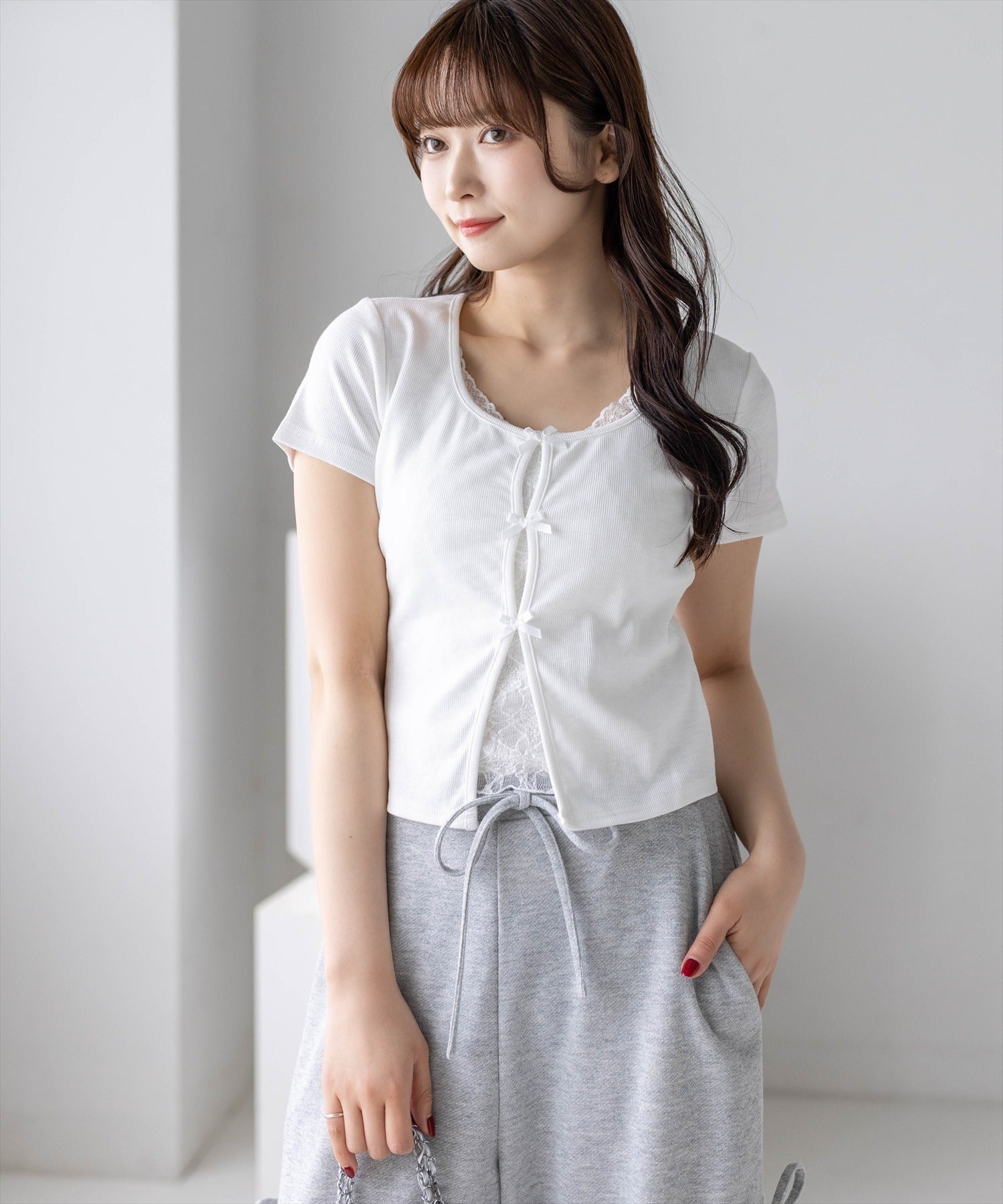 フロントにあしらわれたリボンとレースが目を引く、レイヤード風デザインのカットソー。コンパクトなシルエットでボディラインをすっきりと見せ、女性らしい印象を演出します。さりげない肌見せと繊細なディテールが、韓国ガーリーな雰囲気を高めてくれる一枚です。