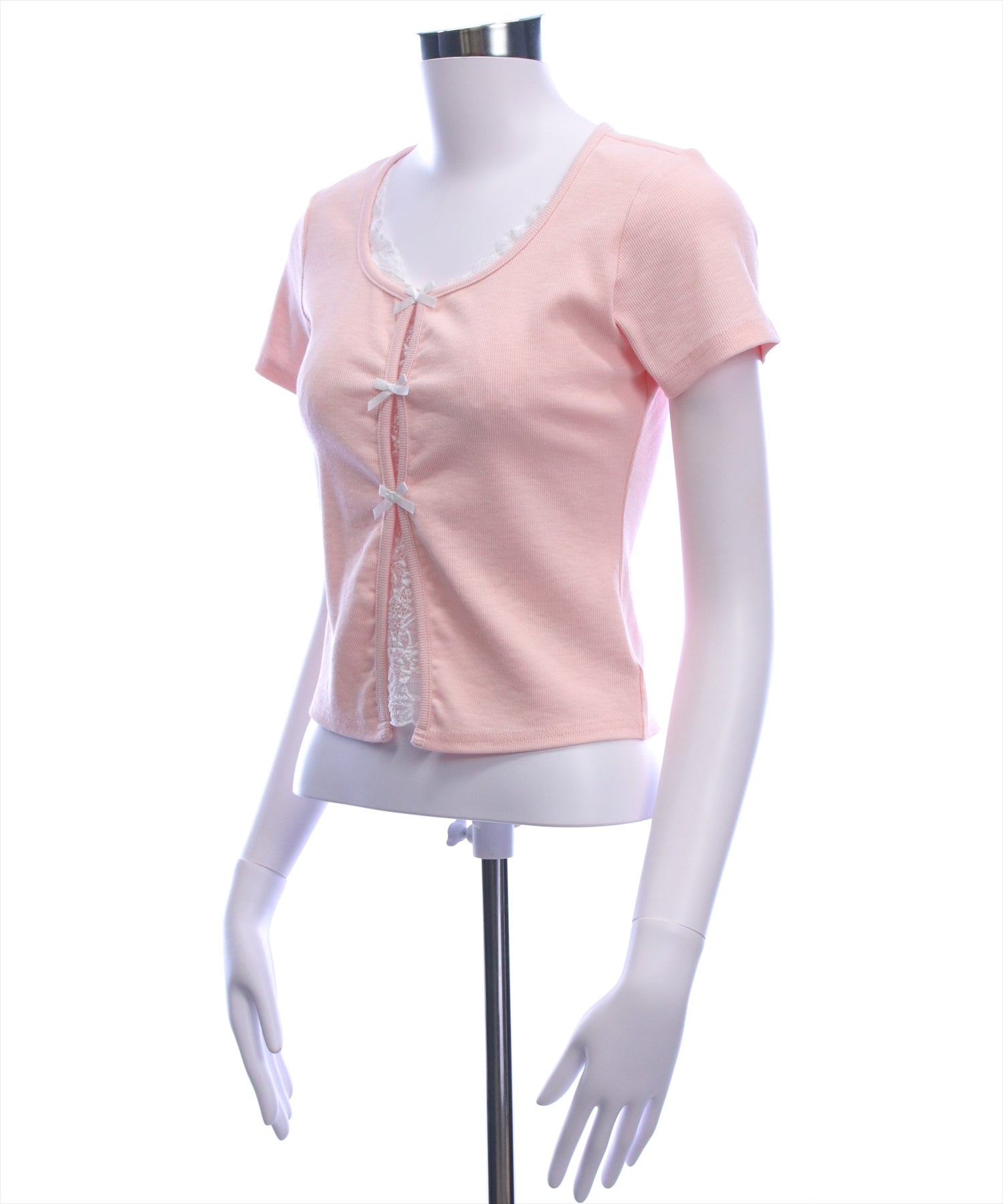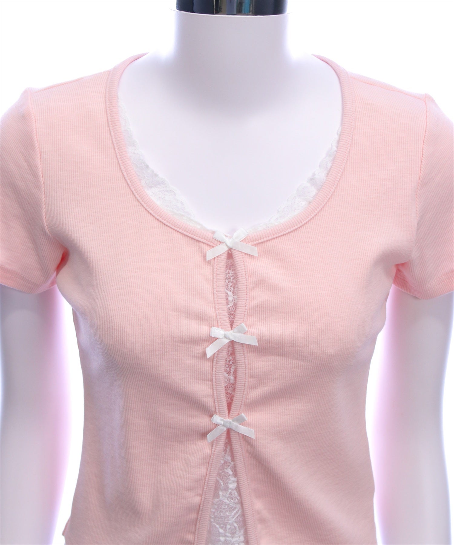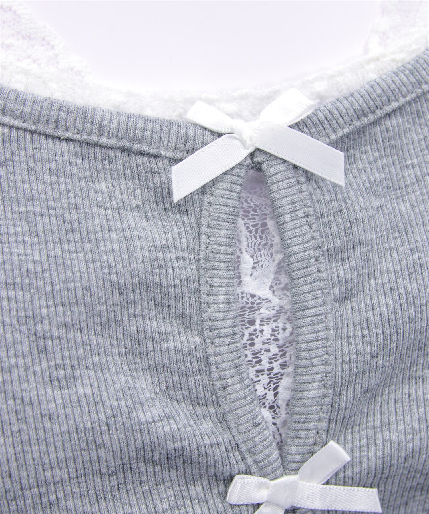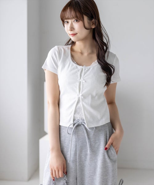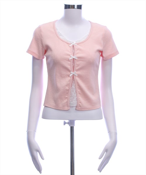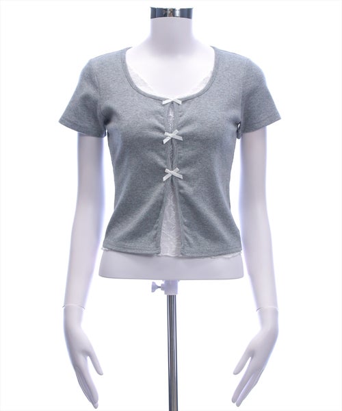 韓国ガーリーなリボントップス♪フロントリボンレースレイヤード風カットソー