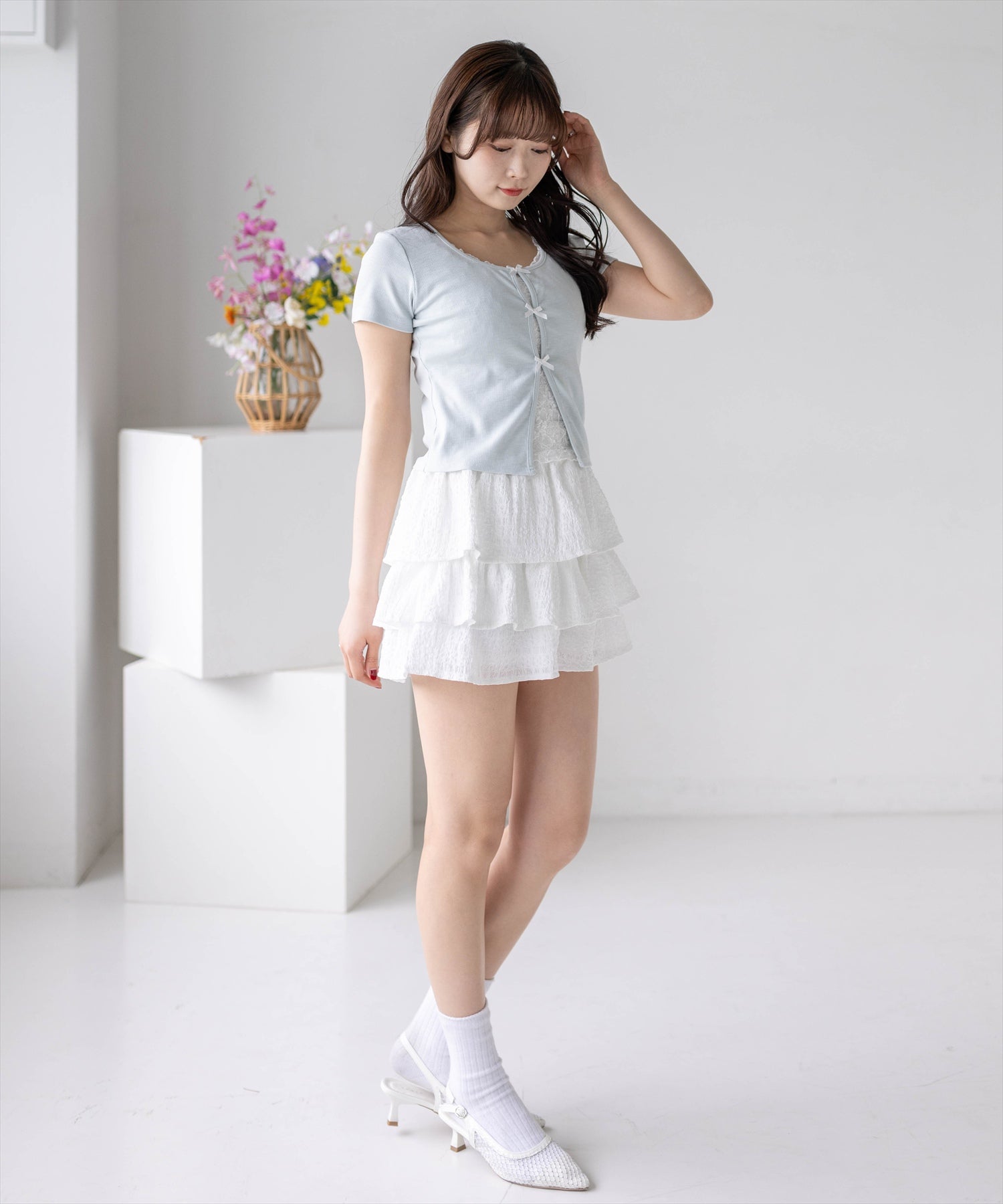 ミニスカートやプリーツスカートと合わせて韓国ガーリーに仕上げるのはもちろん、デニムやワイドパンツと合わせた甘辛ミックスコーデもおすすめです。足元は厚底スニーカー、ローファーを合わせるとトレンド感のあるスタイリングが完成します。