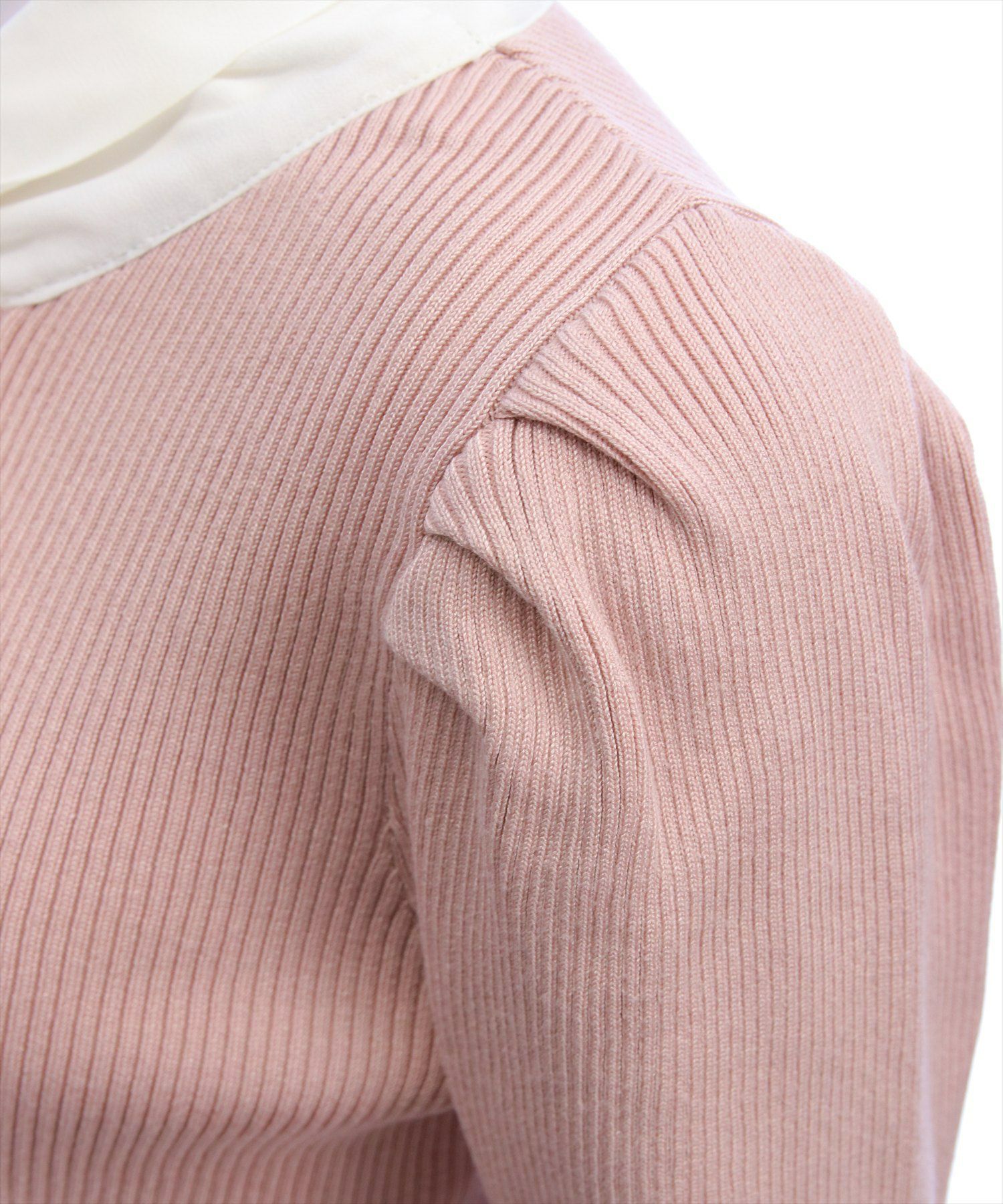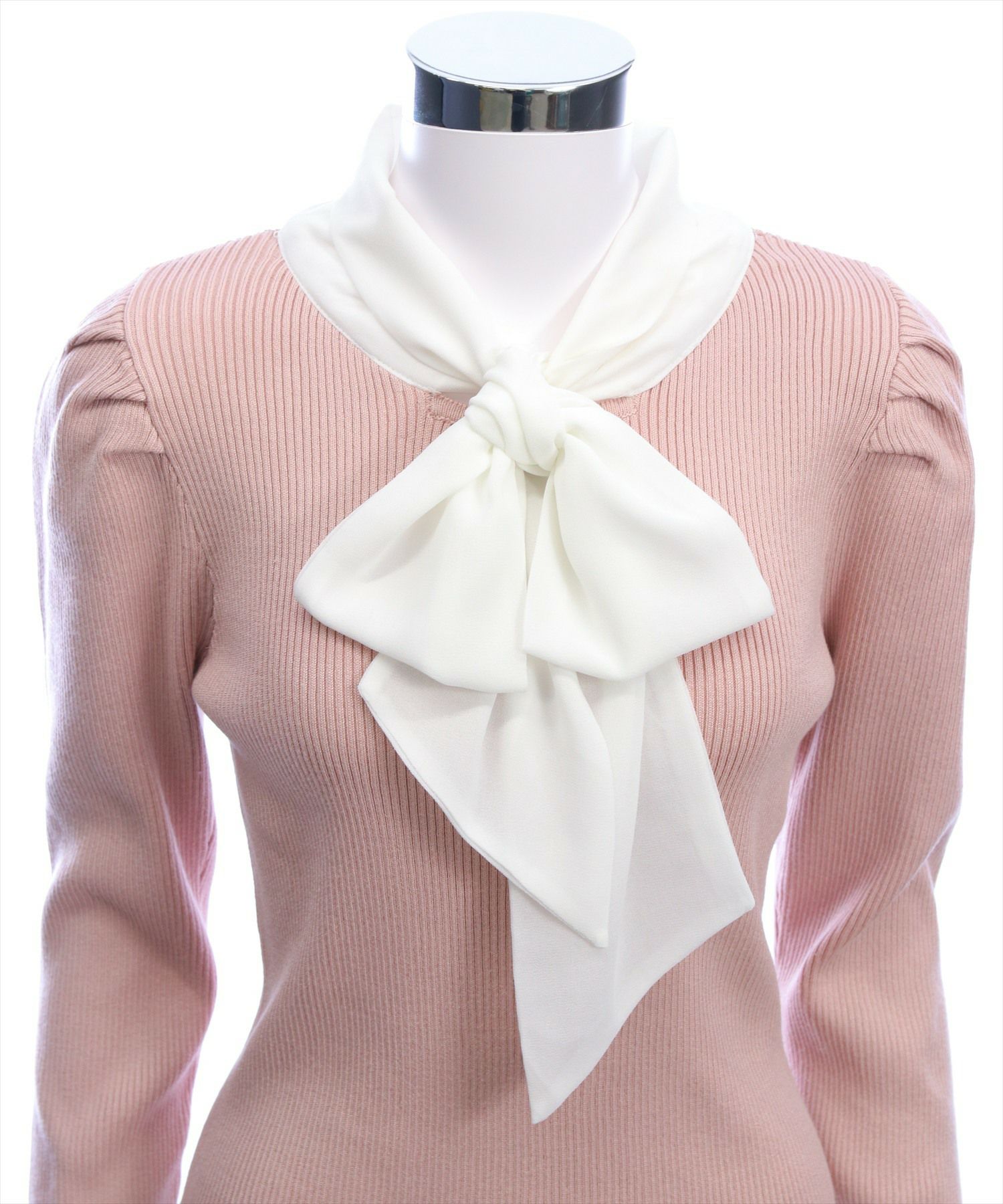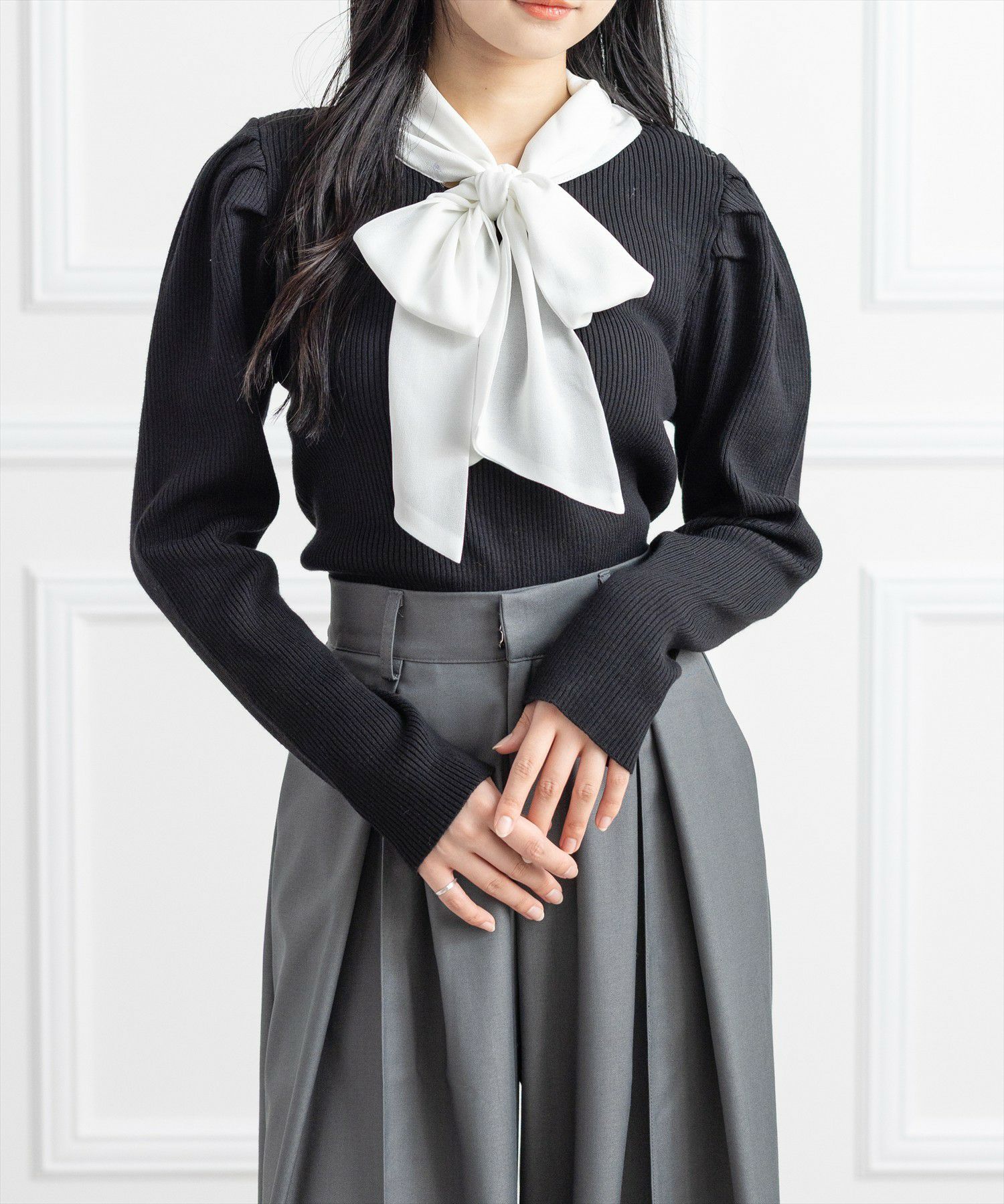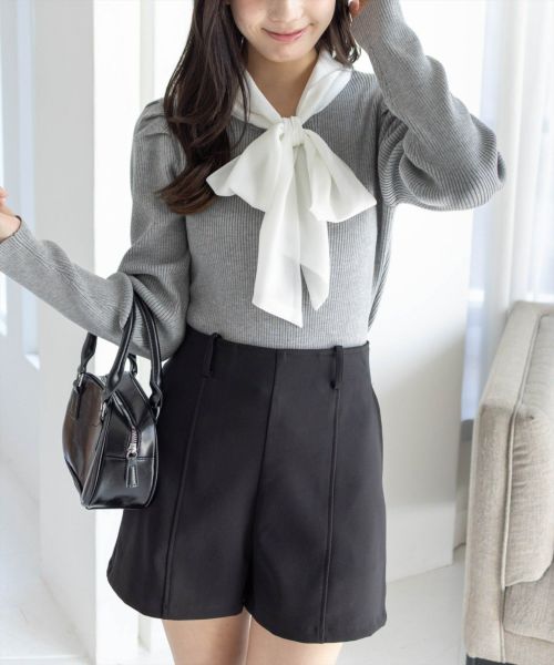 1枚で華やかに決まる!布帛ボウタイパワショルニットトップス