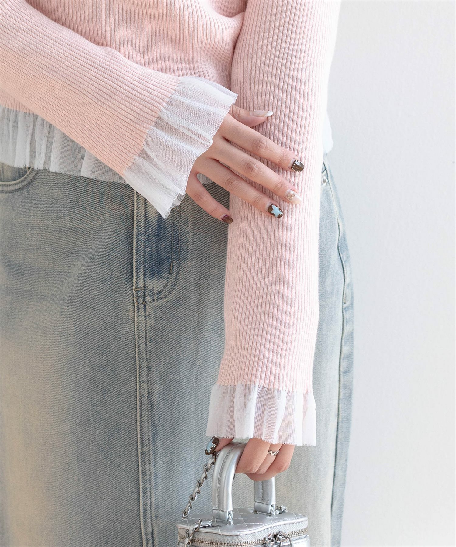 デニムにもスカートにも似合う優秀トップス!シアーフリルリブニットトップス