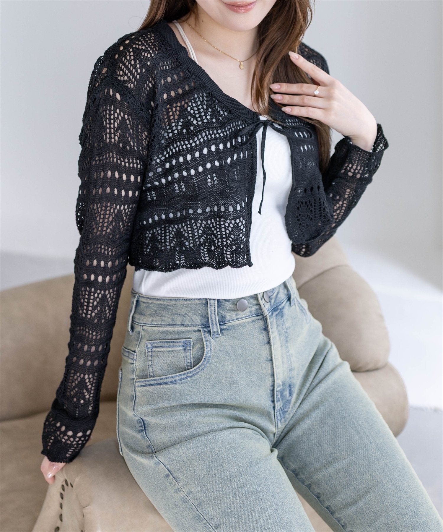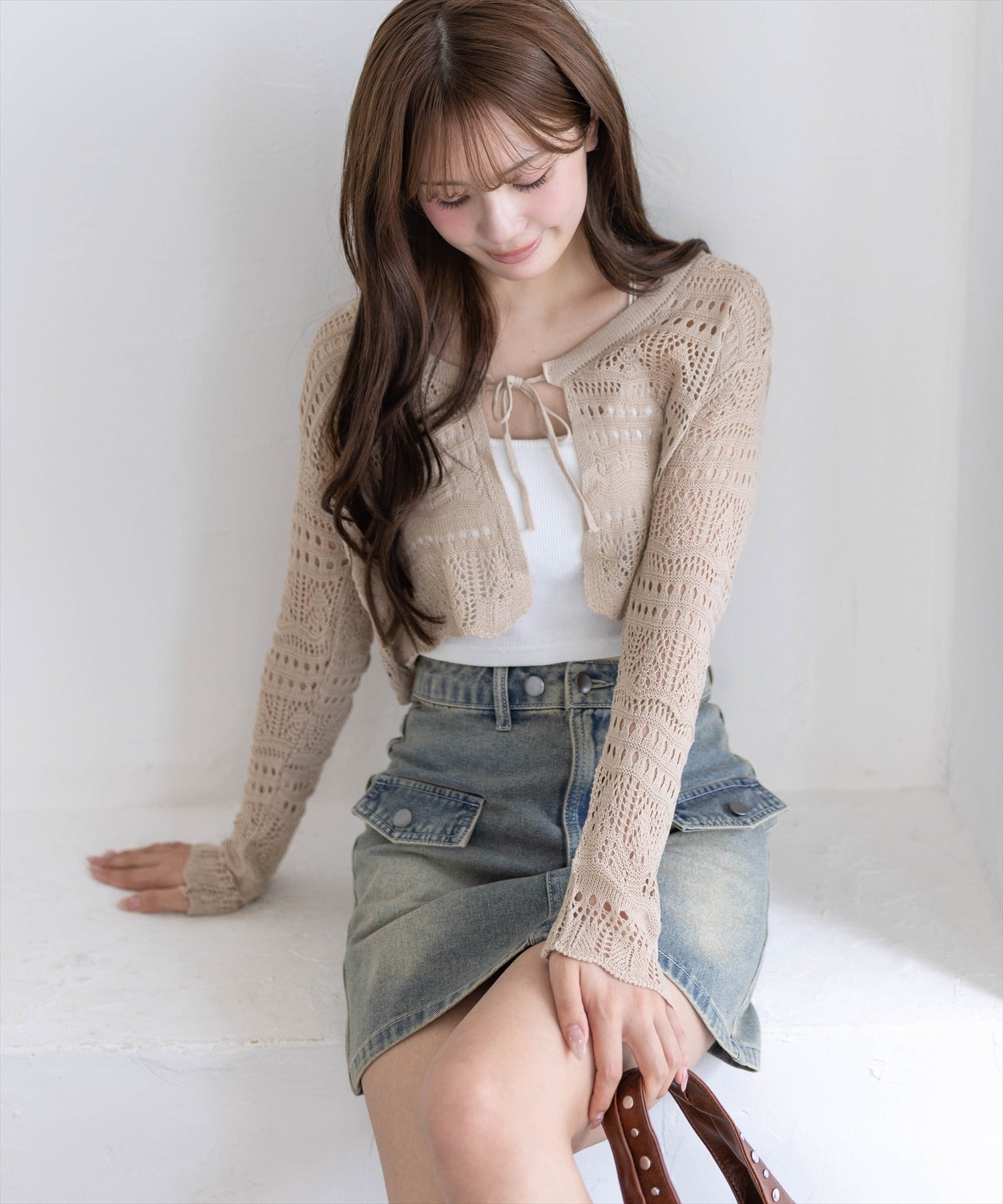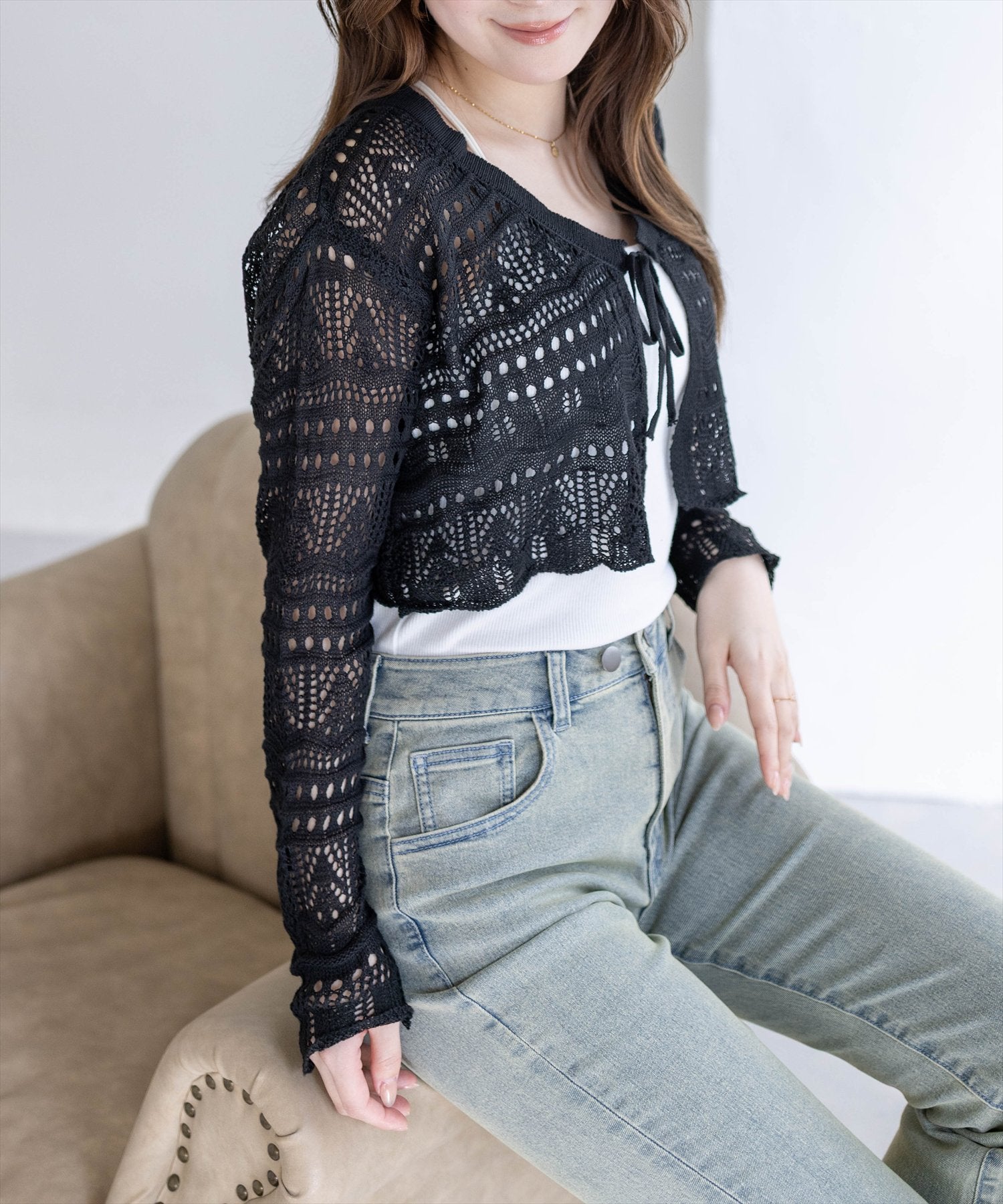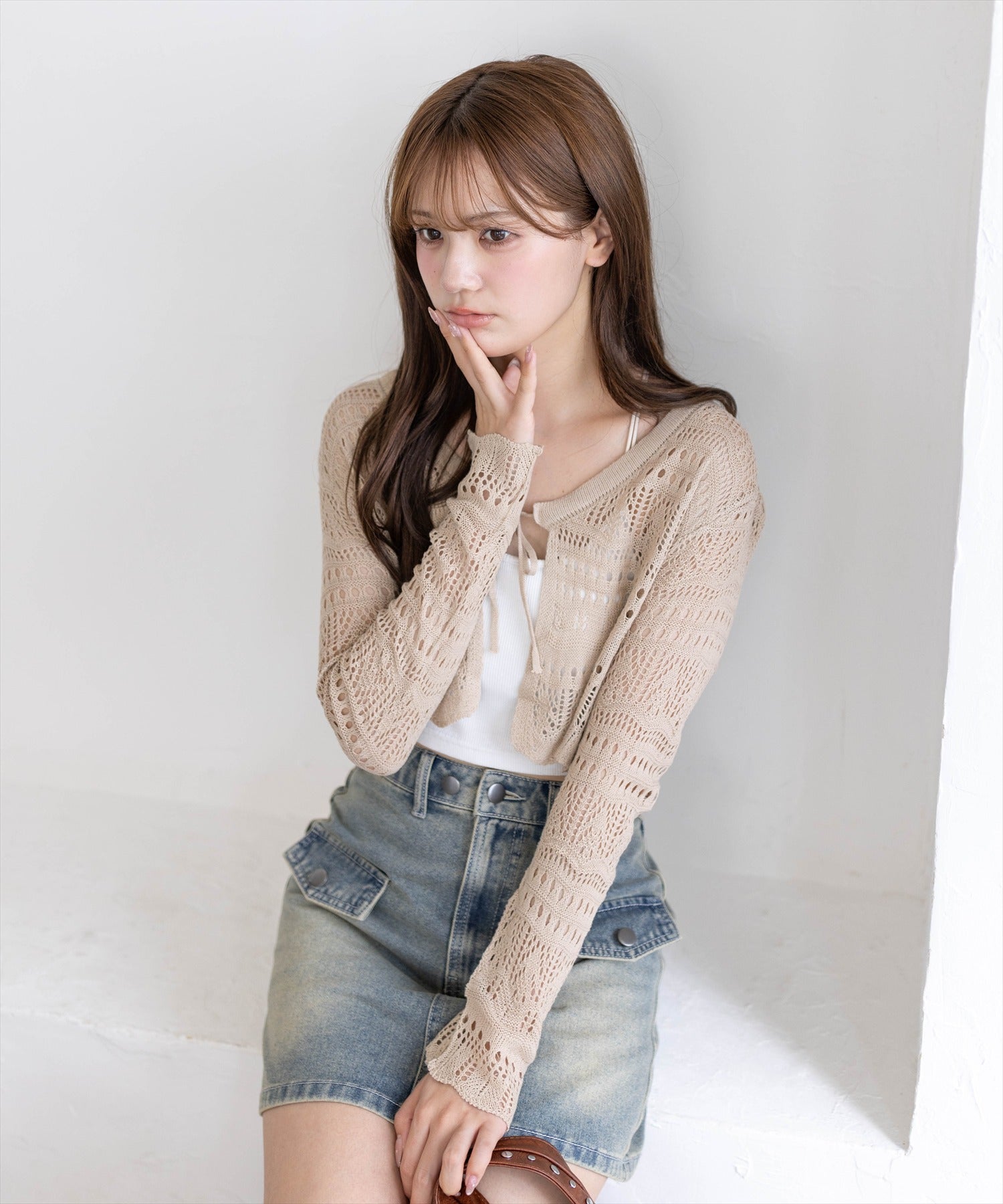 軽く羽織って、ちゃんとおしゃれ!透かし編みニットボレロカーディガン【デザイン】軽やかな透かし編みデザインが魅力のカーディガン。程よい肌見せが叶う編み地で、抜け感のあるスタイリングを演出します◎コンパクトな丈感で、ウエスト位置を高く見せてスタイルアップ効果も♪【コーディネート】フリルミニスカートやプリーツミニスカートと合わせてガーリーコーデに♪キャミワンピースの上に羽織ってフェミニンコーデにも!ワイドデニムやストレートデニムと合わせて大人カジュアルなコーデも可愛いです◎