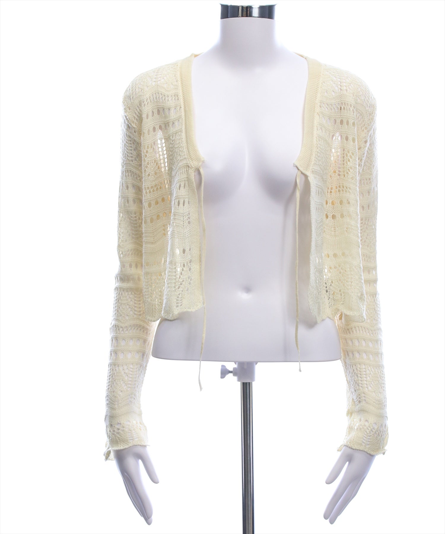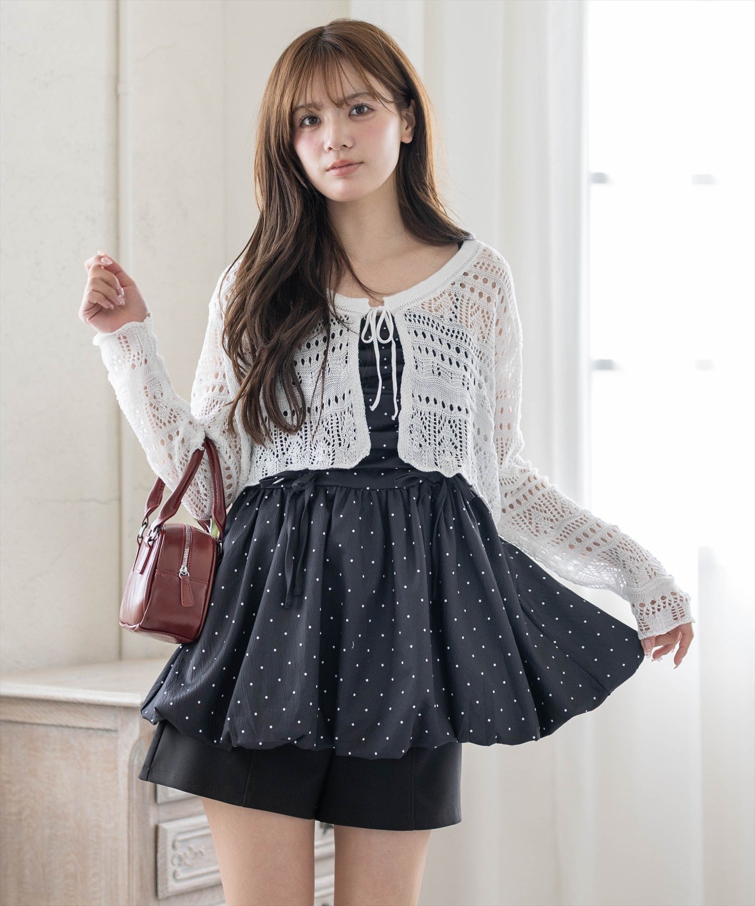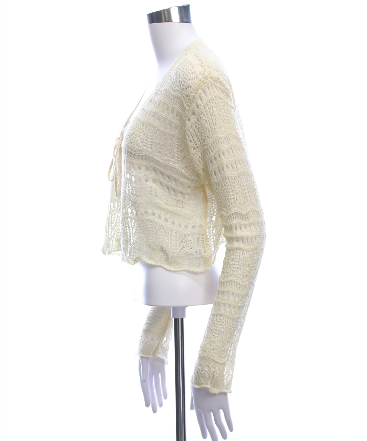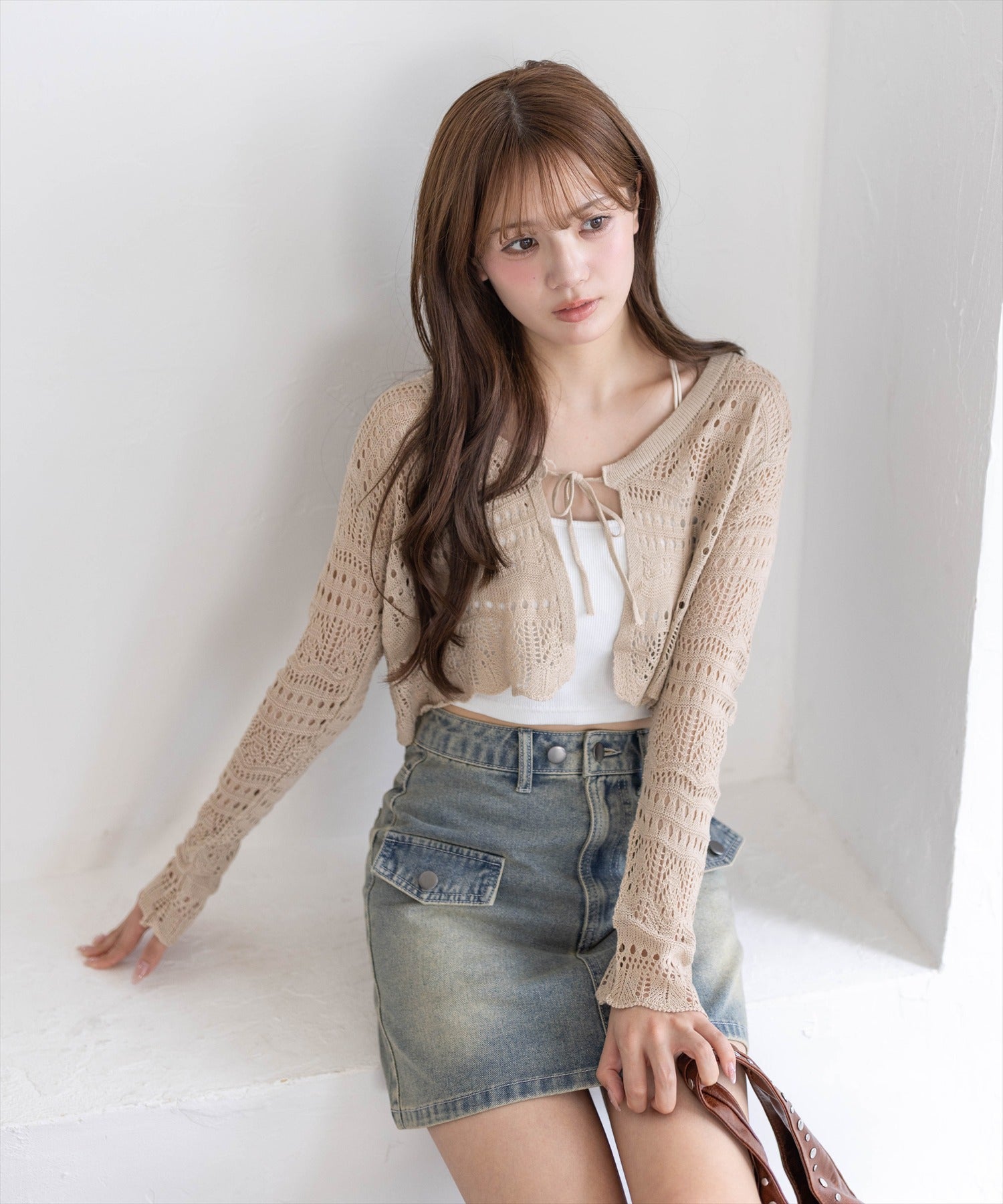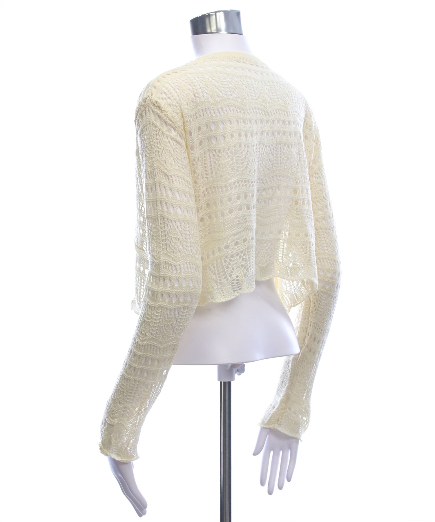 軽く羽織って、ちゃんとおしゃれ!透かし編みニットボレロカーディガン【デザイン】軽やかな透かし編みデザインが魅力のカーディガン。程よい肌見せが叶う編み地で、抜け感のあるスタイリングを演出します◎コンパクトな丈感で、ウエスト位置を高く見せてスタイルアップ効果も♪【コーディネート】フリルミニスカートやプリーツミニスカートと合わせてガーリーコーデに♪キャミワンピースの上に羽織ってフェミニンコーデにも!ワイドデニムやストレートデニムと合わせて大人カジュアルなコーデも可愛いです◎
