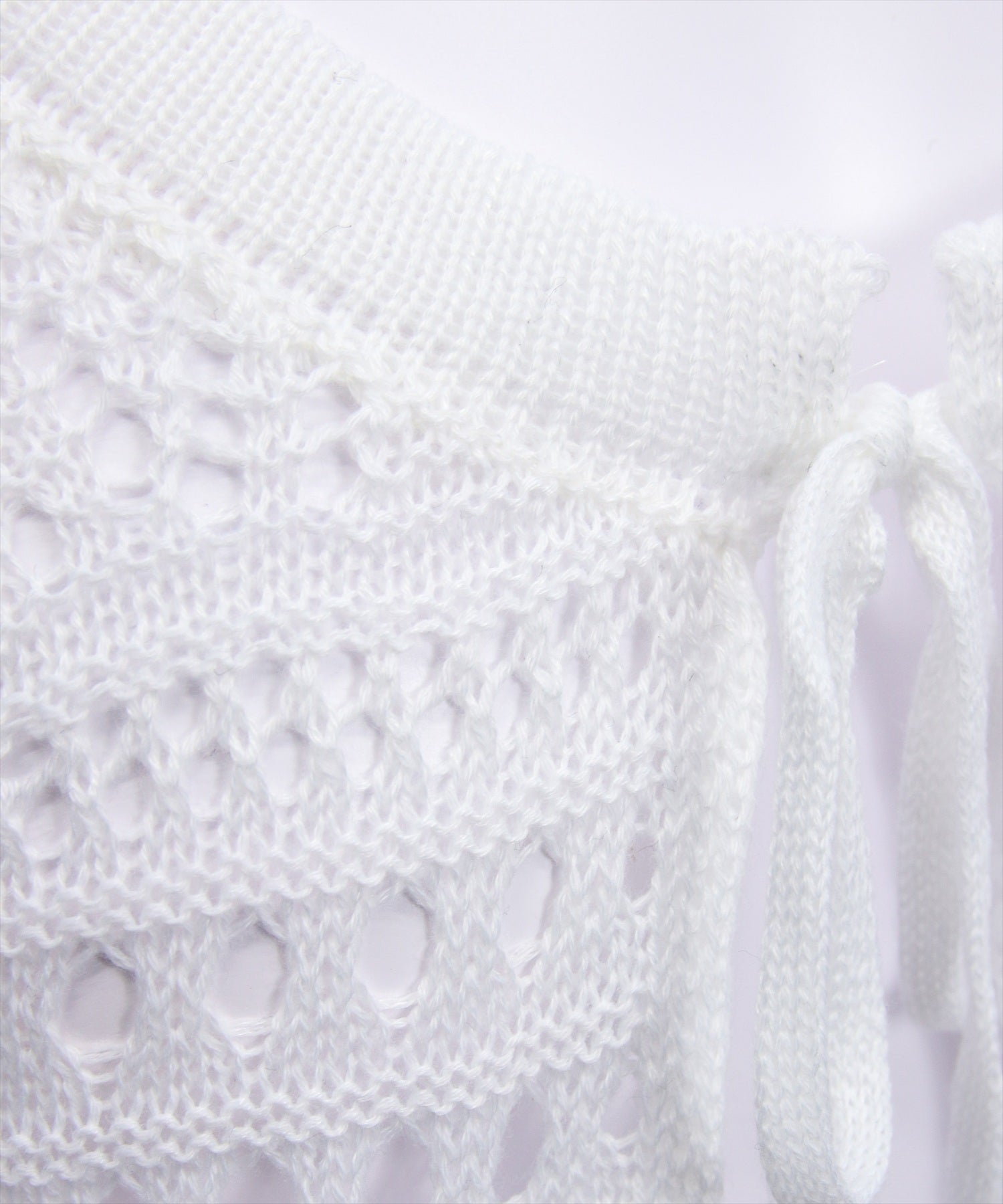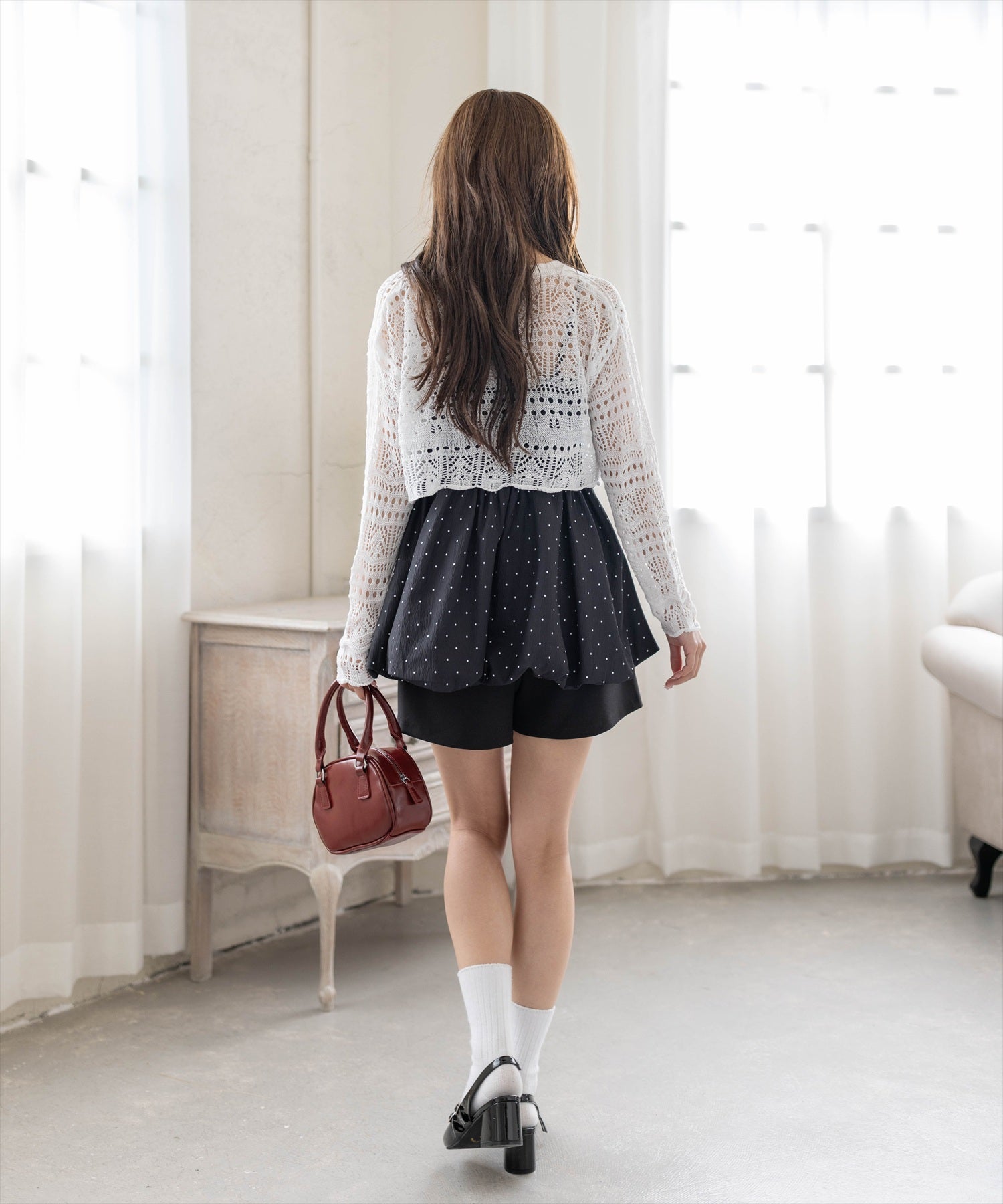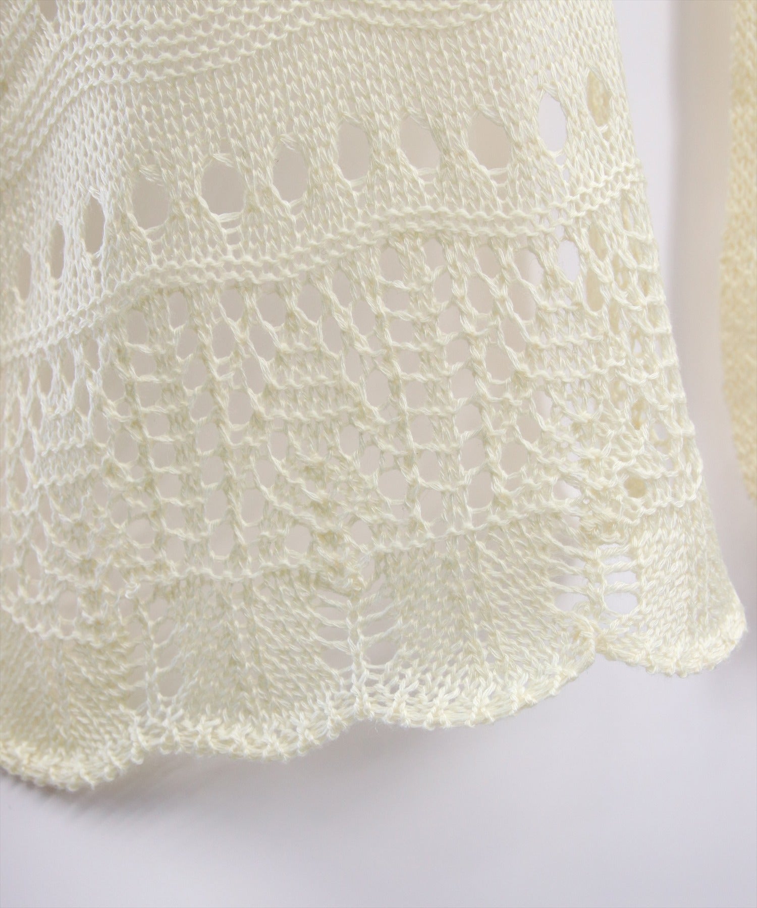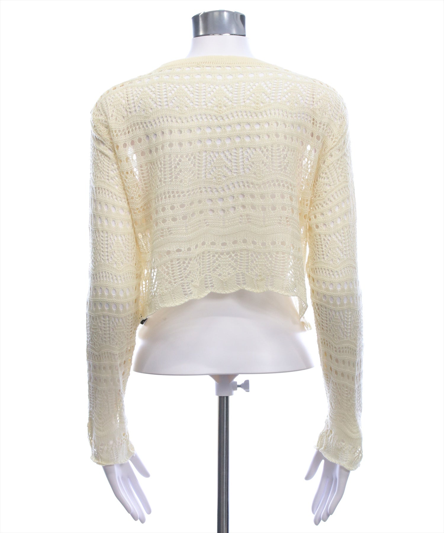 軽く羽織って、ちゃんとおしゃれ!透かし編みニットボレロカーディガン【デザイン】軽やかな透かし編みデザインが魅力のカーディガン。程よい肌見せが叶う編み地で、抜け感のあるスタイリングを演出します◎コンパクトな丈感で、ウエスト位置を高く見せてスタイルアップ効果も♪【コーディネート】フリルミニスカートやプリーツミニスカートと合わせてガーリーコーデに♪キャミワンピースの上に羽織ってフェミニンコーデにも!ワイドデニムやストレートデニムと合わせて大人カジュアルなコーデも可愛いです◎