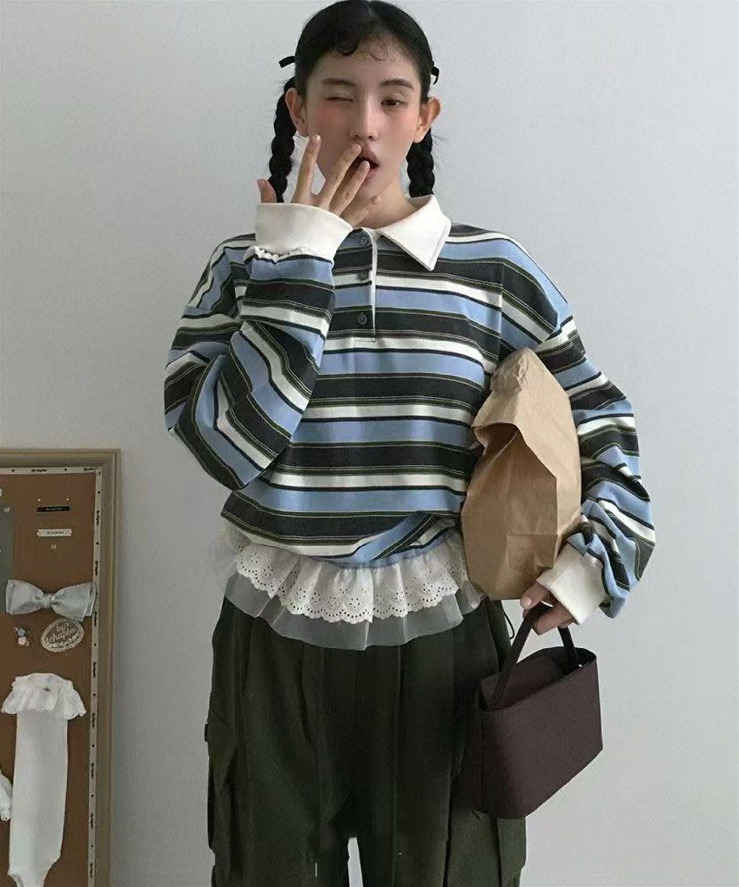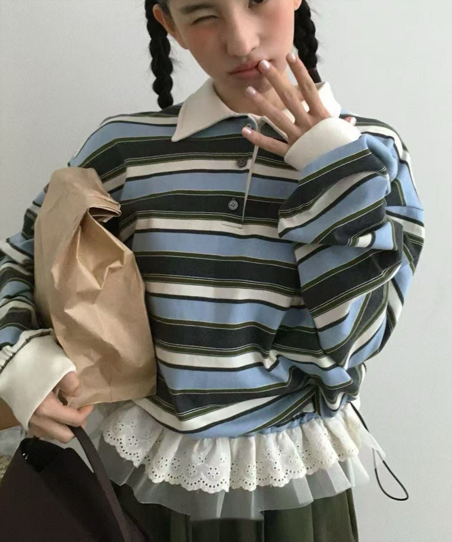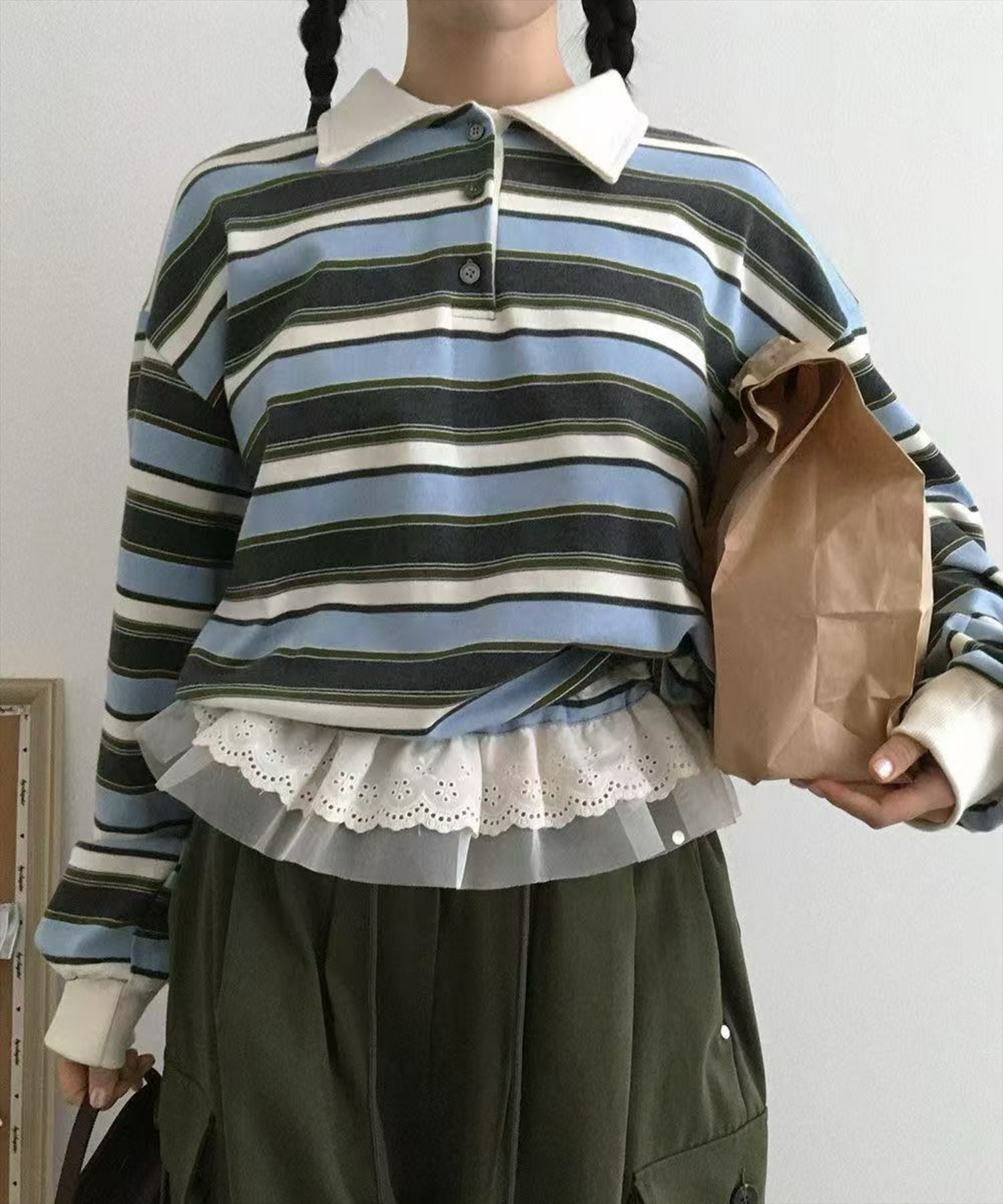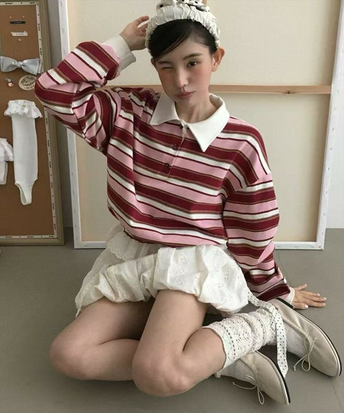 甘さとカジュアルを両立した!レースボーダー長袖ポロシャツ