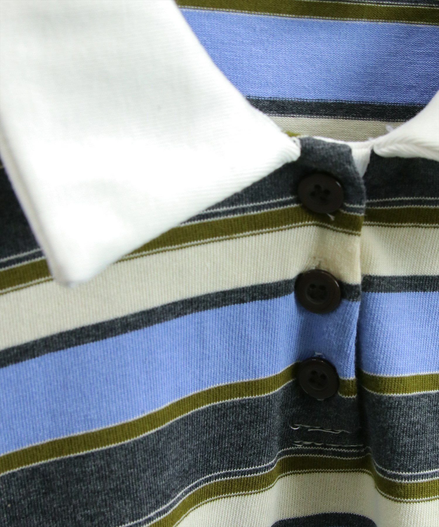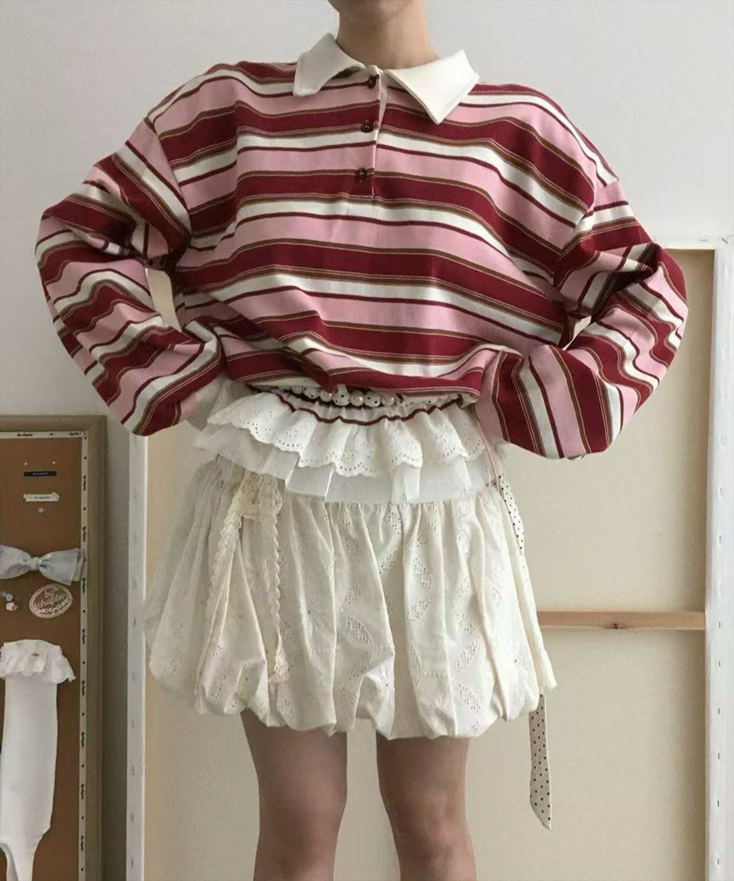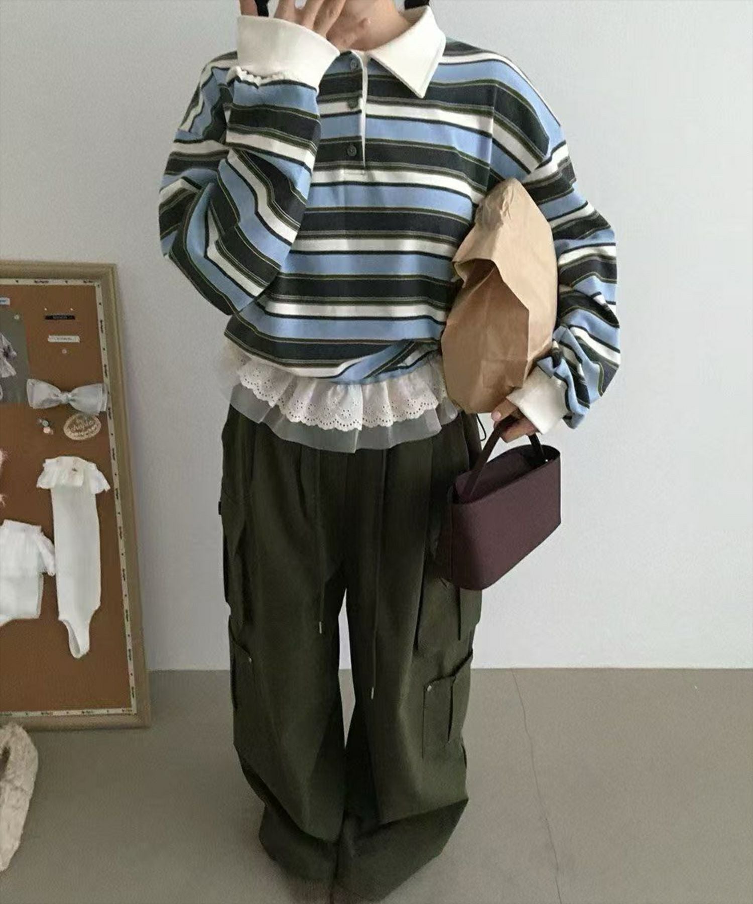 甘さとカジュアルを両立した!レースボーダー長袖ポロシャツ