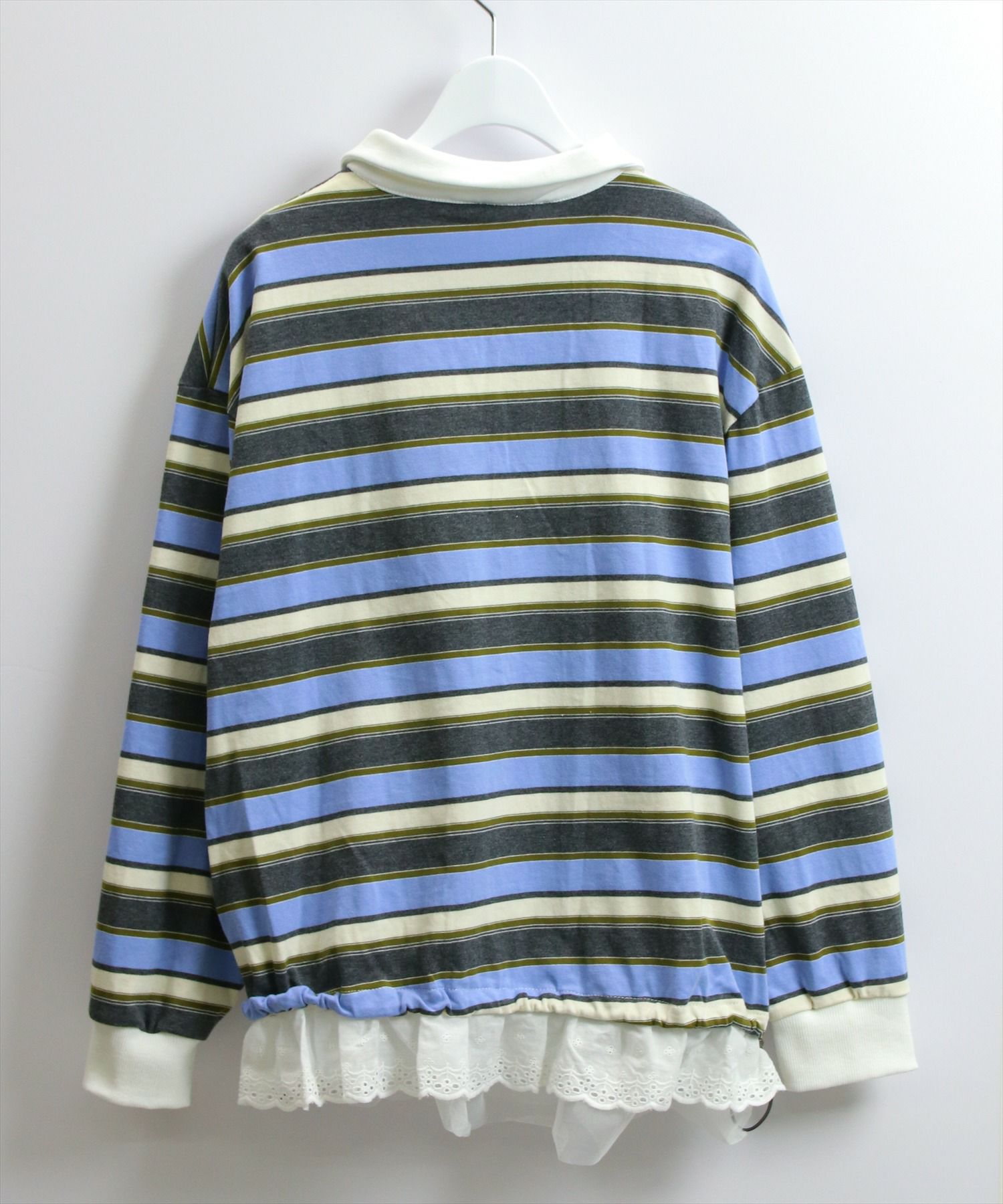 ボーダー柄のポロシャツに、裾のレースデザインを組み合わせた大人可愛い遊び心のあるデザインの一枚です。レースをつけることで、カジュアルな中にも女性らしさをプラスします。裾のドローストリングでシルエット調整ができ、着こなしに合わせて印象を変えられるアイテムです。